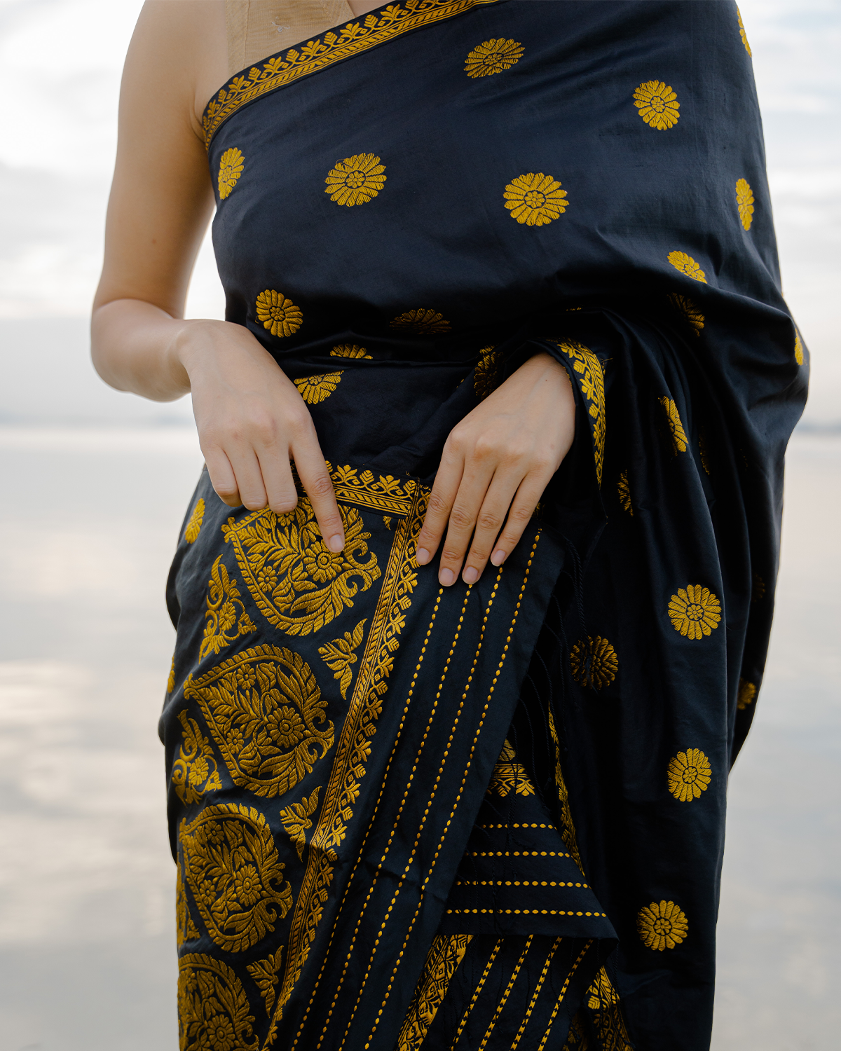 Symbolising boundless confidence, our Aadi black-gold paat/mulberry silk mekhela sador is a journey of eternal elegance on every occasion.