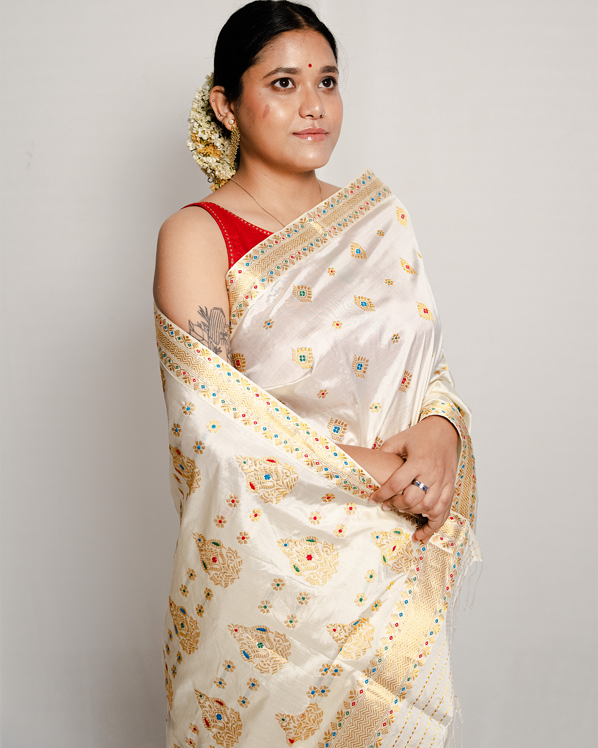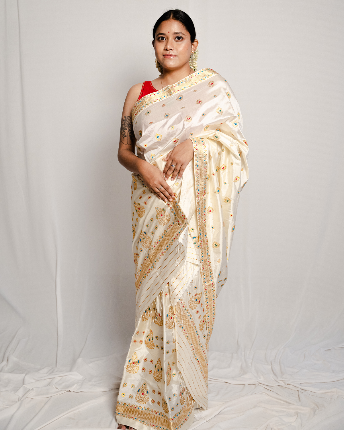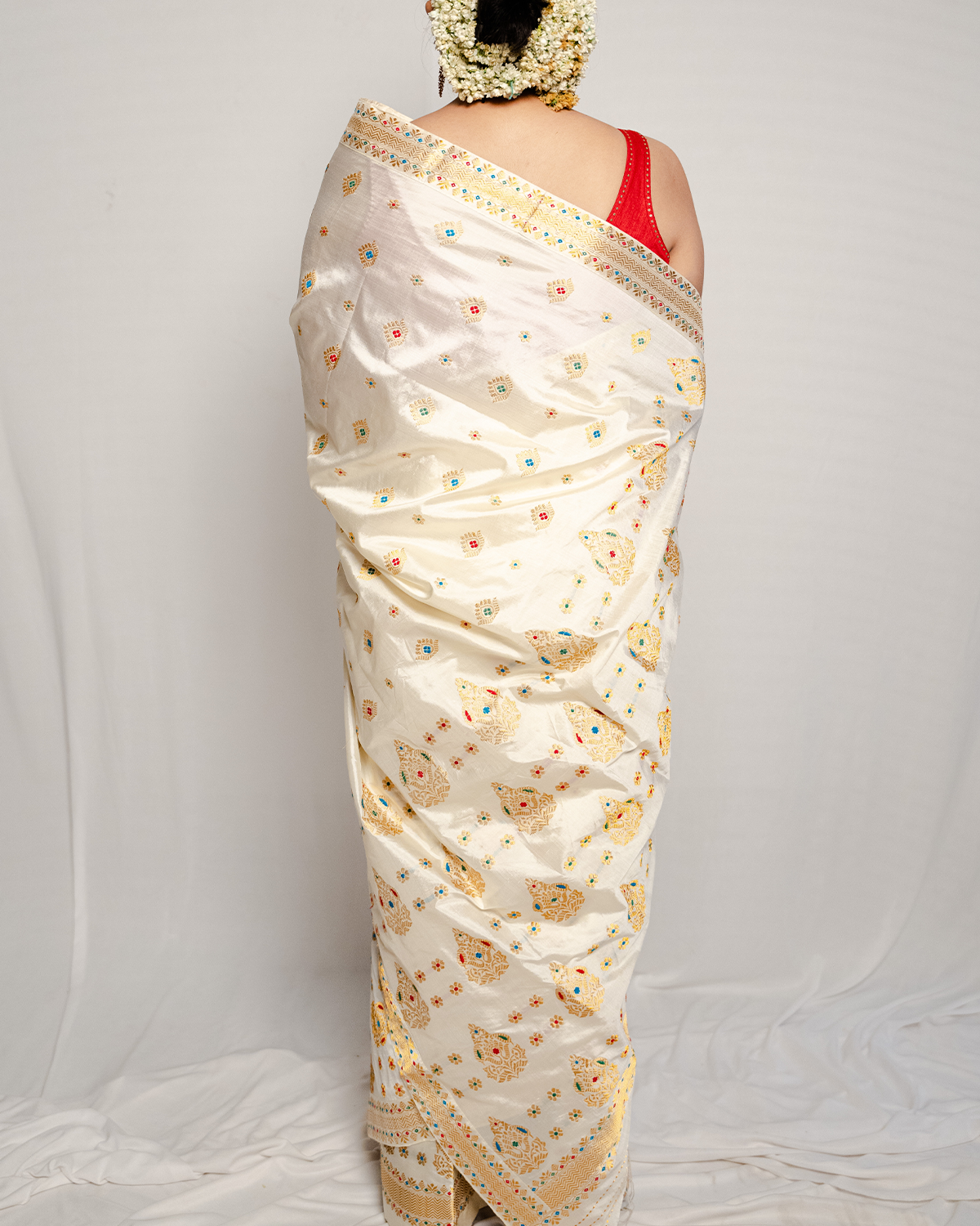 Fierce and fabulous, our Adaya wedding white-gold paat/mulberry silk mekhela sador, bordered with kakhori of criss-cross chain motifs along with kingkhap buta and circular buta with golden guna with red, green and blue meena work is an absolute work of perfection!
