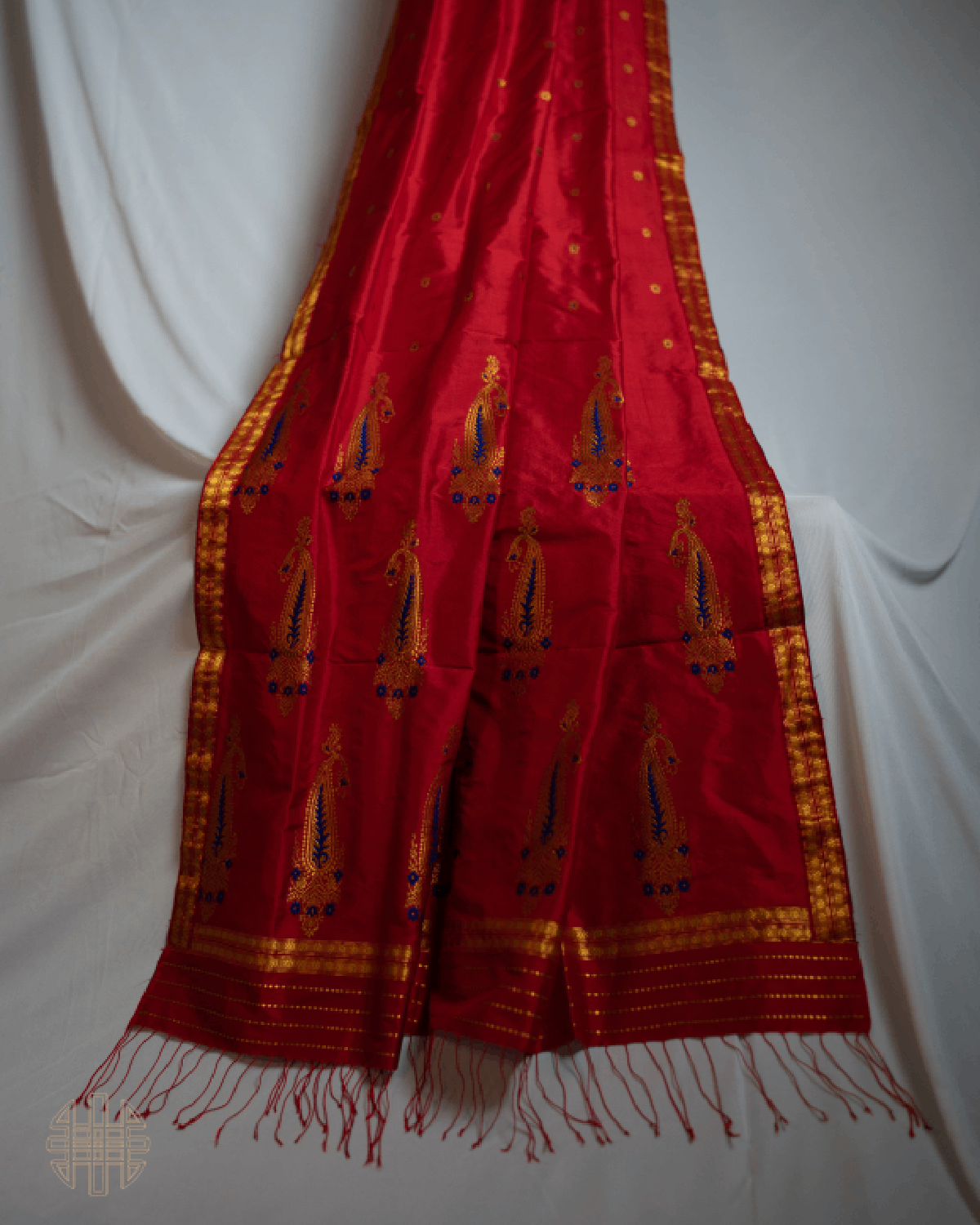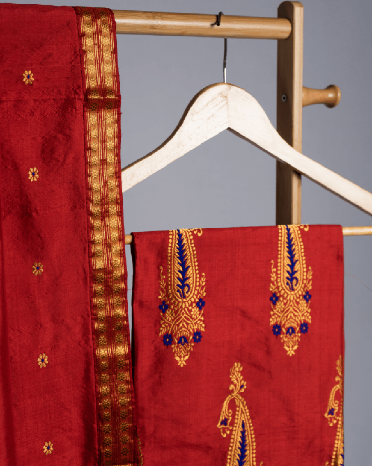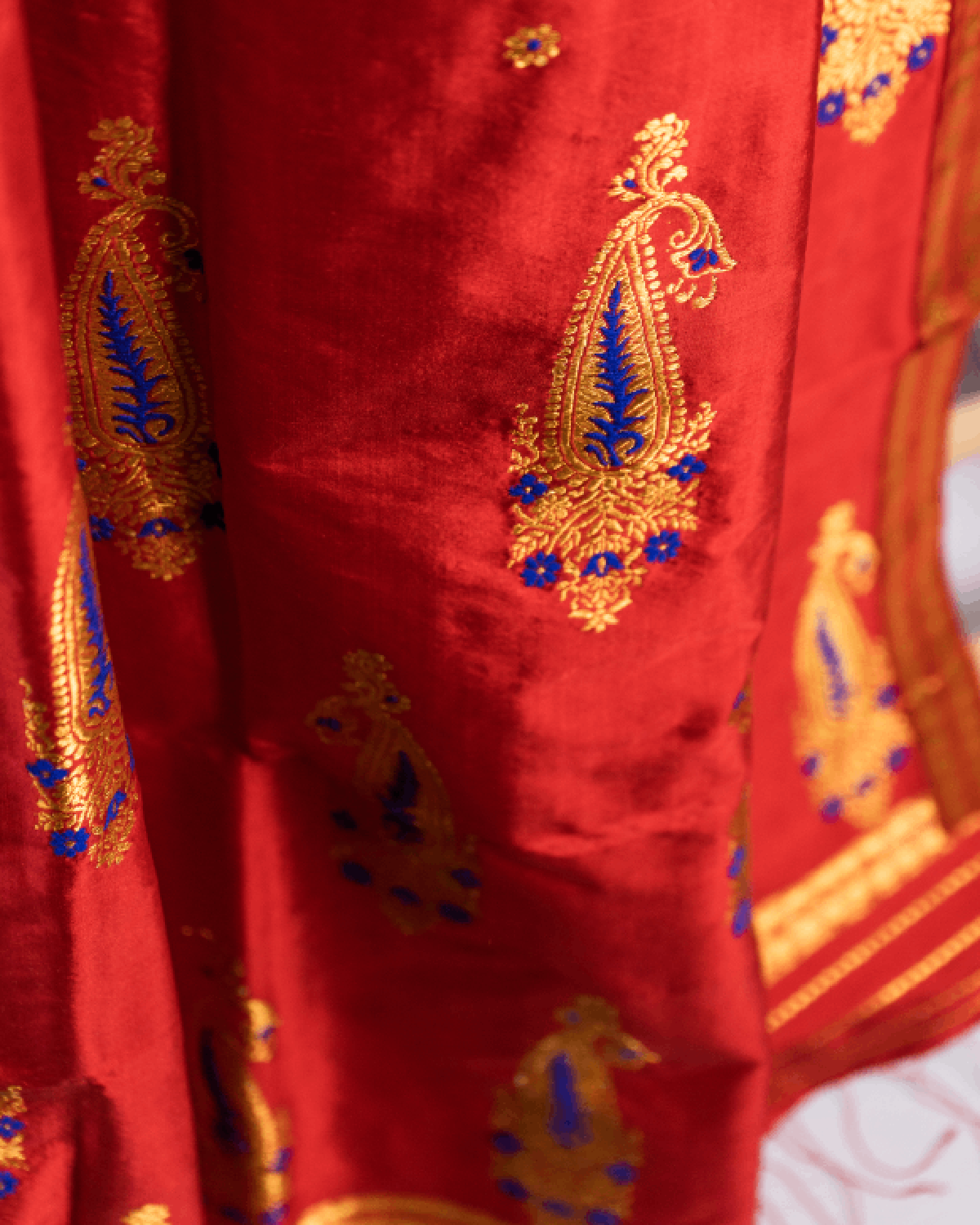 | Don’t store the mekhela sador in a plastic cover as this will cause the gold embroidery to turn black. |