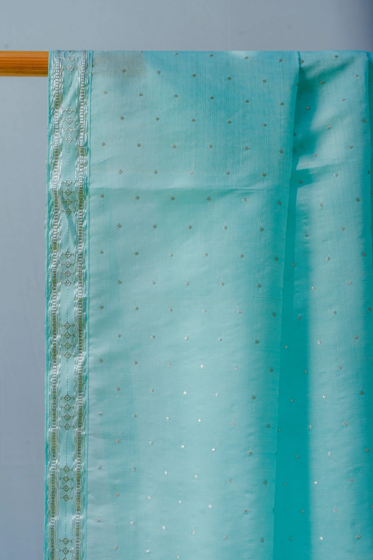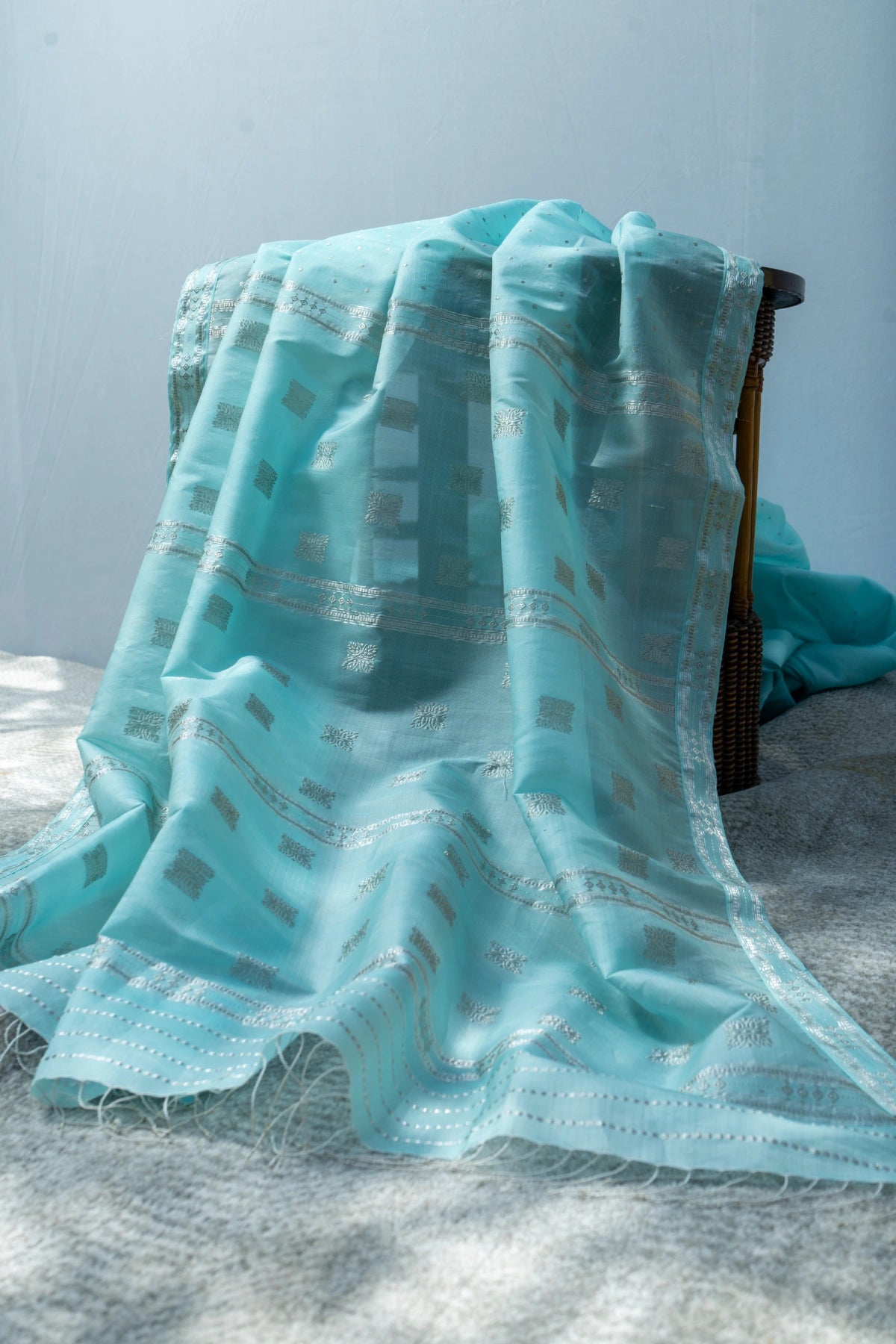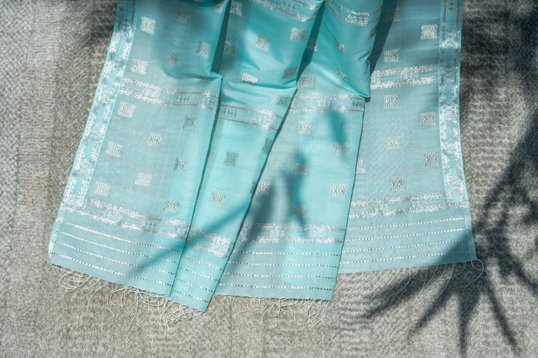 Airo’s soft pastel blue is delicate and royal, with boxy floral motifs and a sleek kaxhori border that gives it just the right edge.