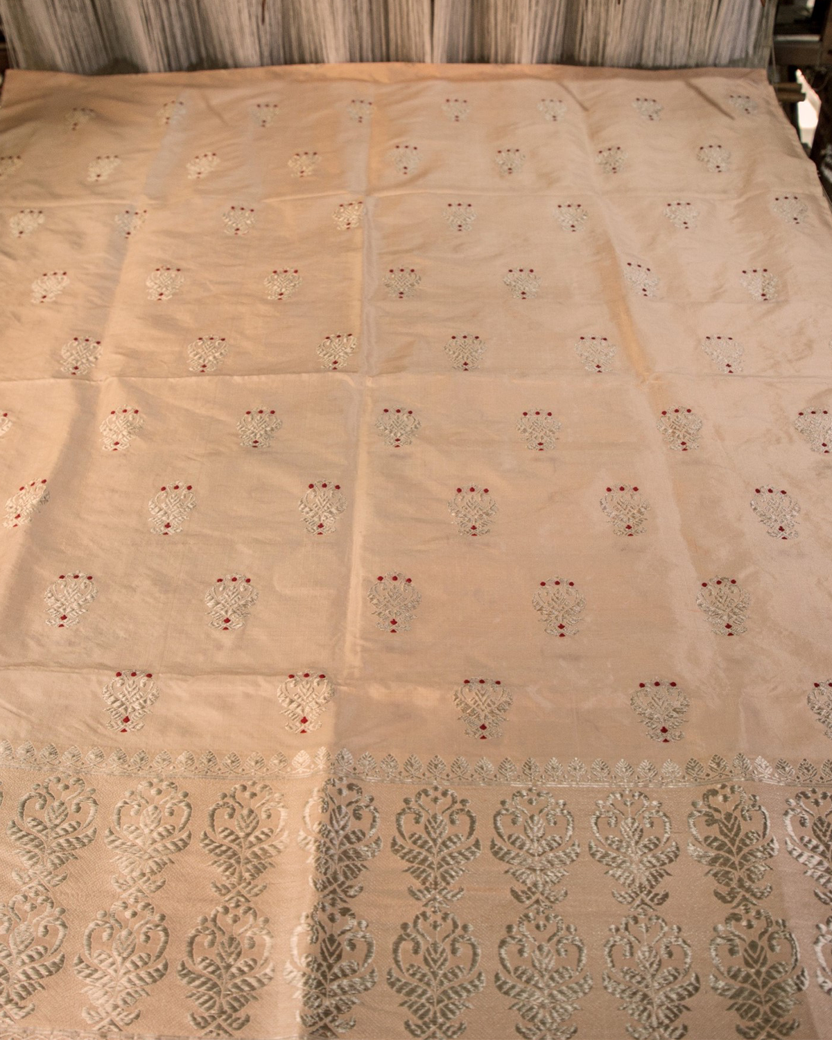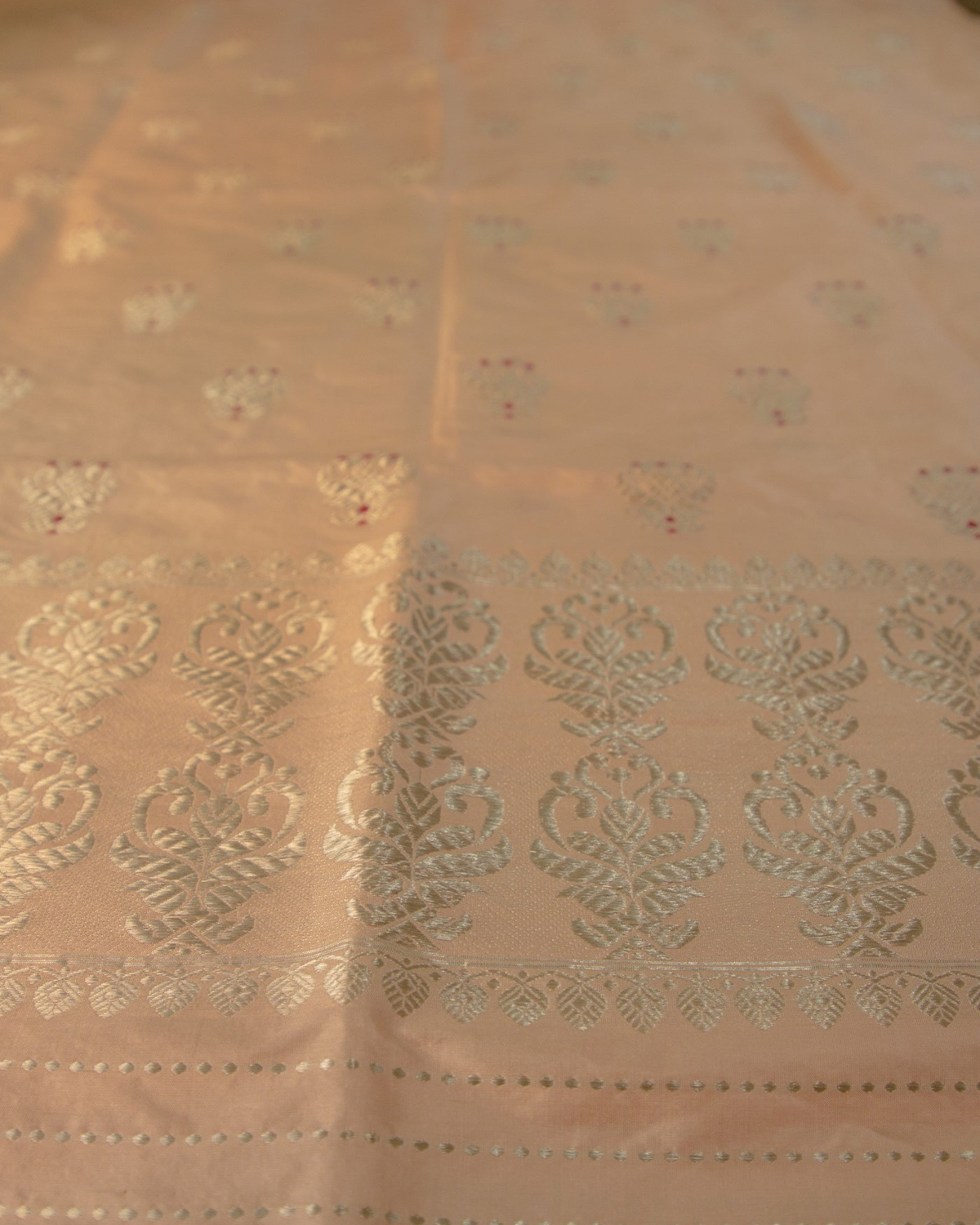 Presenting a perfect blend of traditional and modernity, with a touch of royal sweetness with our Aita peach-silver paat silk mekhela sador, simply adorned with silver guna motifs all over. On the border, we have gos Phool motif, gos buta and red Meena work that adds to the timeless elegance of the heirloom piece! This beautiful piece of mekhela sador simply reflects the passing history from generation to generation with impeccable love and care.