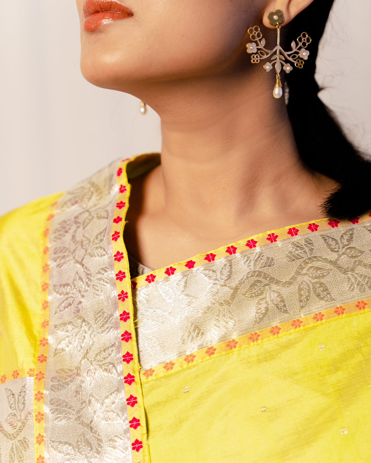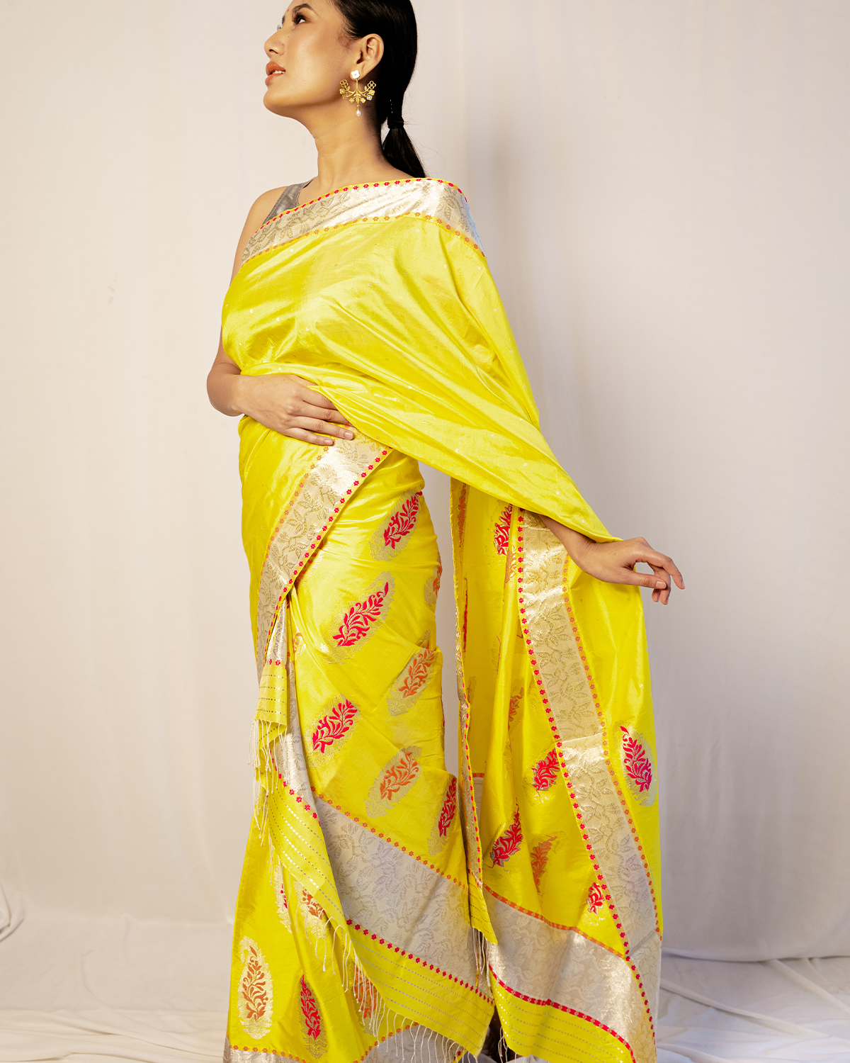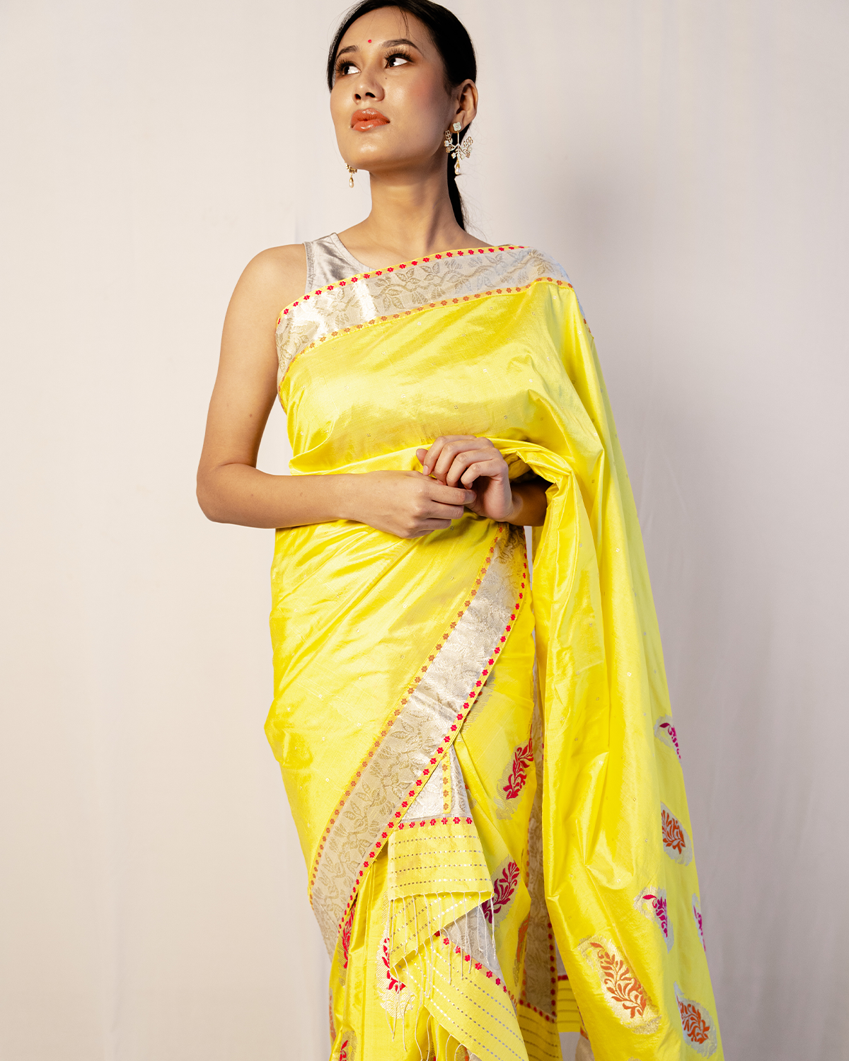 Making a vibrantly rich statement, our Aiyana bright yellow-coloured paat/mulberry silk mekhela sador is the perfect representation of Assam’s liveliness.
