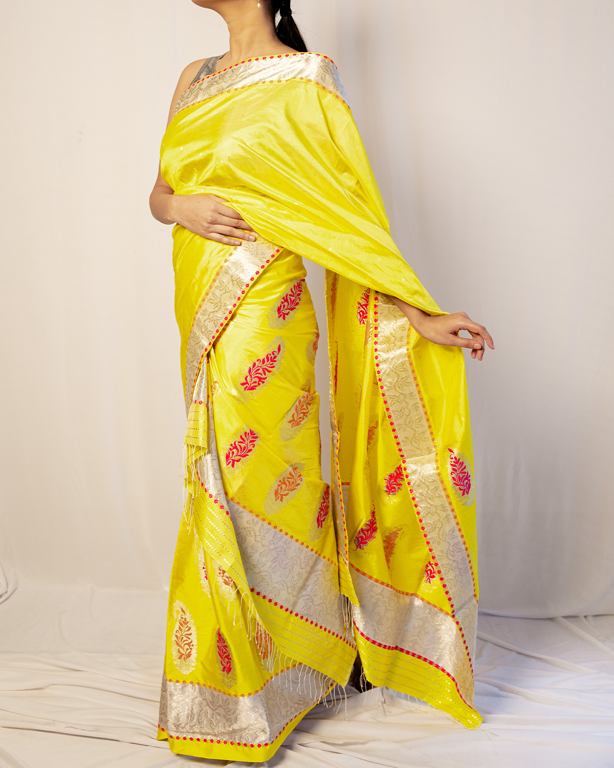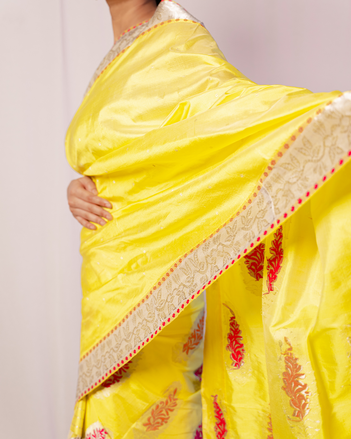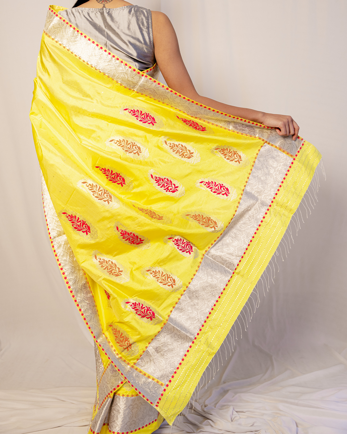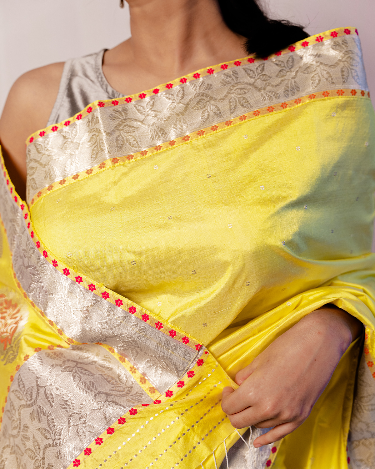 Making a vibrantly rich statement, our Aiyana bright yellow-coloured paat/mulberry silk mekhela sador is the perfect representation of Assam’s liveliness.