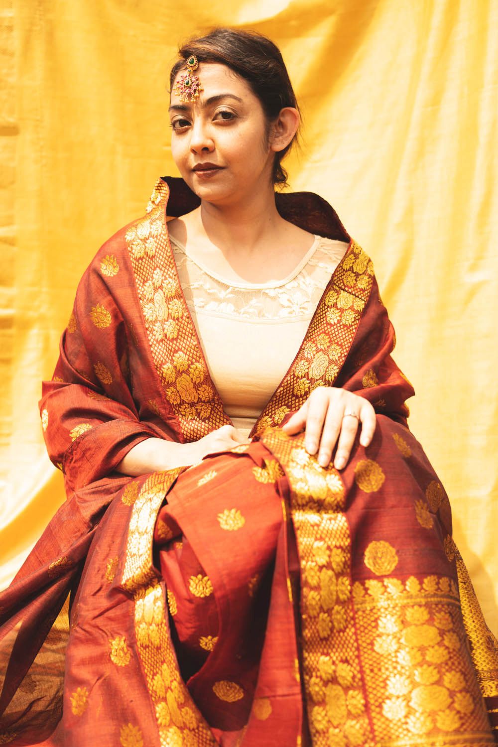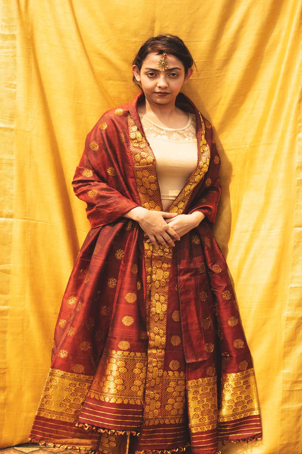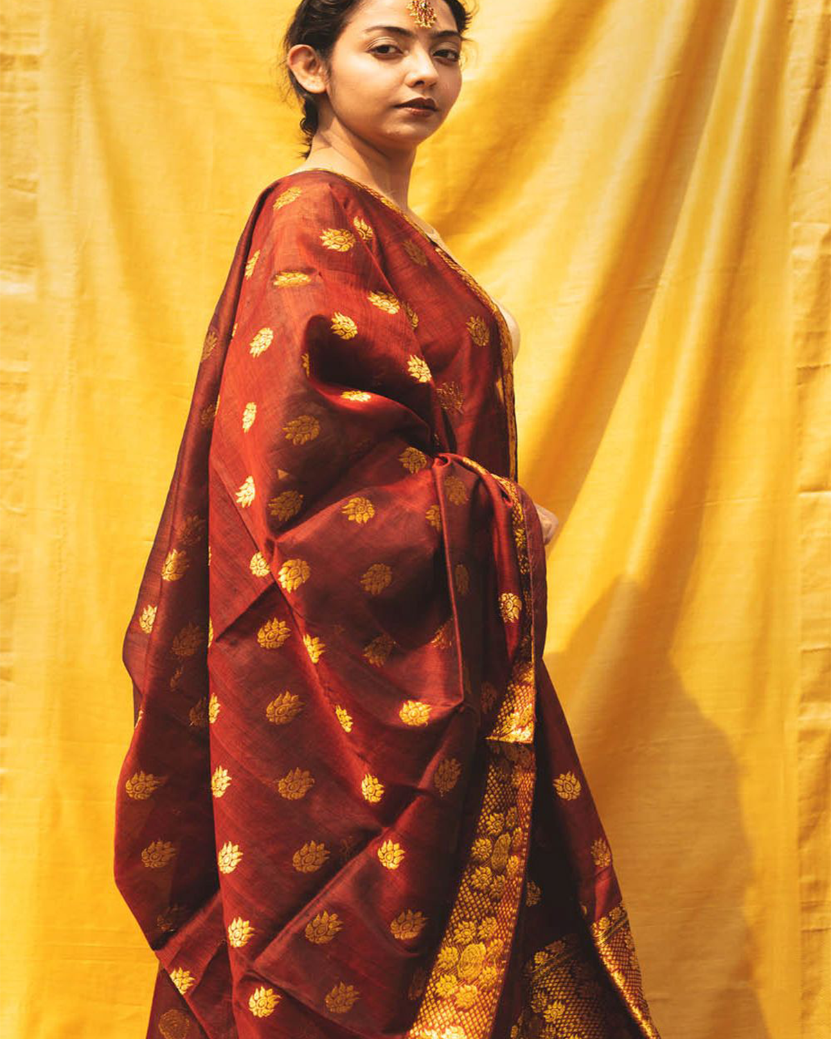 Handwoven beautifully, our Ajooni maroon kesa paat silk mekhela sador in an endearing shade of brown is enhanced with gorgeous gul design motifs on the border and overall body.