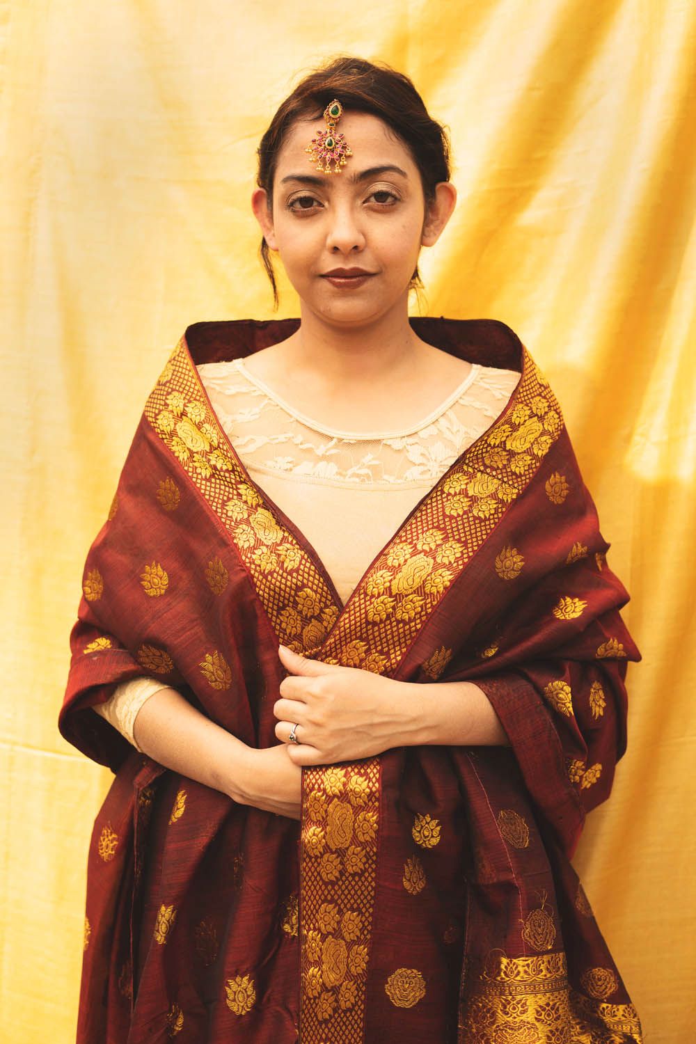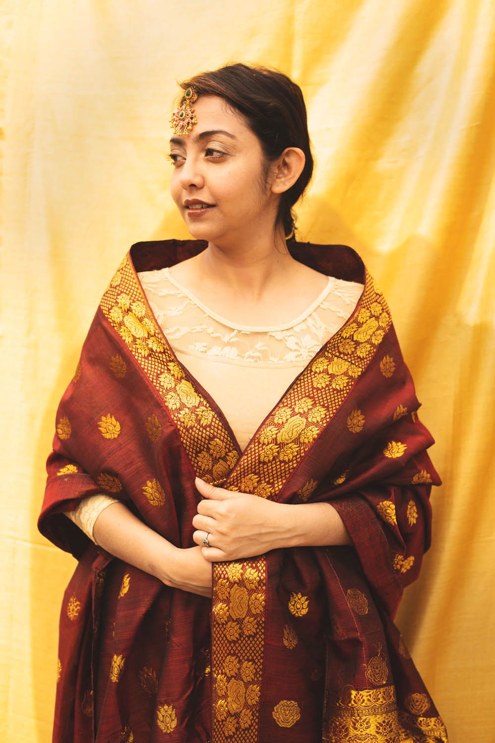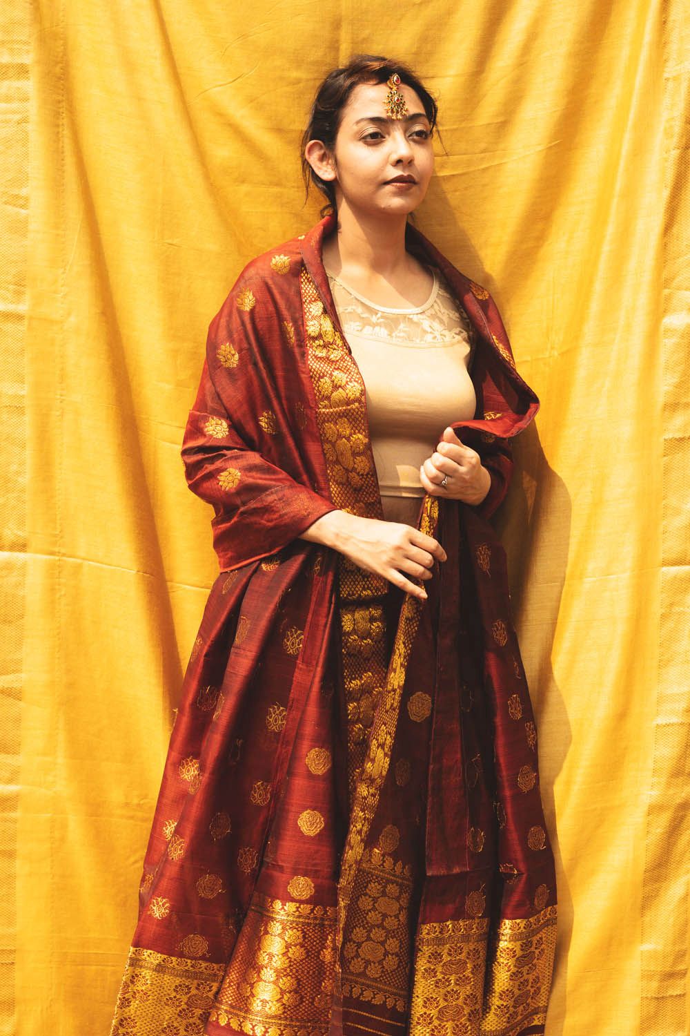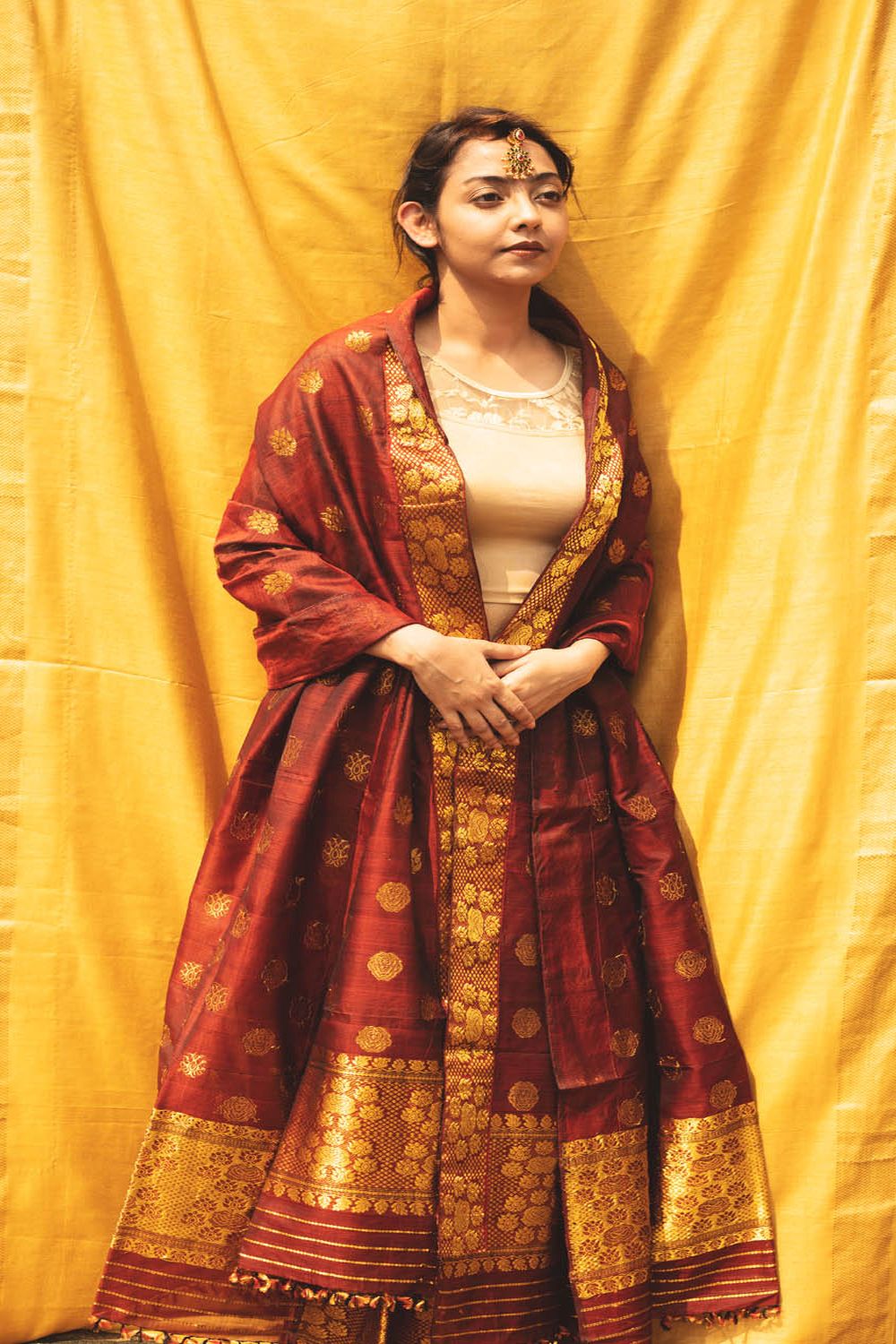 Handwoven beautifully, our Ajooni maroon kesa paat silk mekhela sador in an endearing shade of brown is enhanced with gorgeous gul design motifs on the border and overall body.