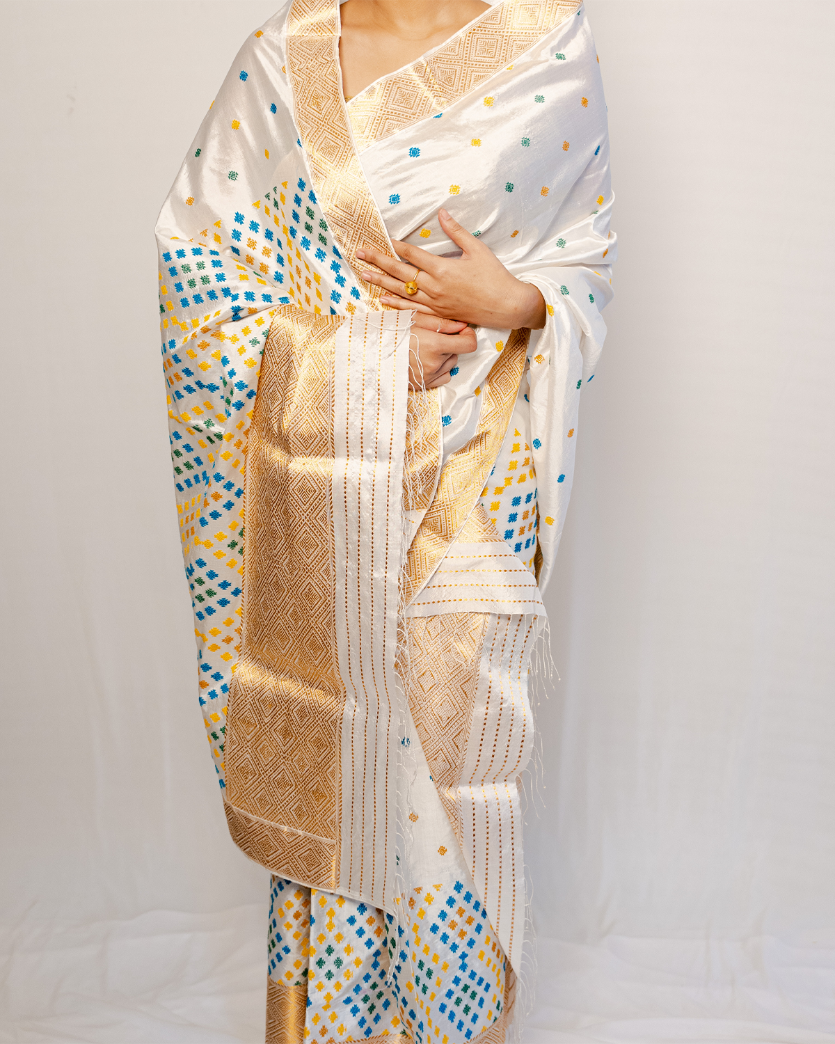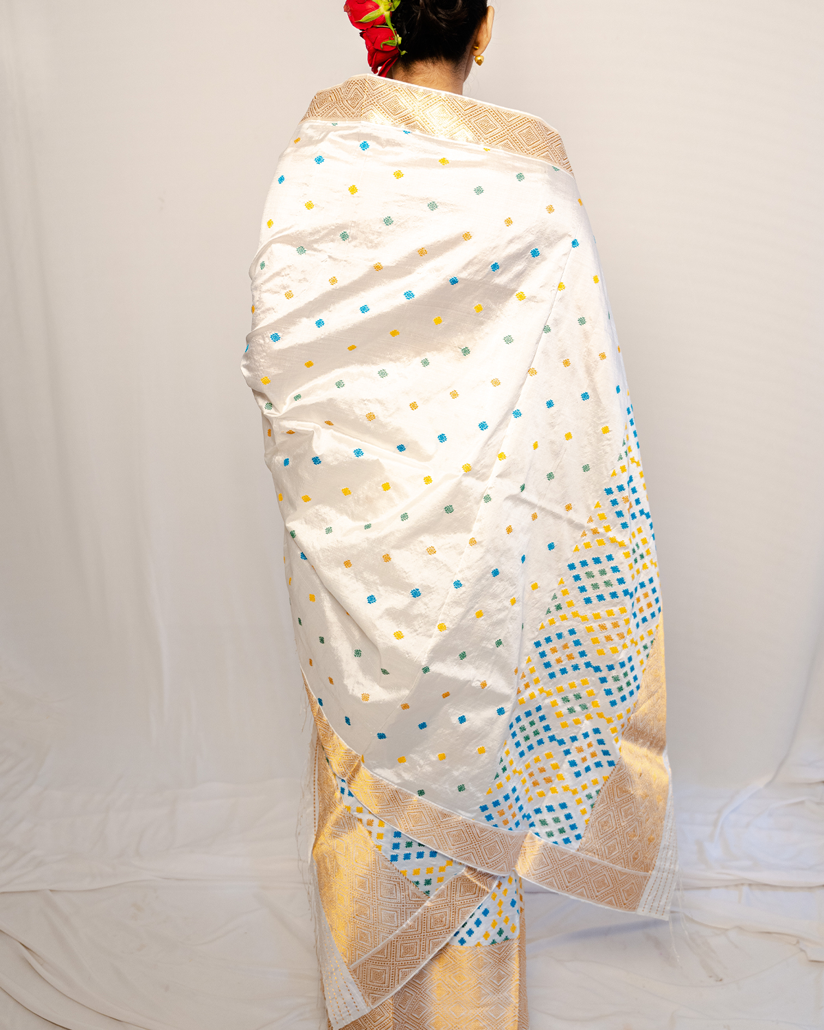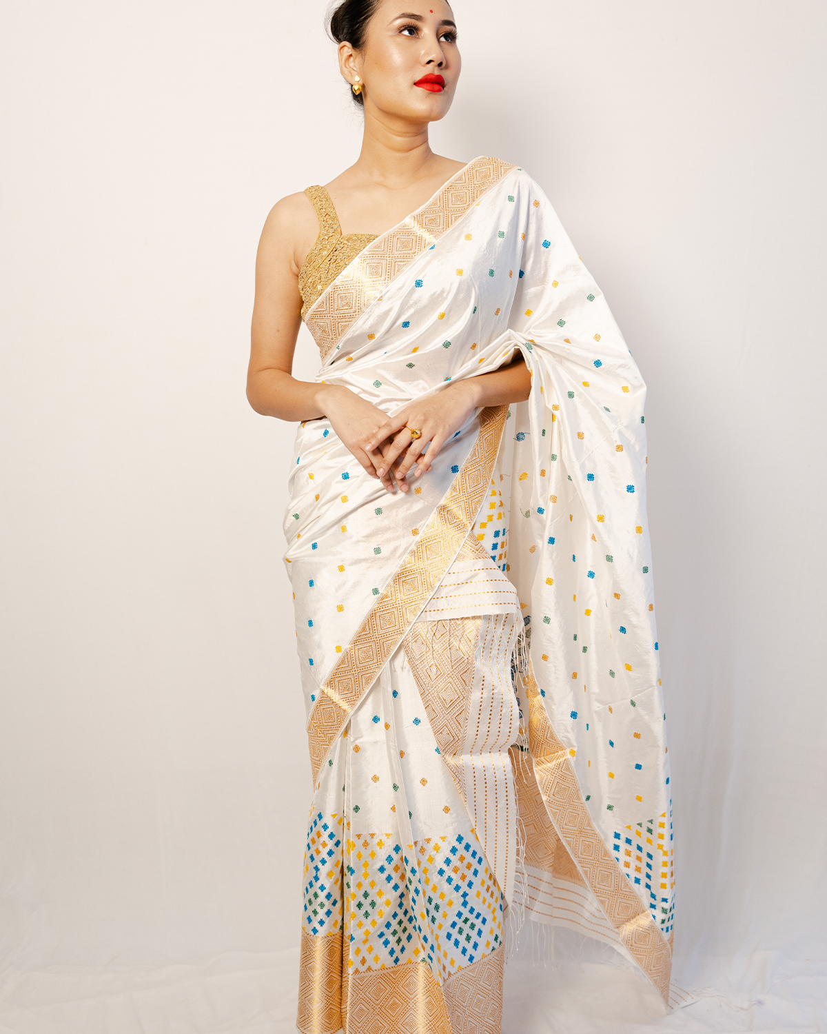 Weaved in a calming shade of white is our gorgeous Aruvi paat/mulberry silk mekhela sador.