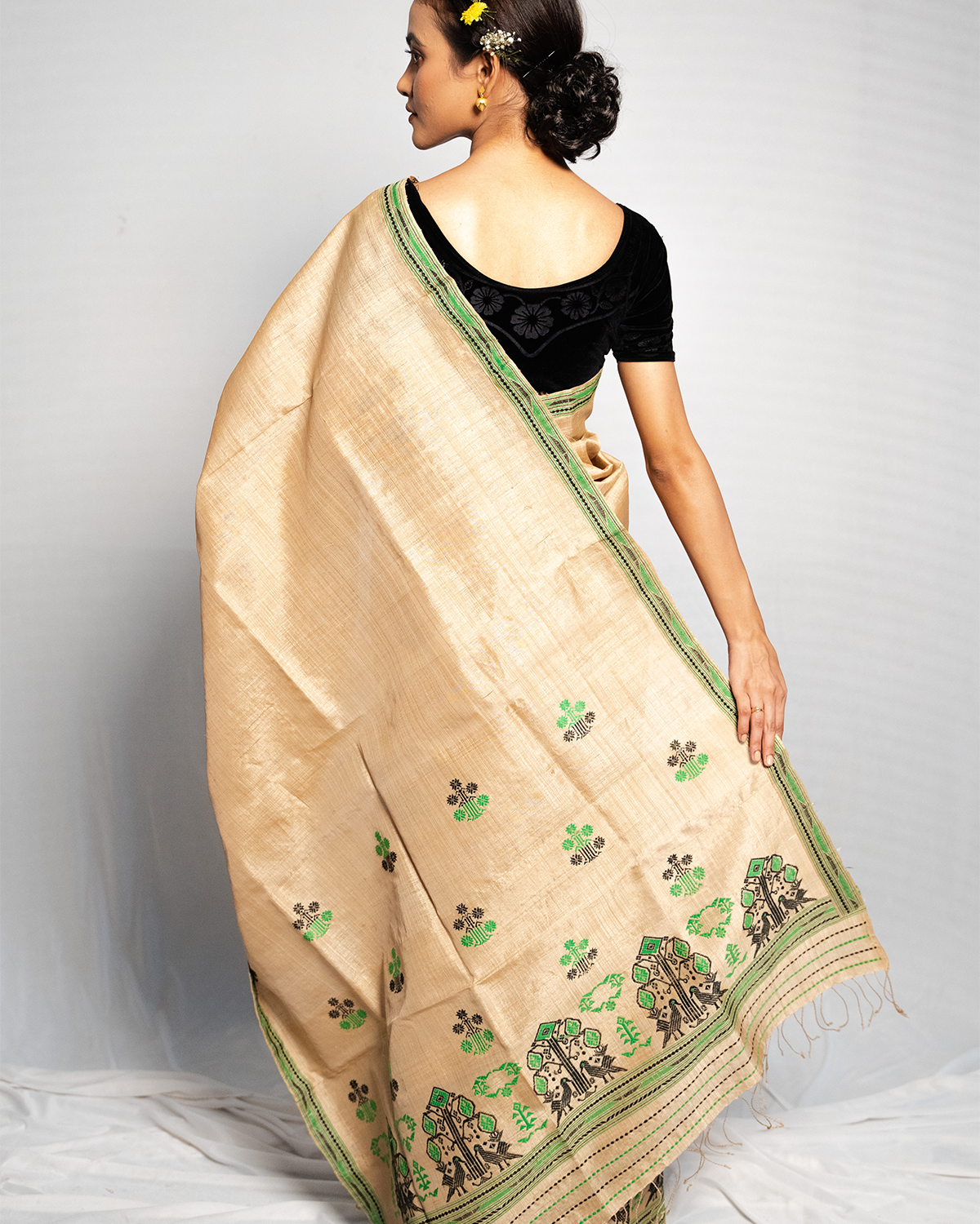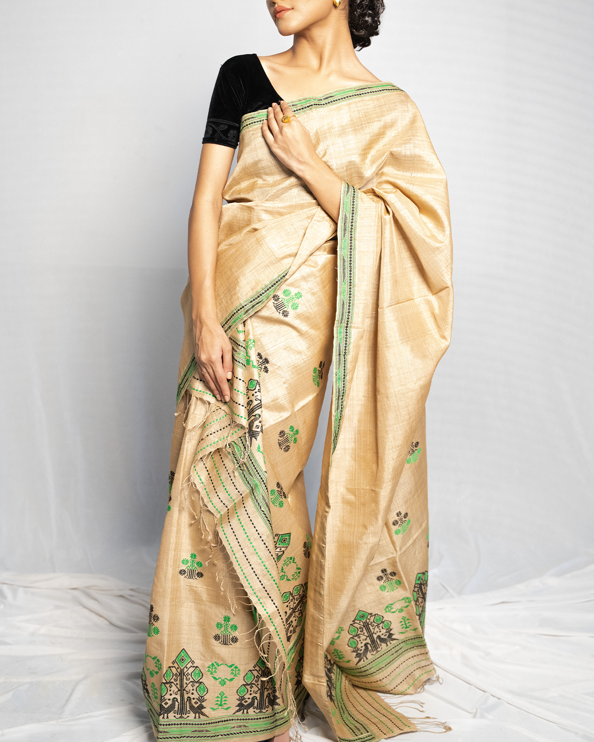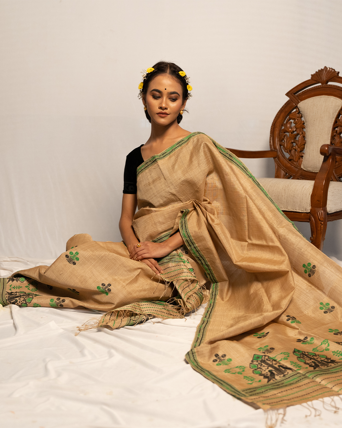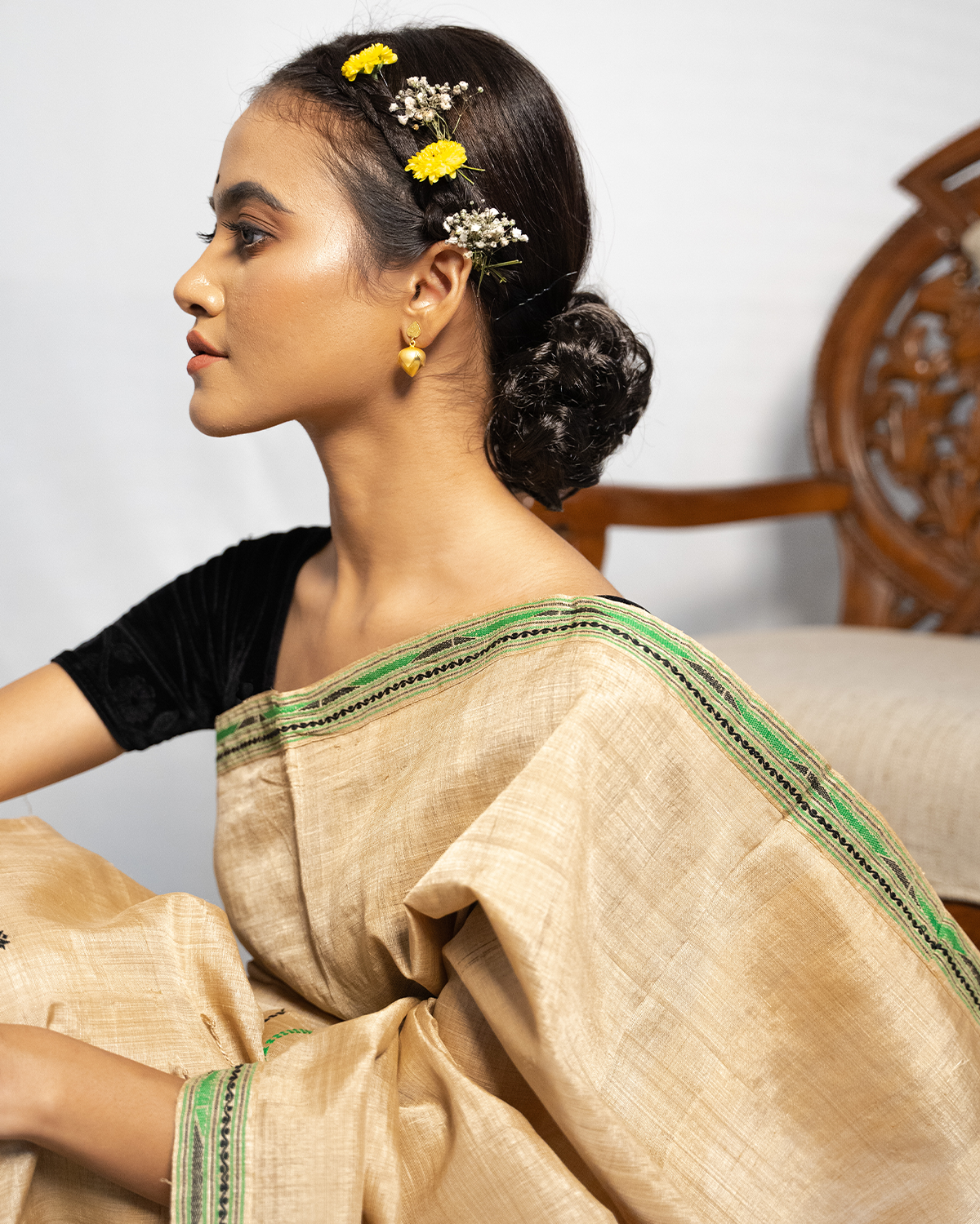 Handwoven in an unusual, classy earthy tone and embellished with Assam’s traditional Sorai miri motif with a cash border of green & black thread, this luxuriously designed Avani wheat-brown muga mekhela sador is a guaranteed show stealer for all celebratory events!