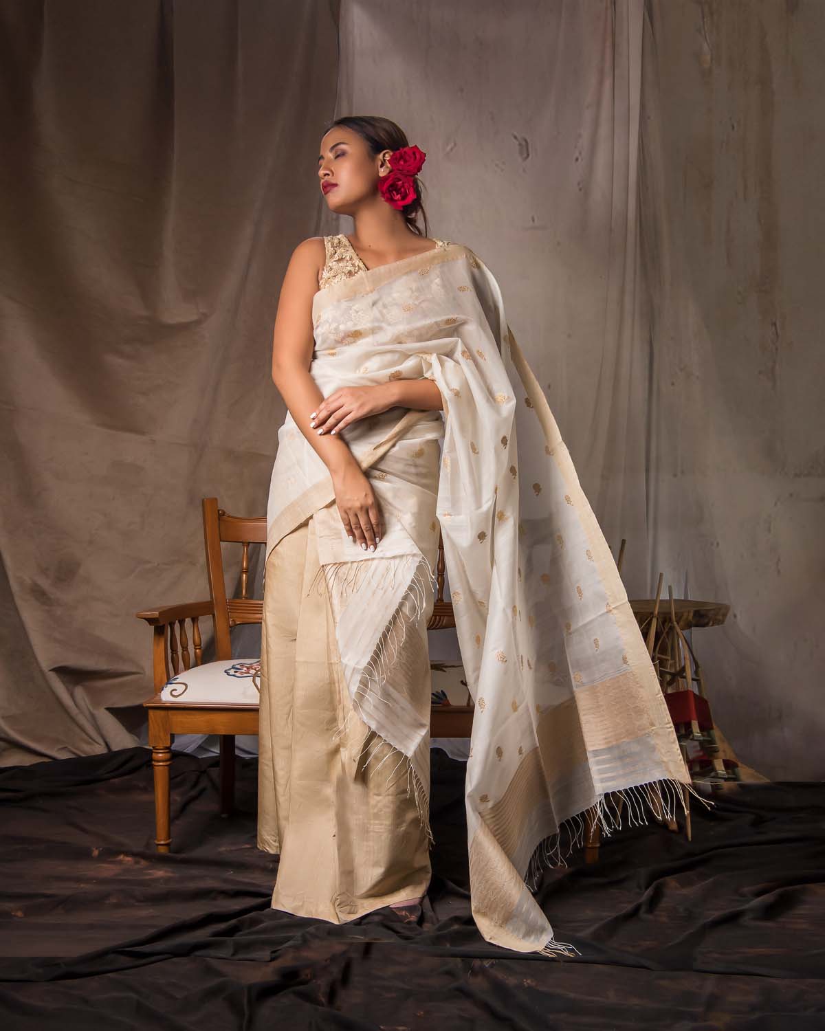 Assamese sadors are incomplete without buta and handcrafted designs. Gul butas, kolka designs are all a soul of Assamese sadors that makes mekhela sadors worth it. This Muga aasu bordered kesa paat sador with symmetrical Assamese cash designed buta borders and small floral buta all over sador are a subtle combination that gives you a sober look to your appearance.