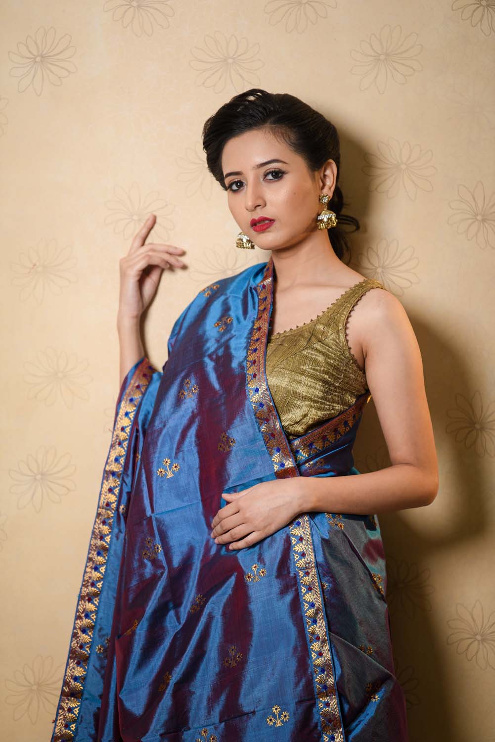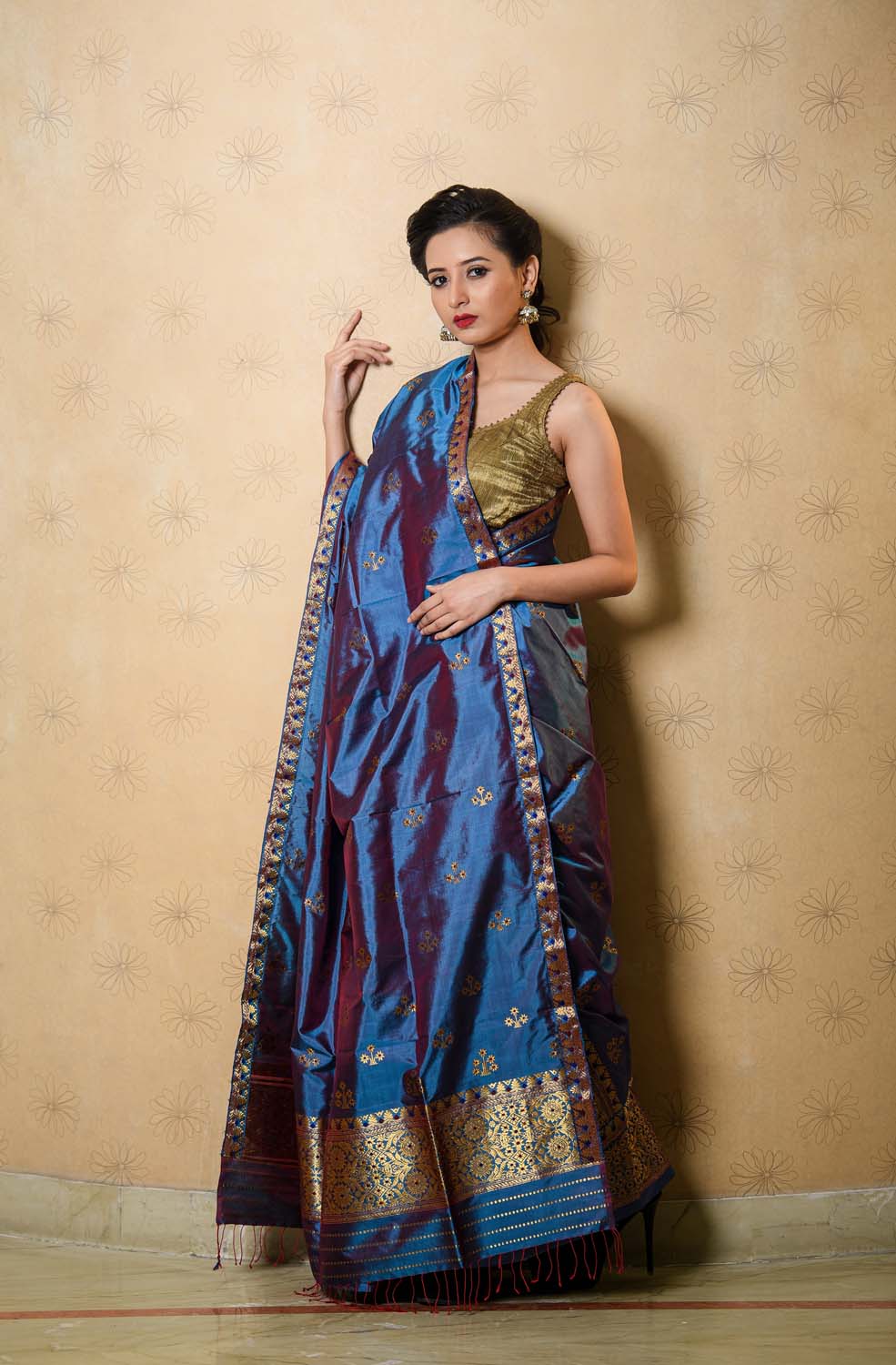 Preserving the handloom heritage and retaining the authenticity of Assam and its values, our luxuriously splendid blue colored chaaya paat silk mekhela sador, inspired by our Aita’s traditionally routed riha design with a pinch of red sheene and goa buta detailing is a perfect pick for traditional events, festivities and family get-together.