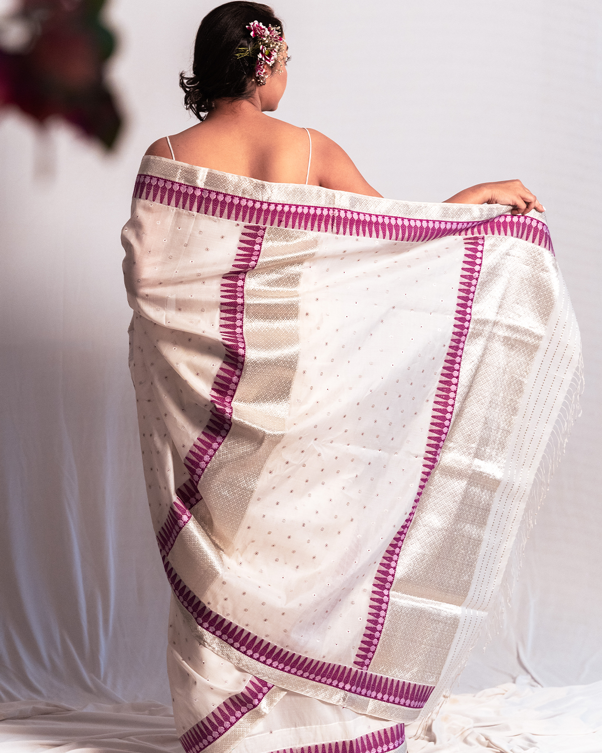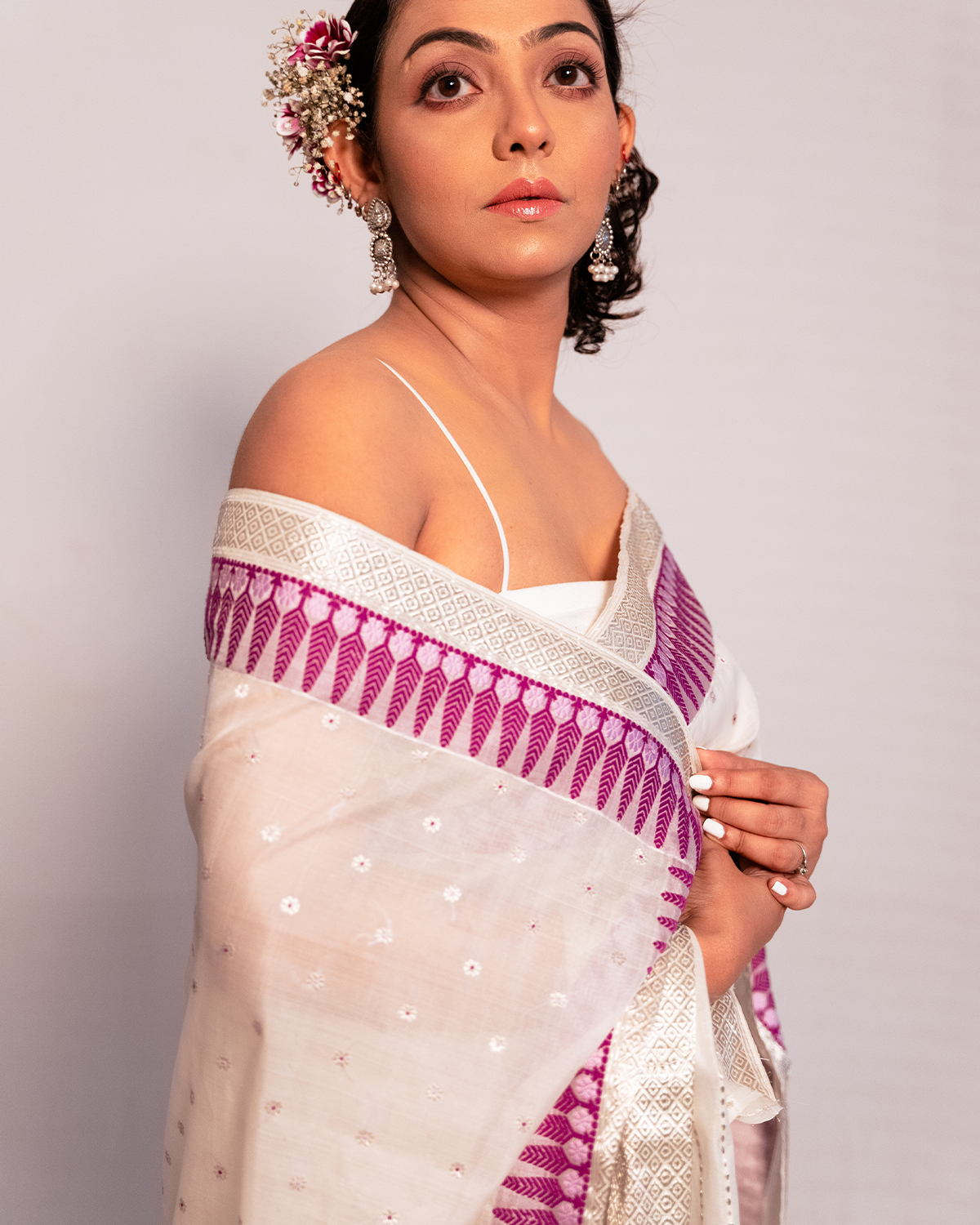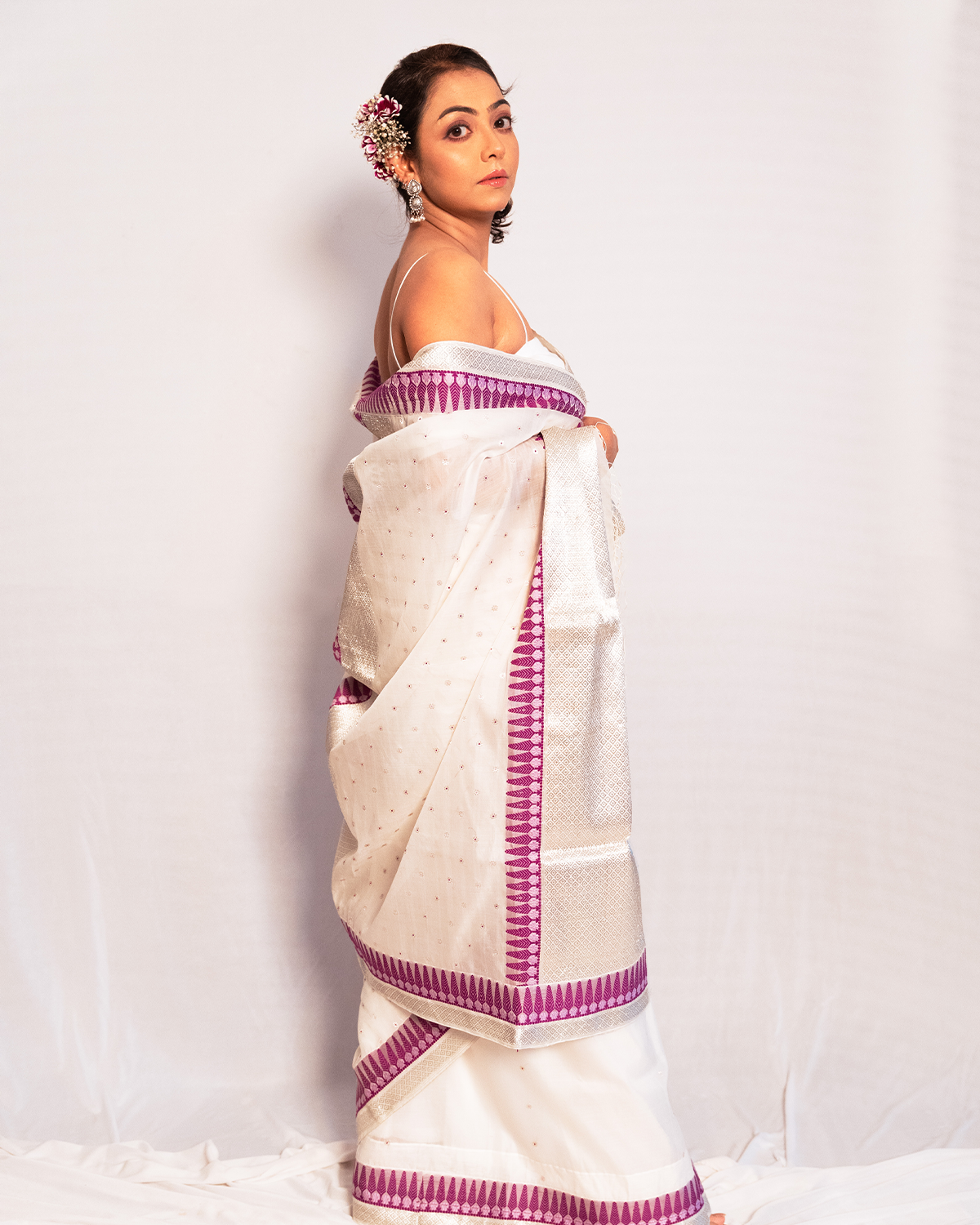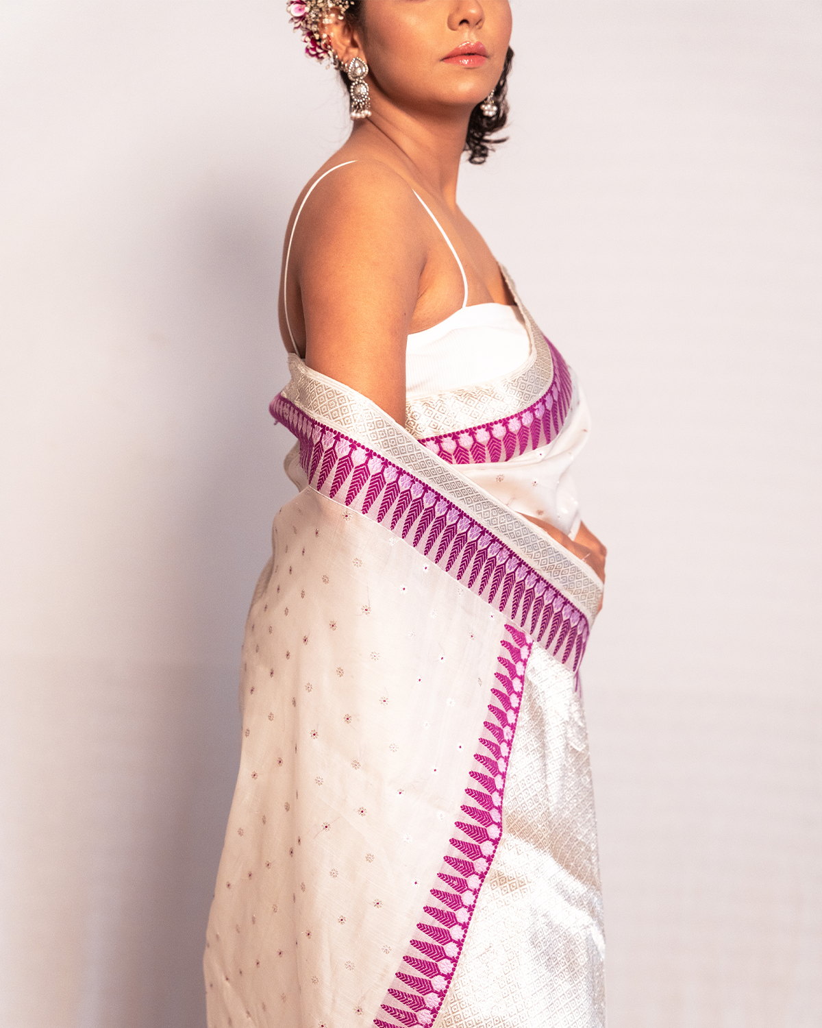 Captivating the mesmerising beauty of Assam, our Chandra pearly-white kesa paat/mulberry raw silk saree brings out the uniqueness of our handloom heritage!