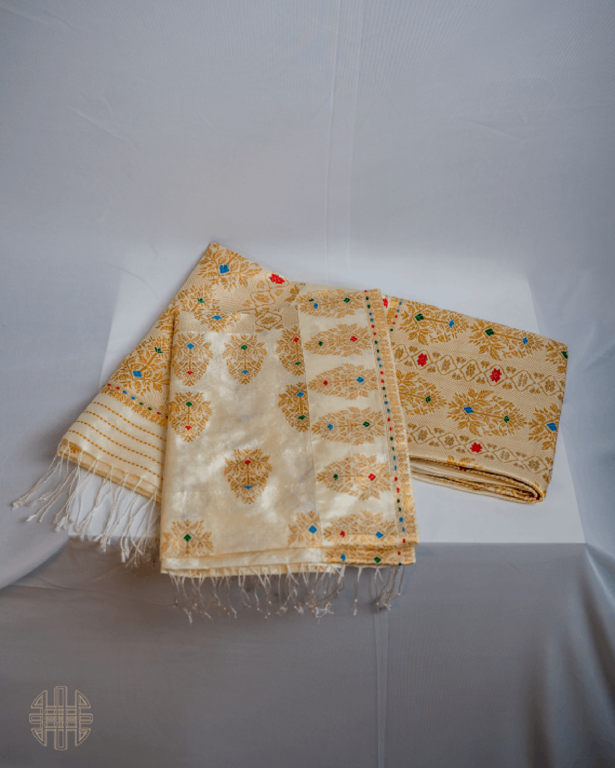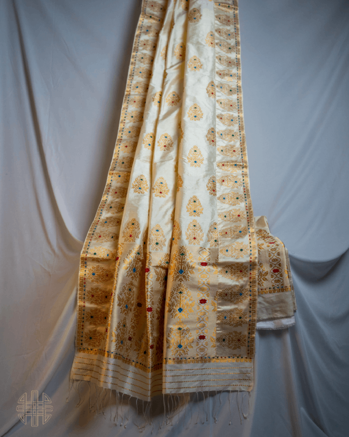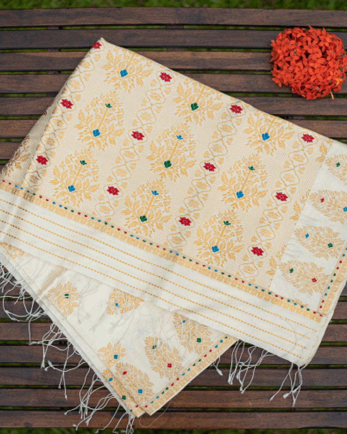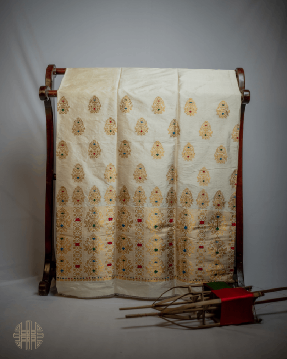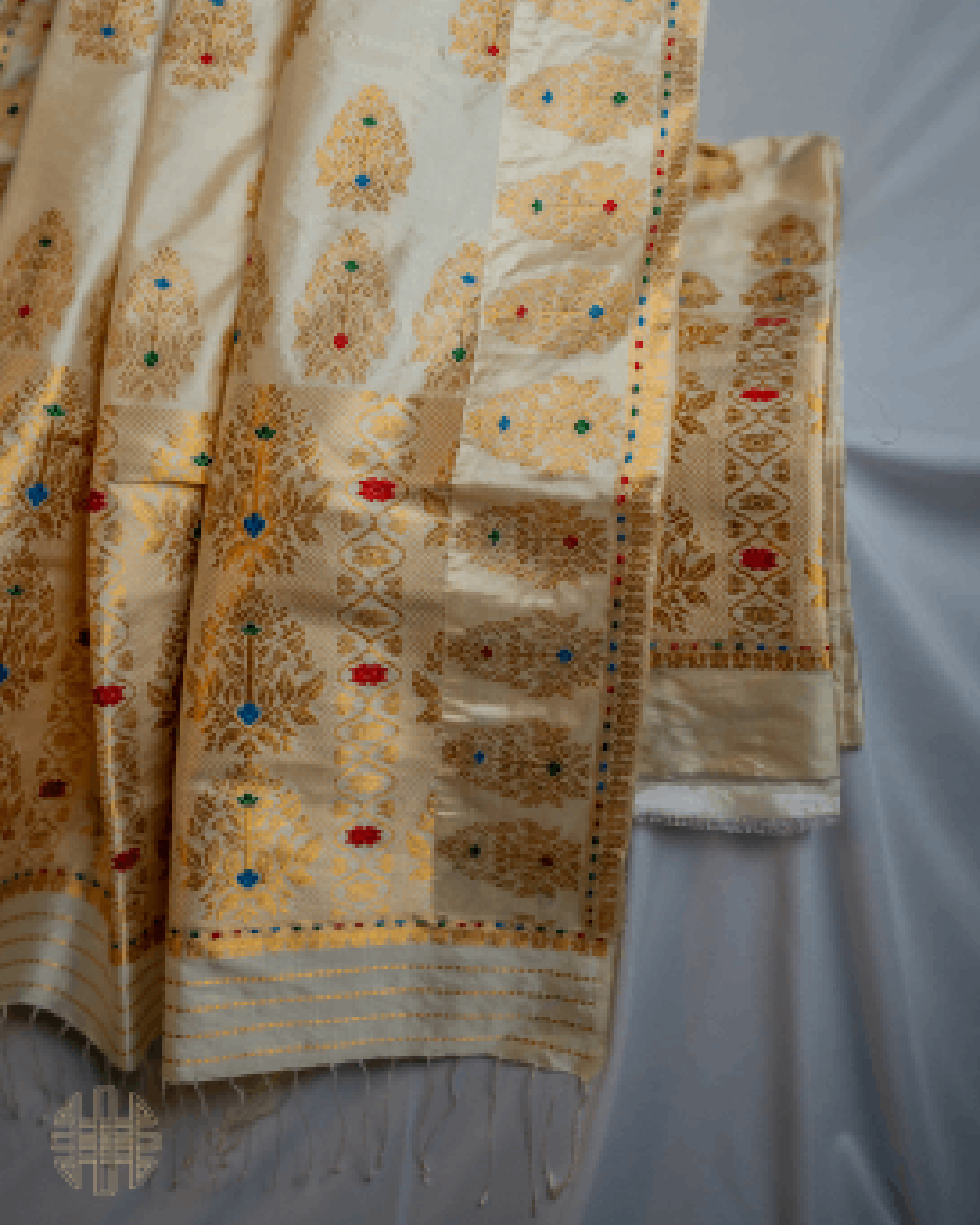 Chitralekha’s creamy silk base is woven with gold gos butas that shimmer, accented with subtle hints of red, green, and blue.