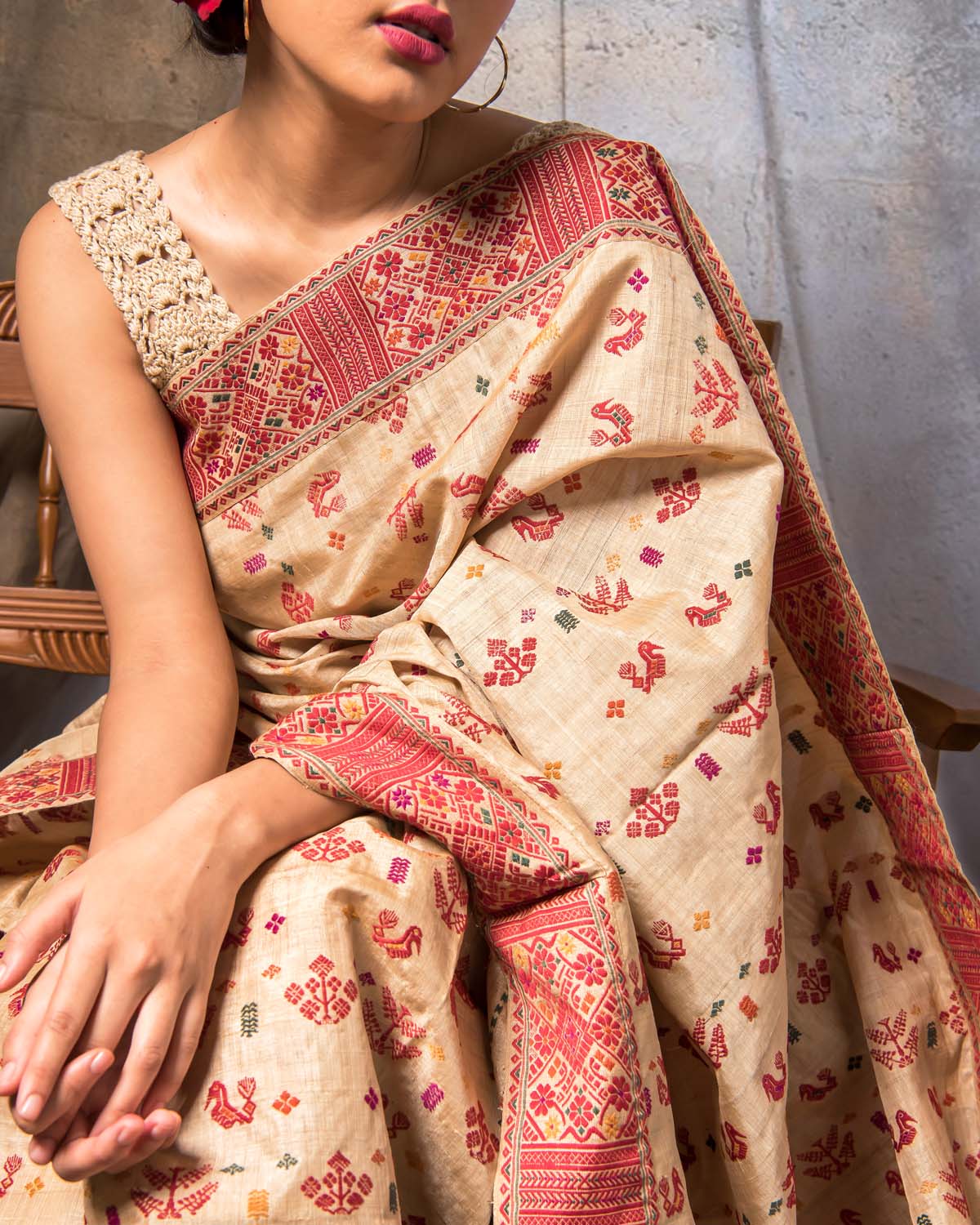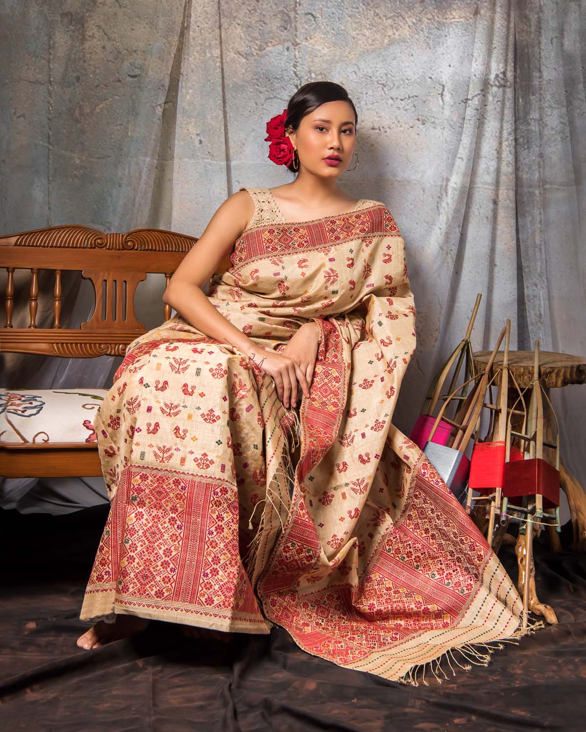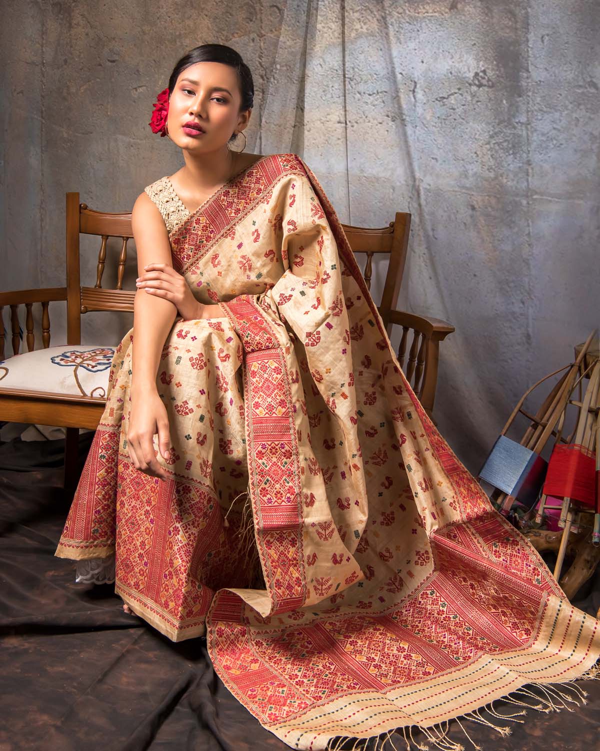 A masterpiece of woven art! This rich and luxurious looking Dhaani wheat brown maroon muga silk mekhela sador, bordered with glorious Axomiya miri phool buta along with sorai and gosa butas all over the attire is sure to get you a bundle of compliments, this season.