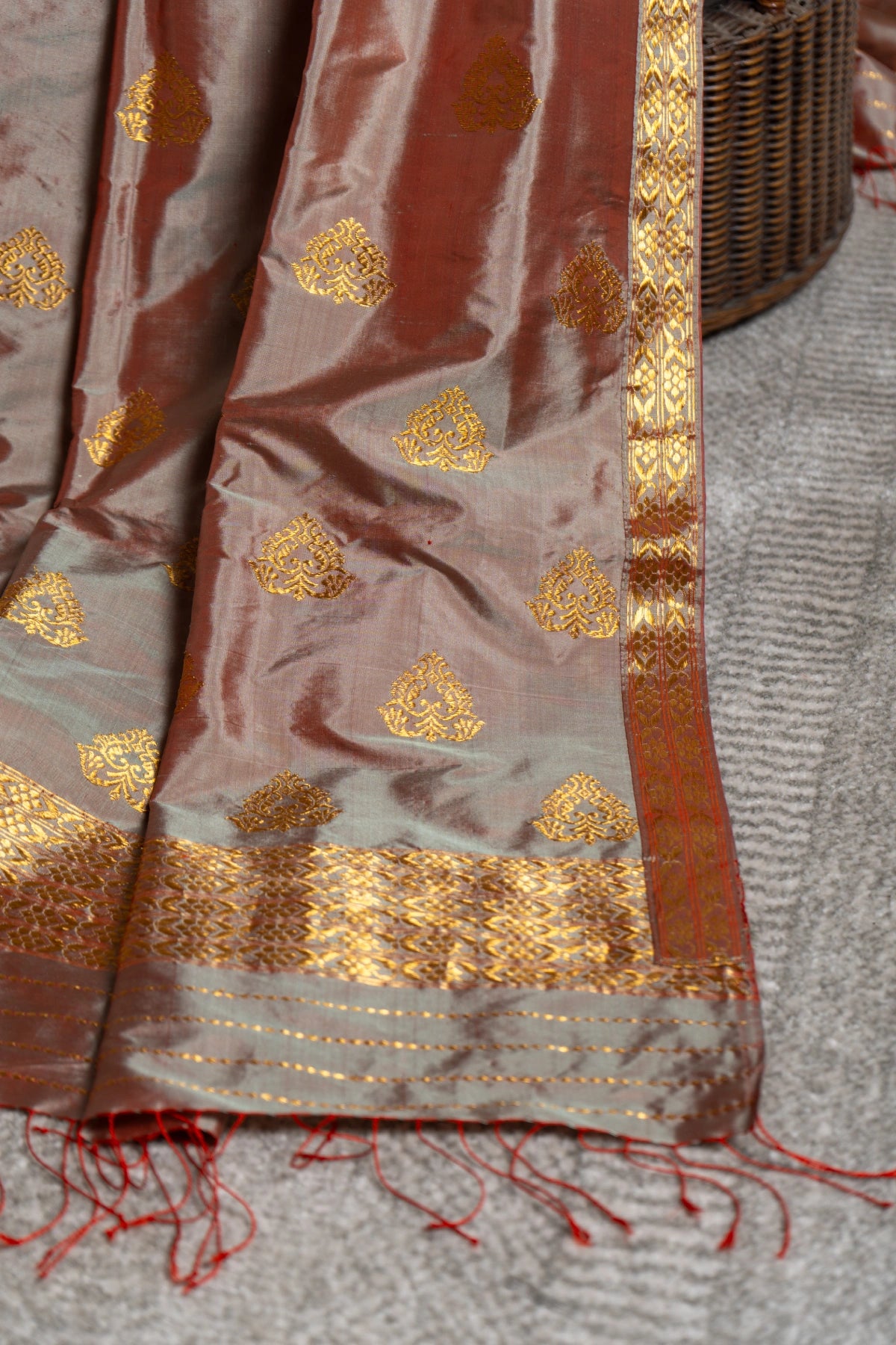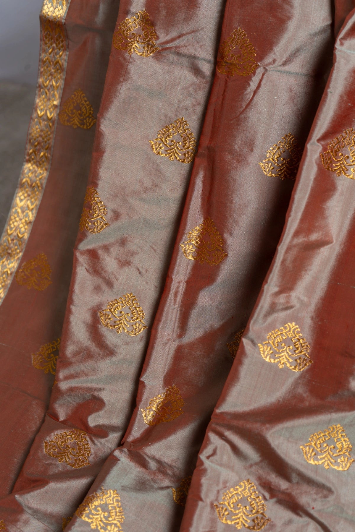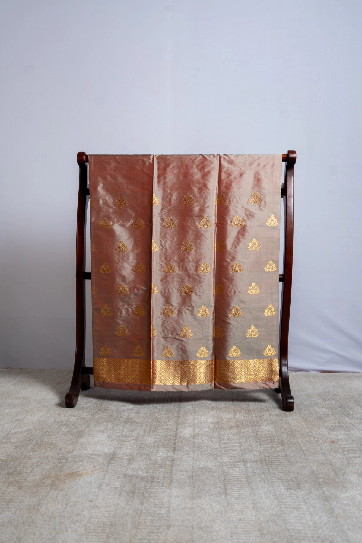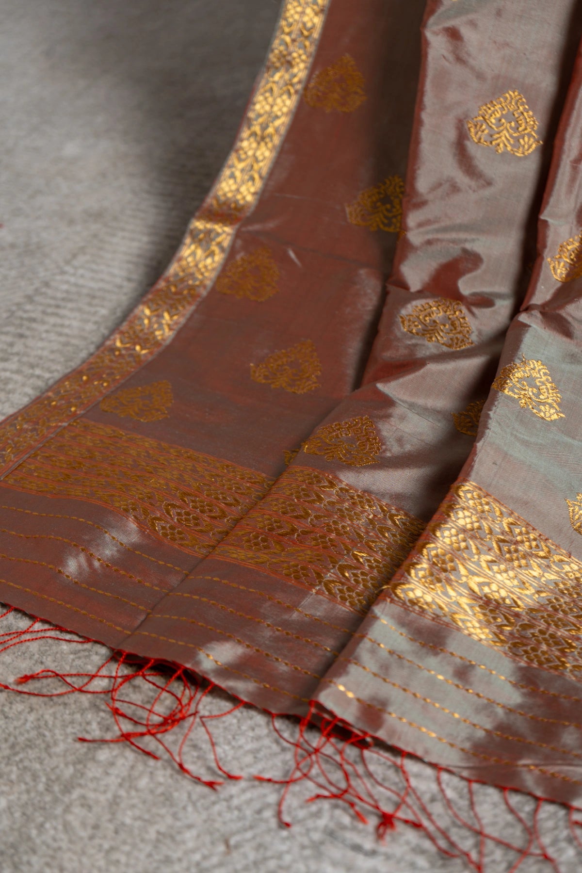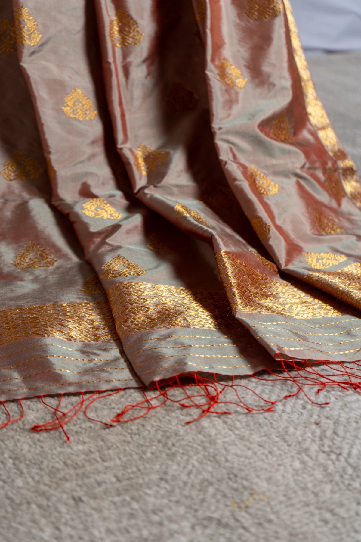 Dhoop shimmers in soft grey and blush like twilight smoke curling in the air. Gold Kingkhap-like motifs fill the body with fine floral bands framing the borders.