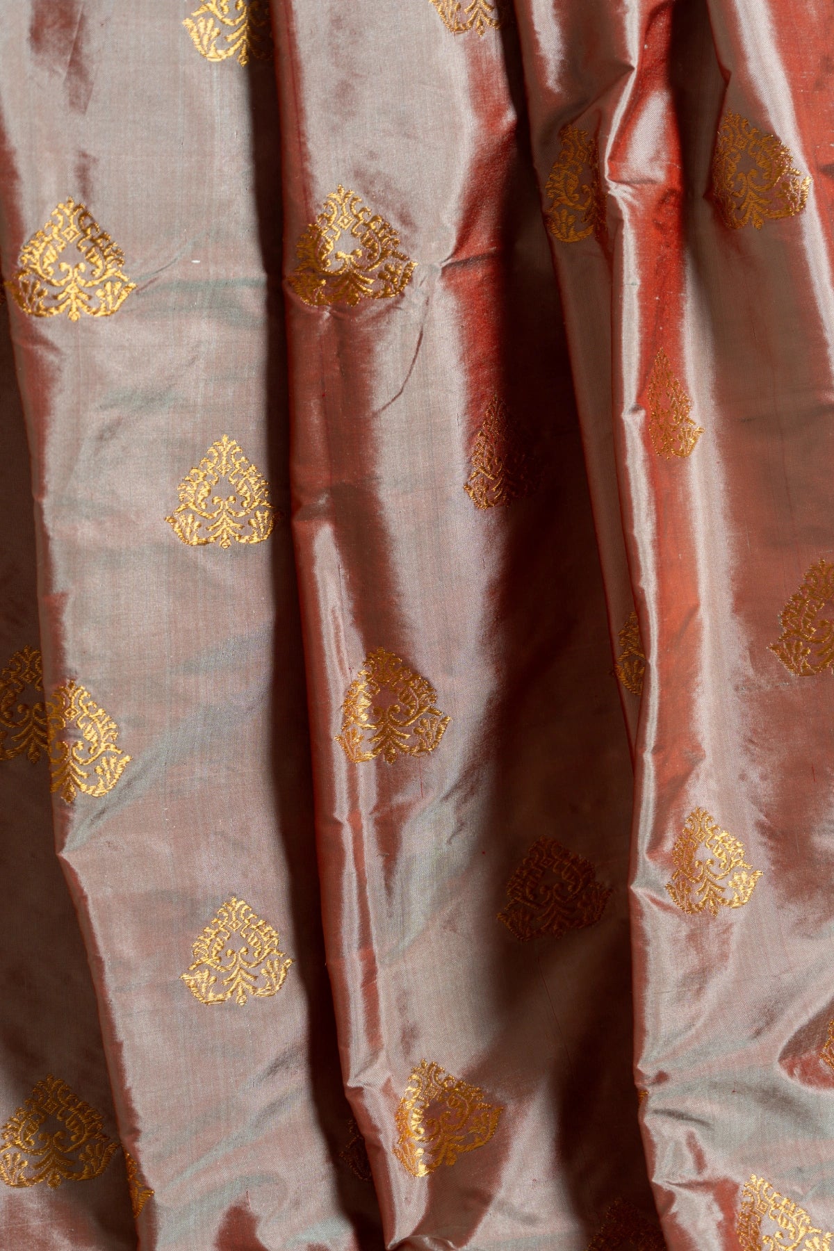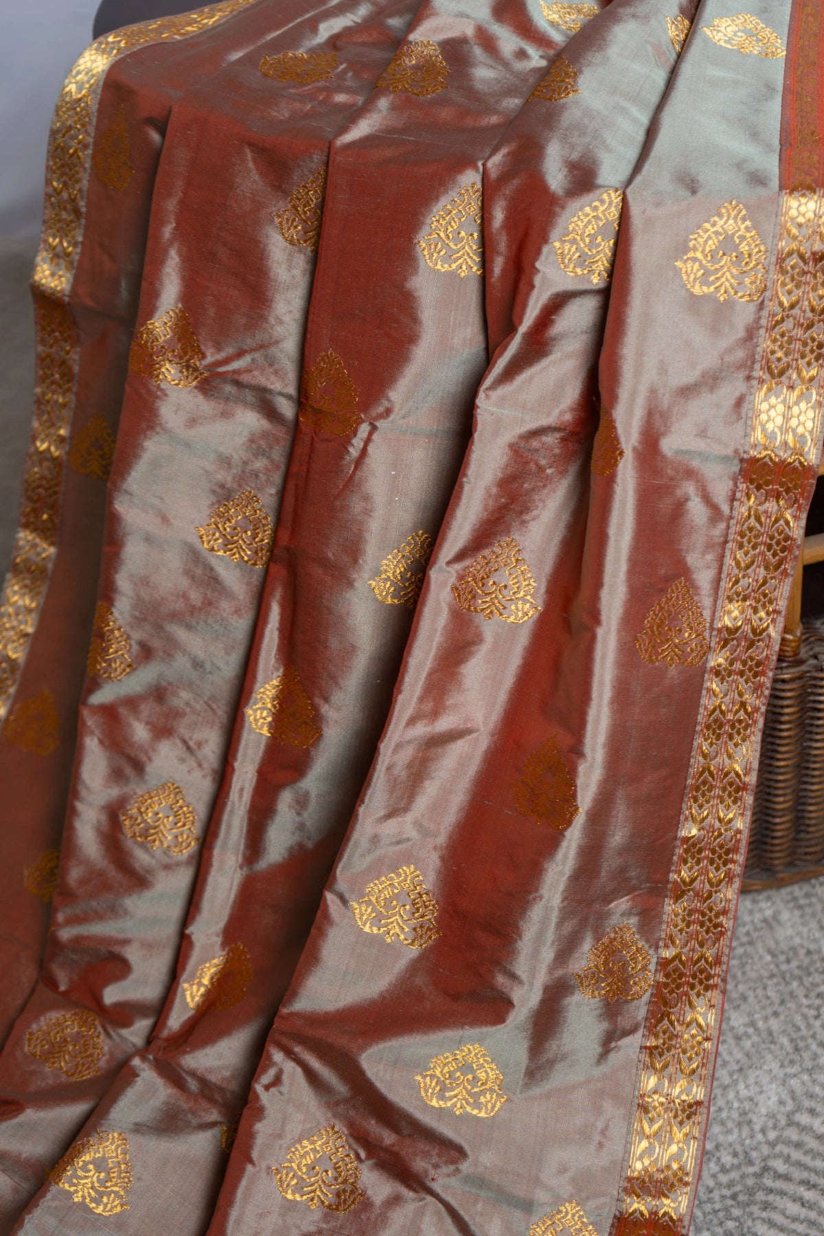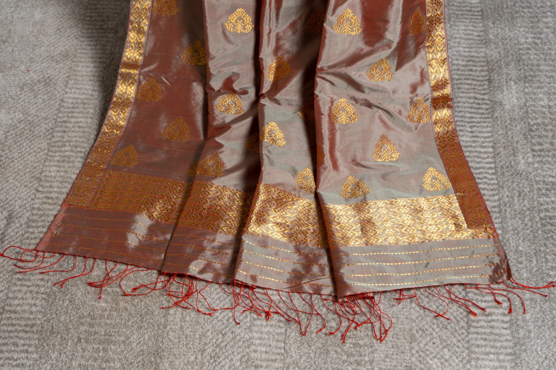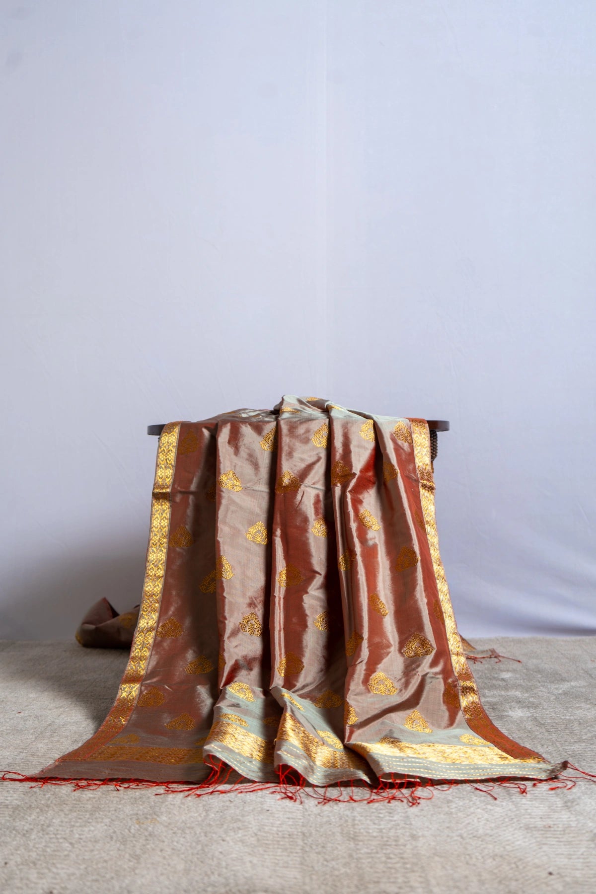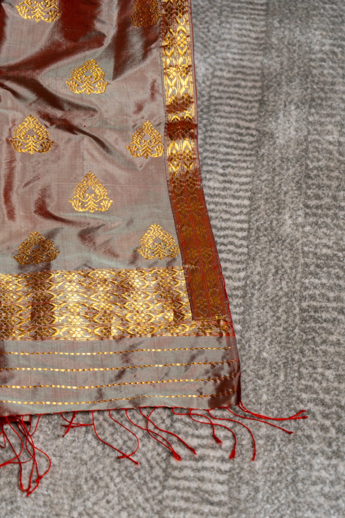 Dhoop shimmers in soft grey and blush like twilight smoke curling in the air. Gold Kingkhap-like motifs fill the body with fine floral bands framing the borders.