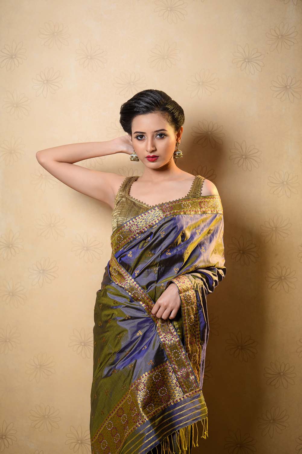 Look stunningly gorgeous in our Dhoop Sai paat silk mekhela sador in lush blue shade, handwoven with beautiful traditional Assamese flower butta motifs all-over. This piece of handloom captivates the Assamese grace with detailed motifs of Parvati, Kakhori and Bullock Cart Wheel on the sarees border.