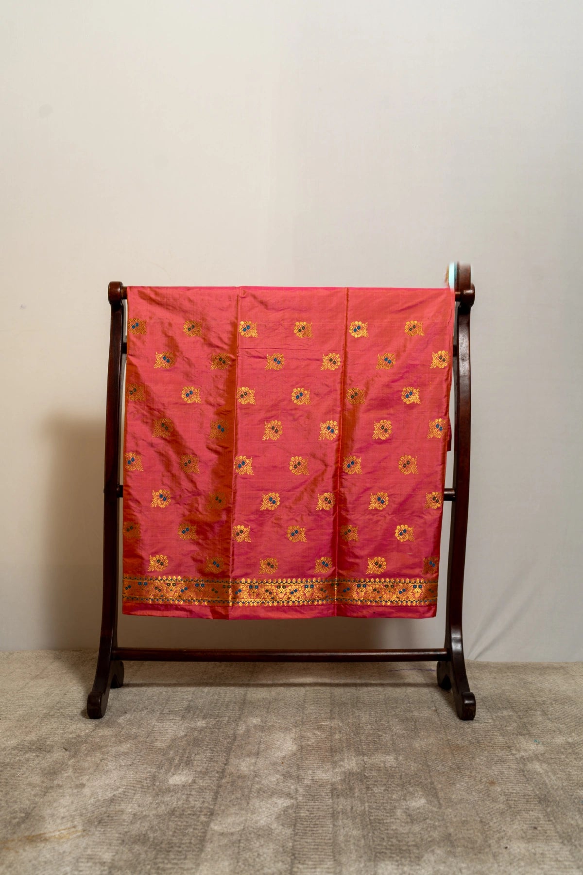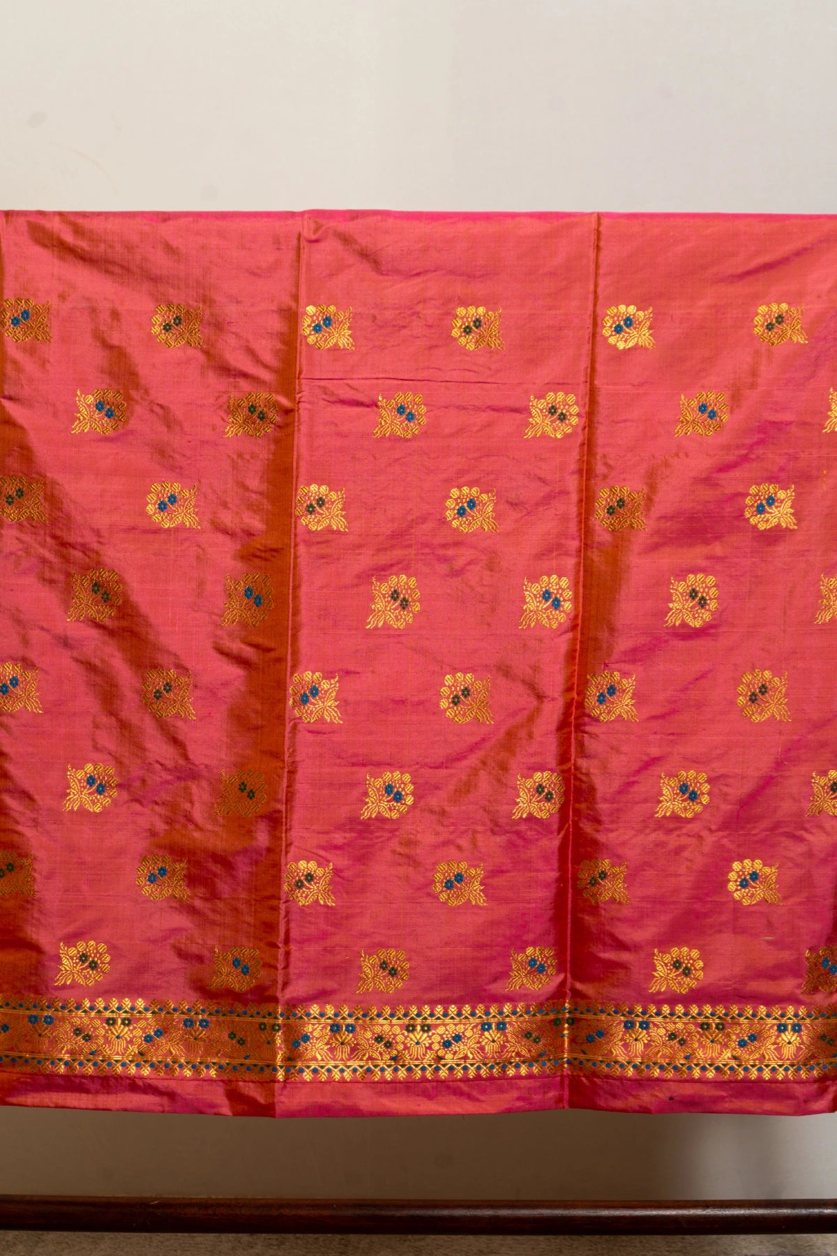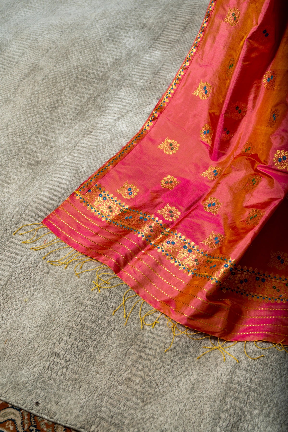Duluni glows in pinky coral, with golden xewalis dancing across the body and gathered in one delicate line along the aanchal. Blue and green meena add a playful touch.