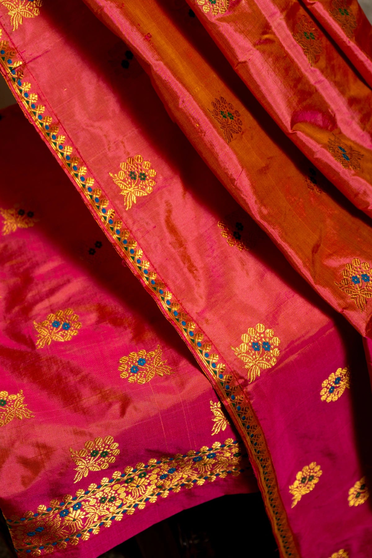 Don’t store the mekhela sador in a plastic cover as this will cause the gold embroidery to turn black. |