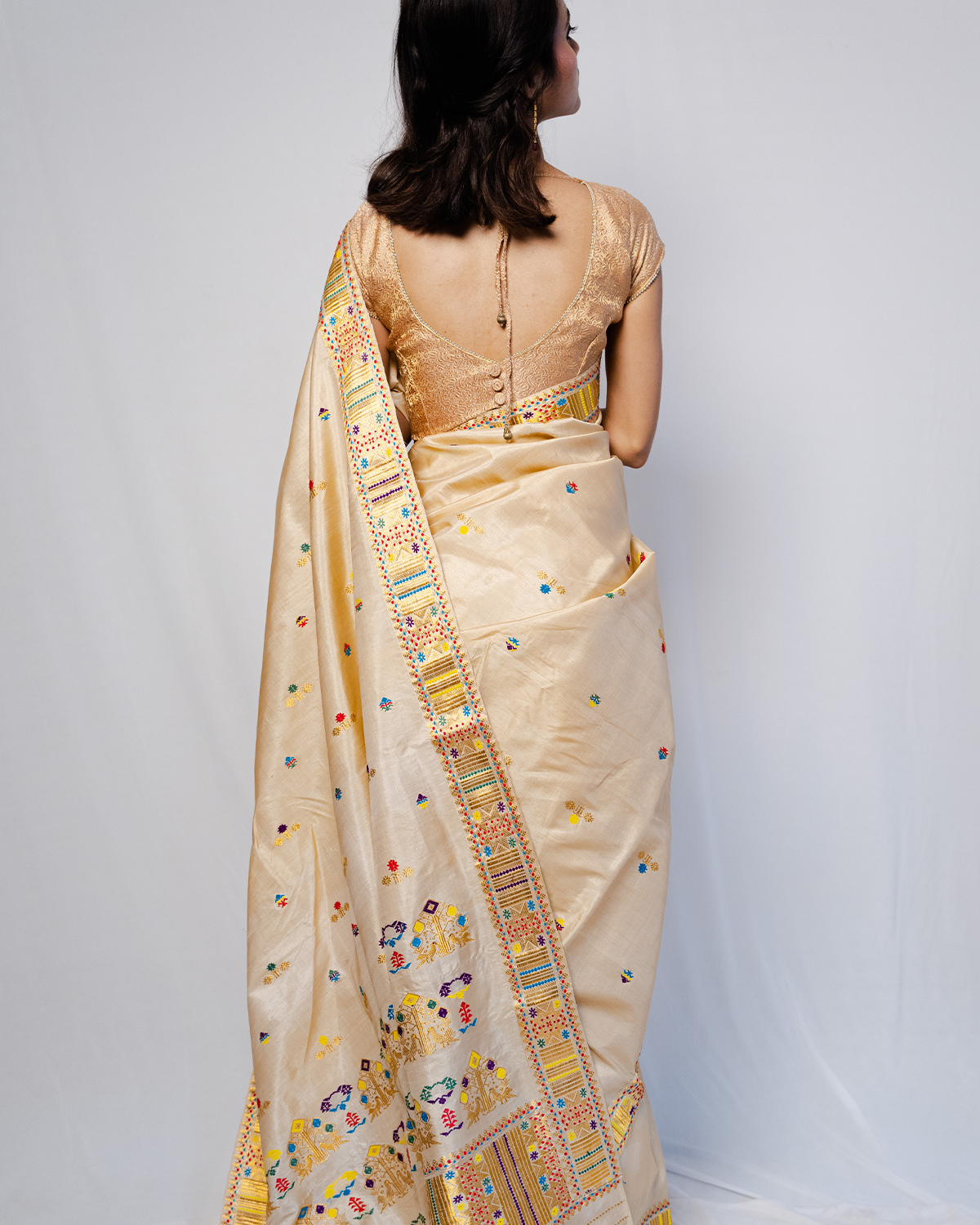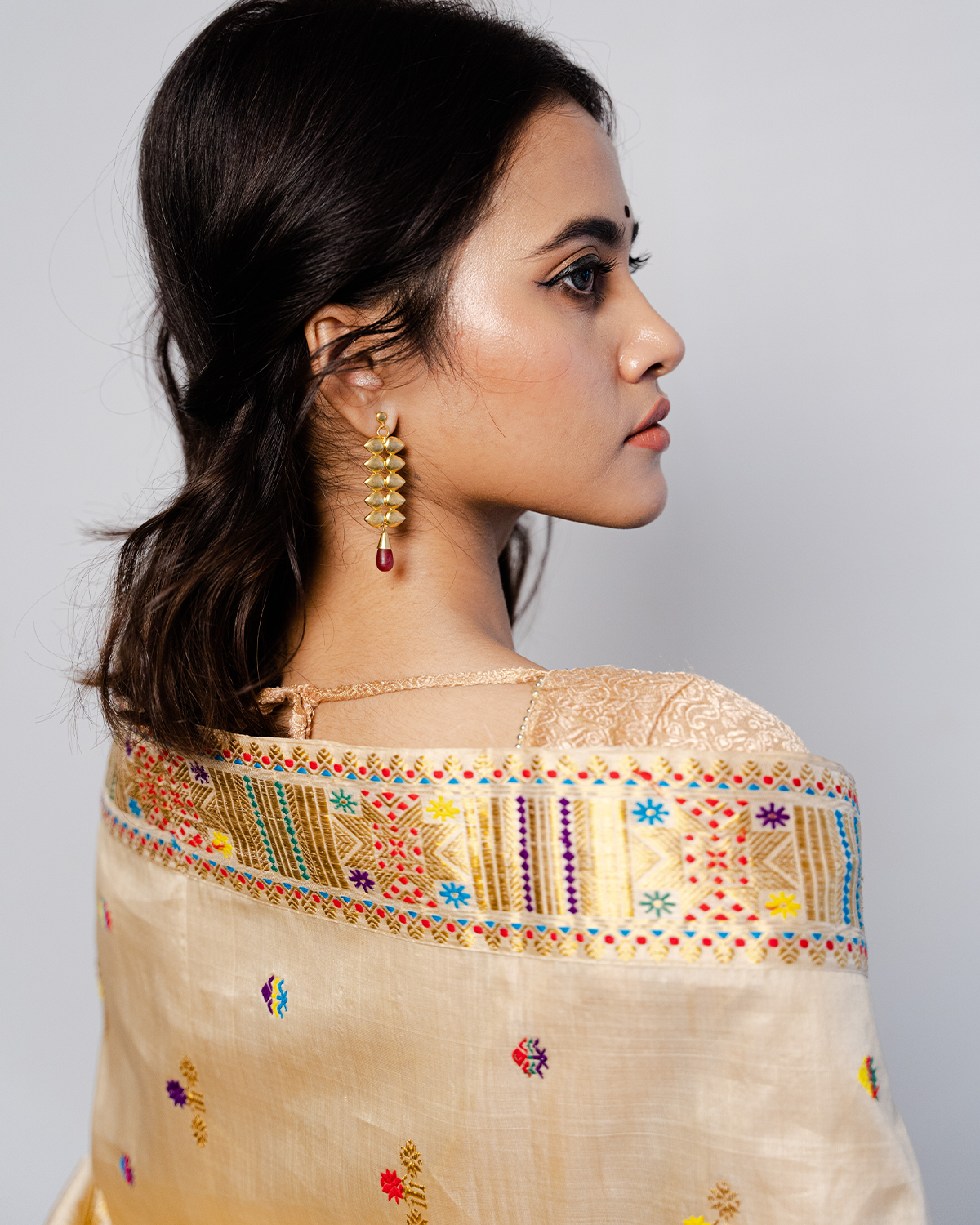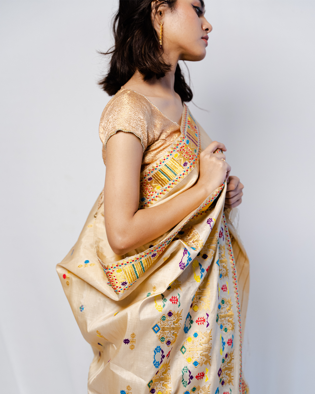 Like dazzling sunbeams, our Ekaa ivory white-gold paat/mulberry silk saree with gam kharu phool and sorai miri and gosa buta is an absolute choice for every Assamese connoisseur.