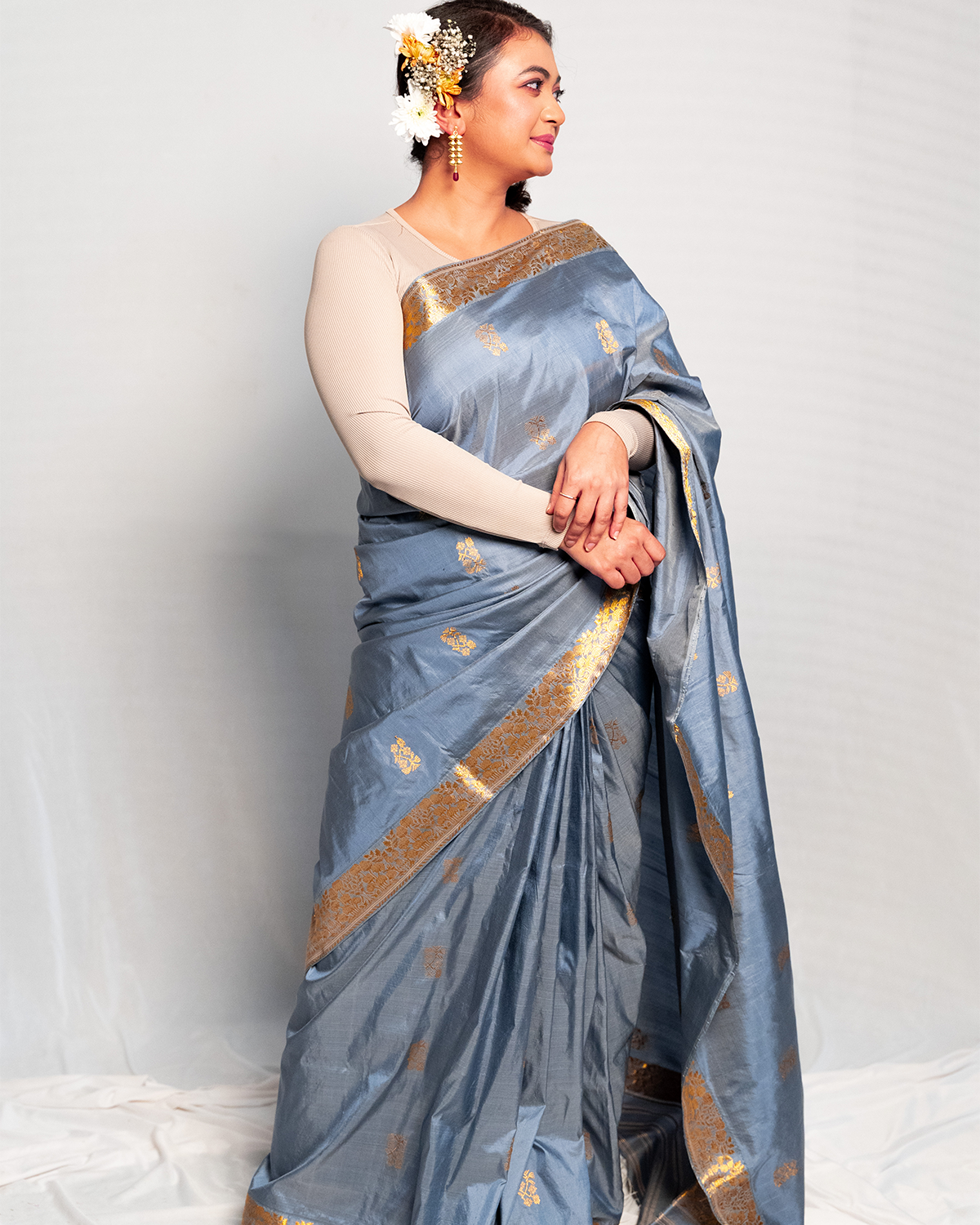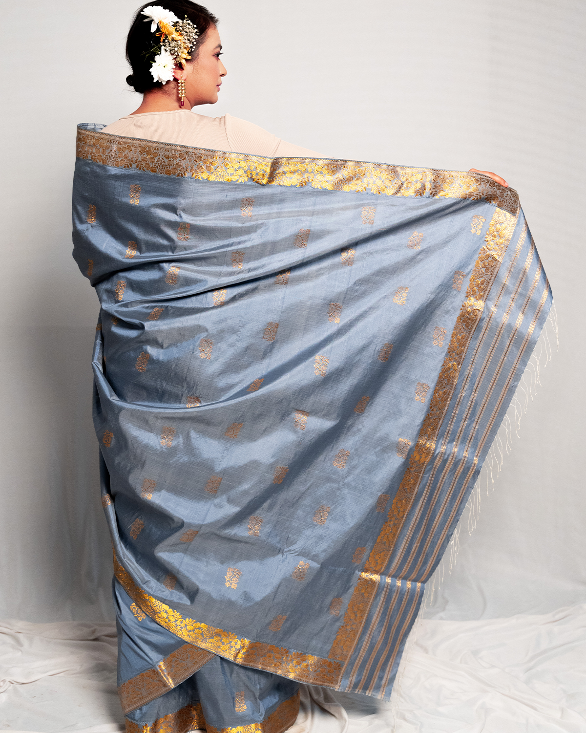 Handcrafted to represent the brilliance of our Assamese weavers, our Gajalakshmi Elephant-Grey coloured paat/mulberry silk mekhela sador is indeed a timeless beauty in itself.