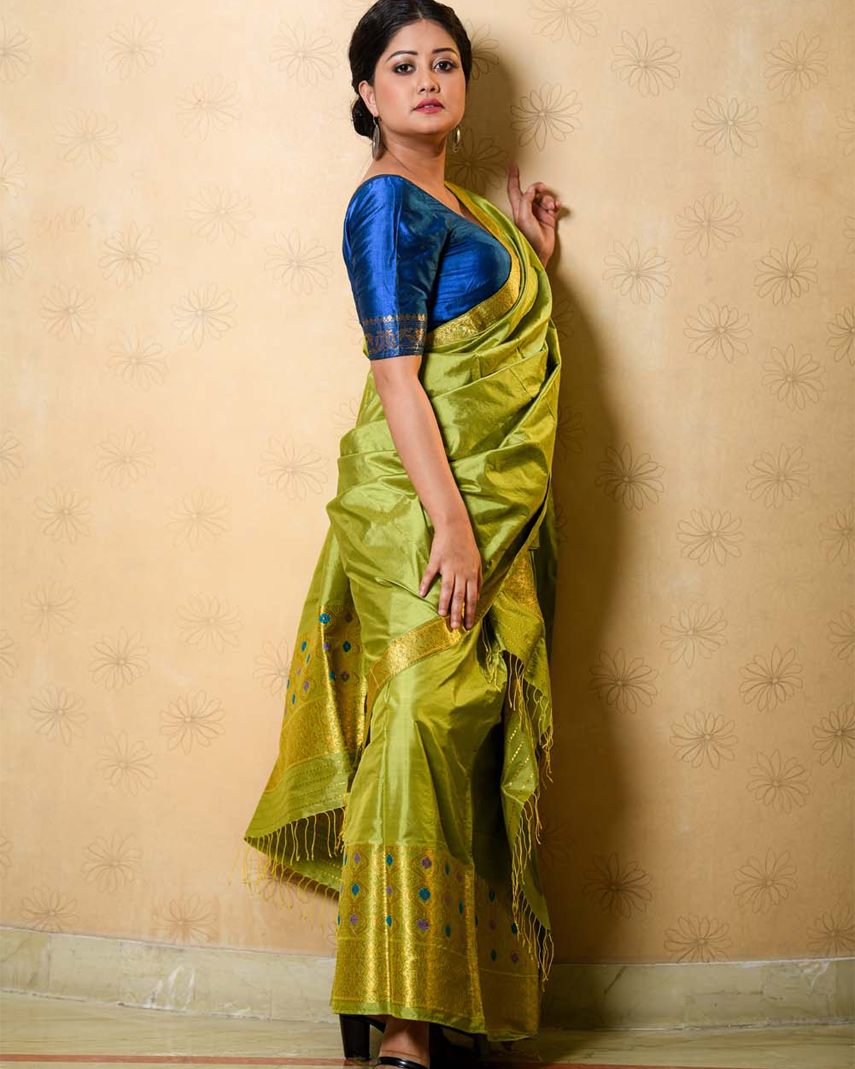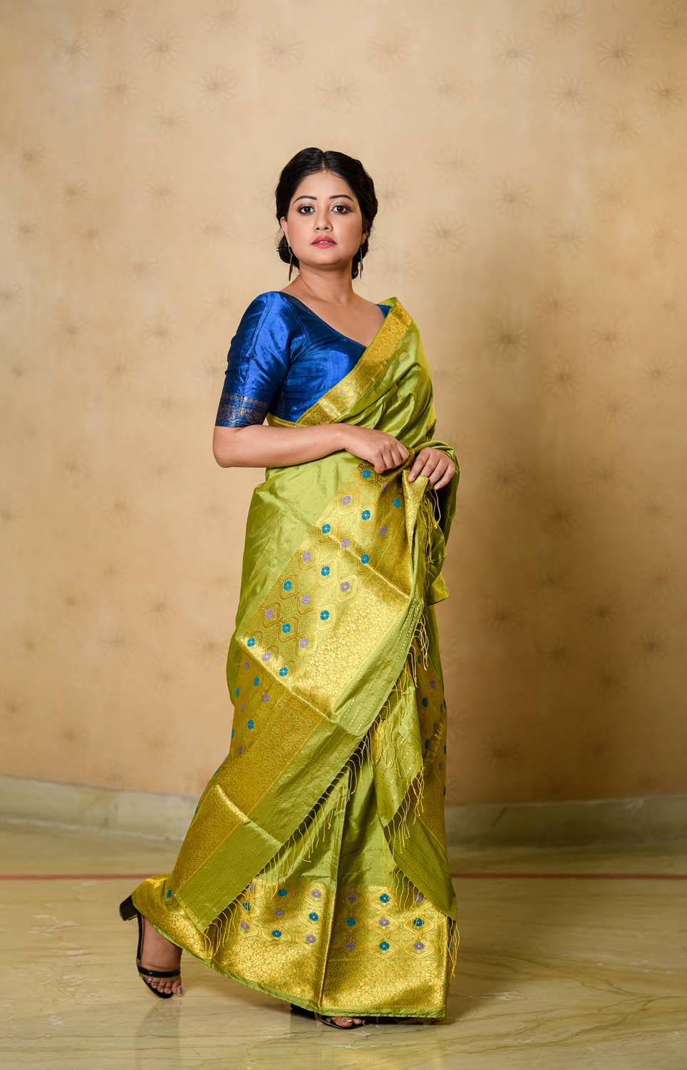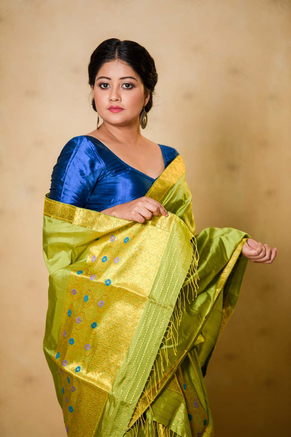 Experience sheer royalty in this rich parrot green shaded Gauri paat silk mekhala sador with gold zari details. It sets the right combination for any celebration or event.