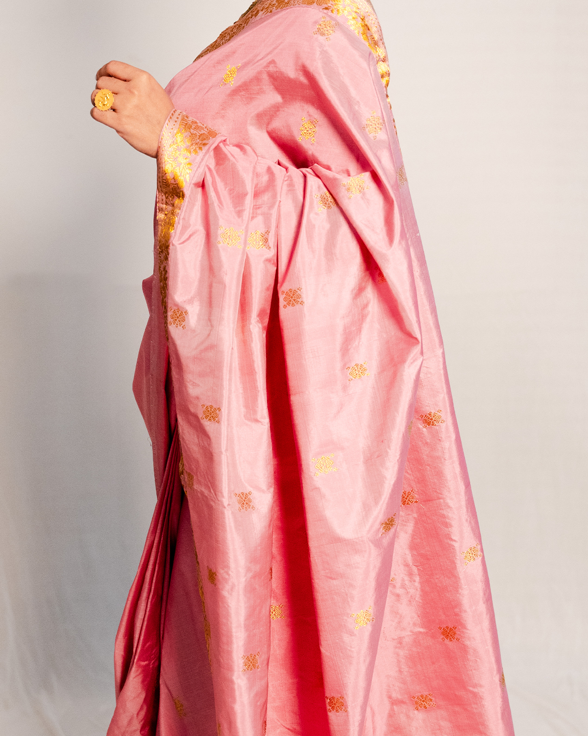 Radiating a minimalistic approach to aesthetics is our gorgeously weaved Hamsini rose pink-gold paat/mulberry silk saree with lota phool and chariot phool design in golden guna.