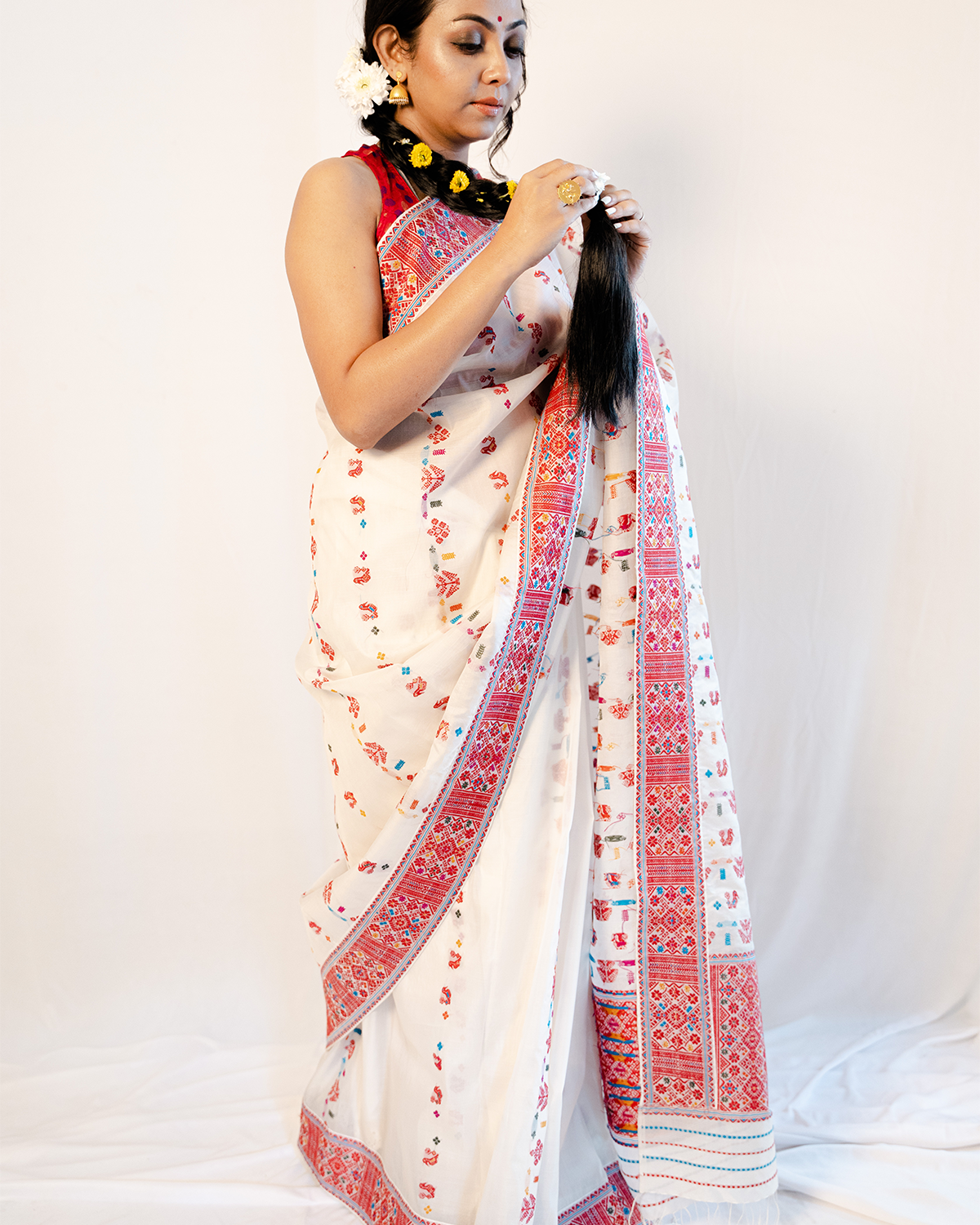 This Hera white-red kesa paat/mulberry raw silk saree with red, green, blue, yellow and pink meena work on the borders and sorai-gosa motifs on the body of the mekhela is an absolute work of traditional Assamese art!