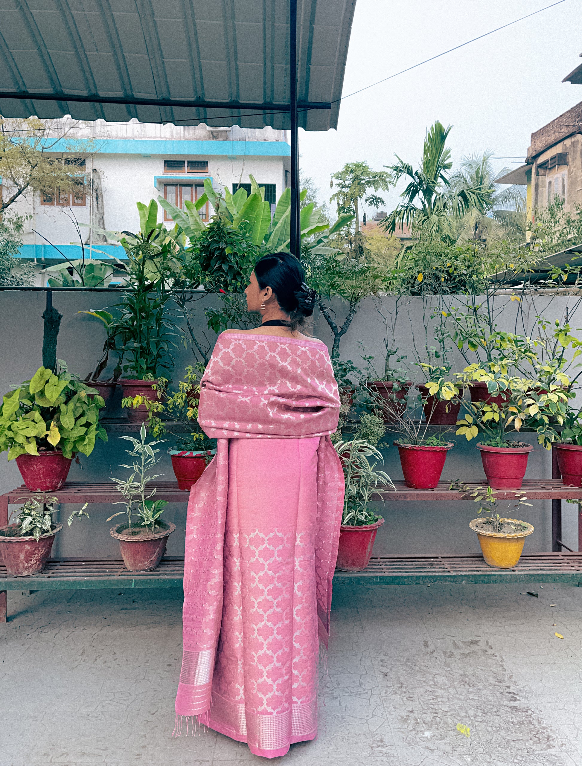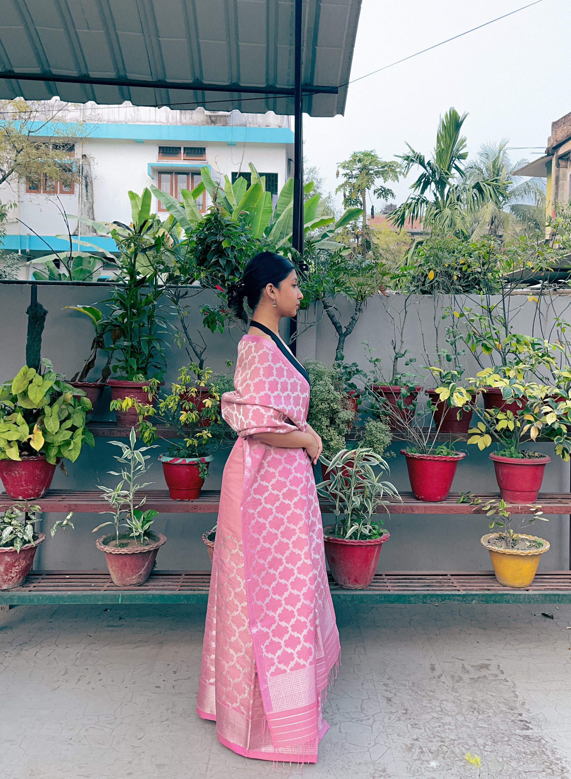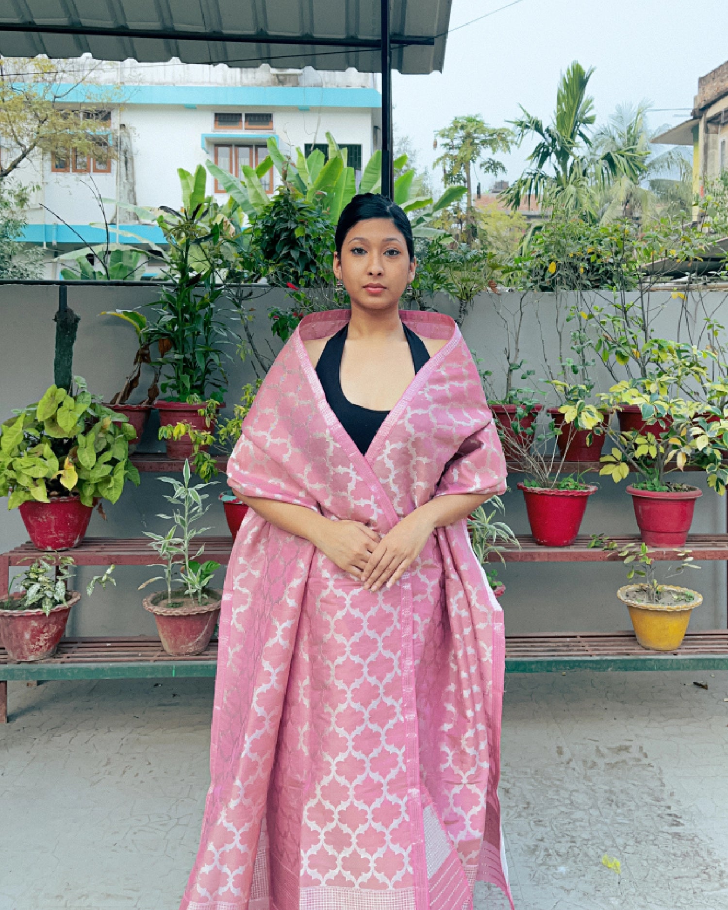 Hrdya’s soft warm pink is all about the details. An intricate white jaali pattern reminiscent of Mughal arches weaves across the fabric, giving it a delicate, saree-like elegance.