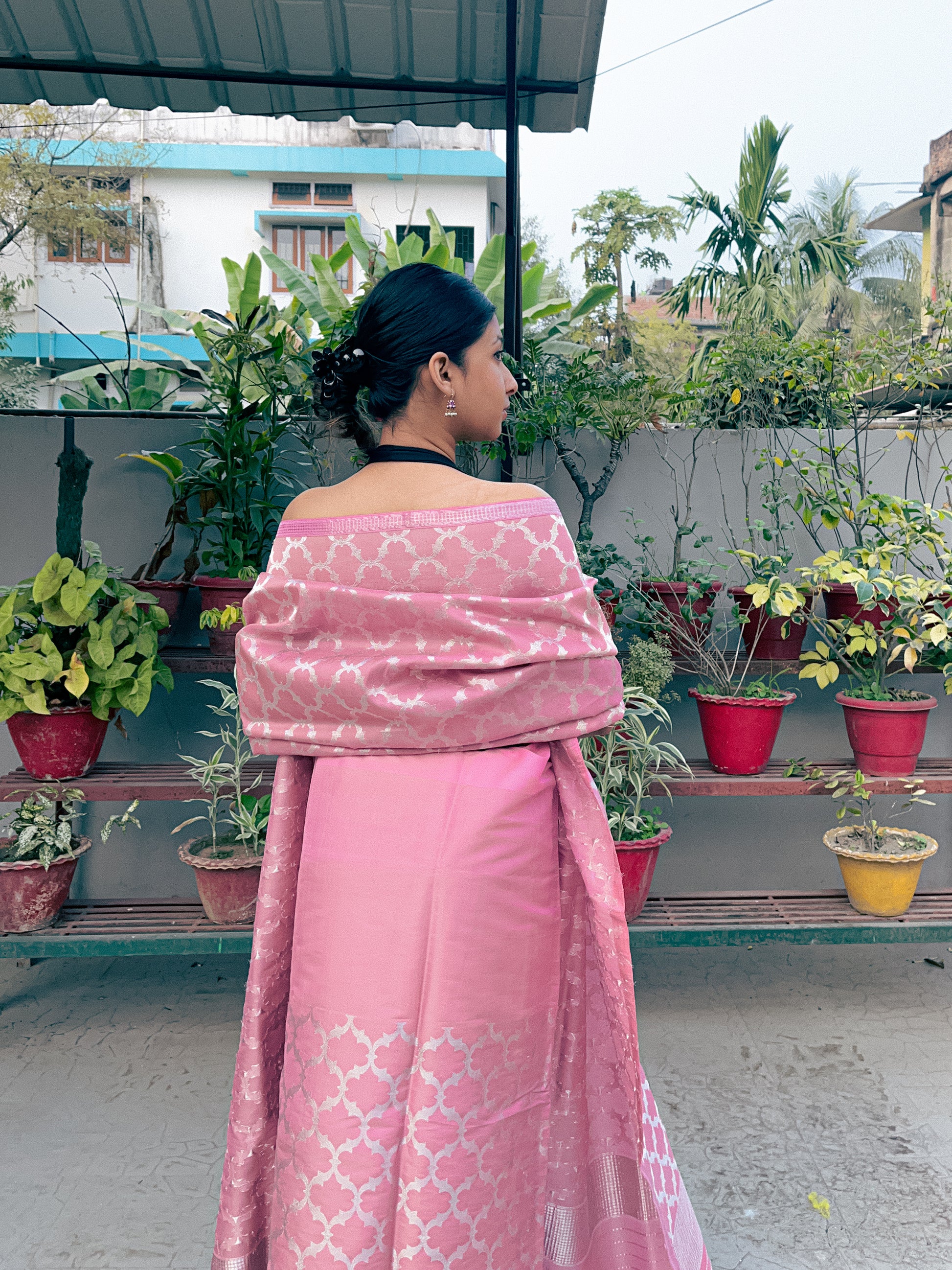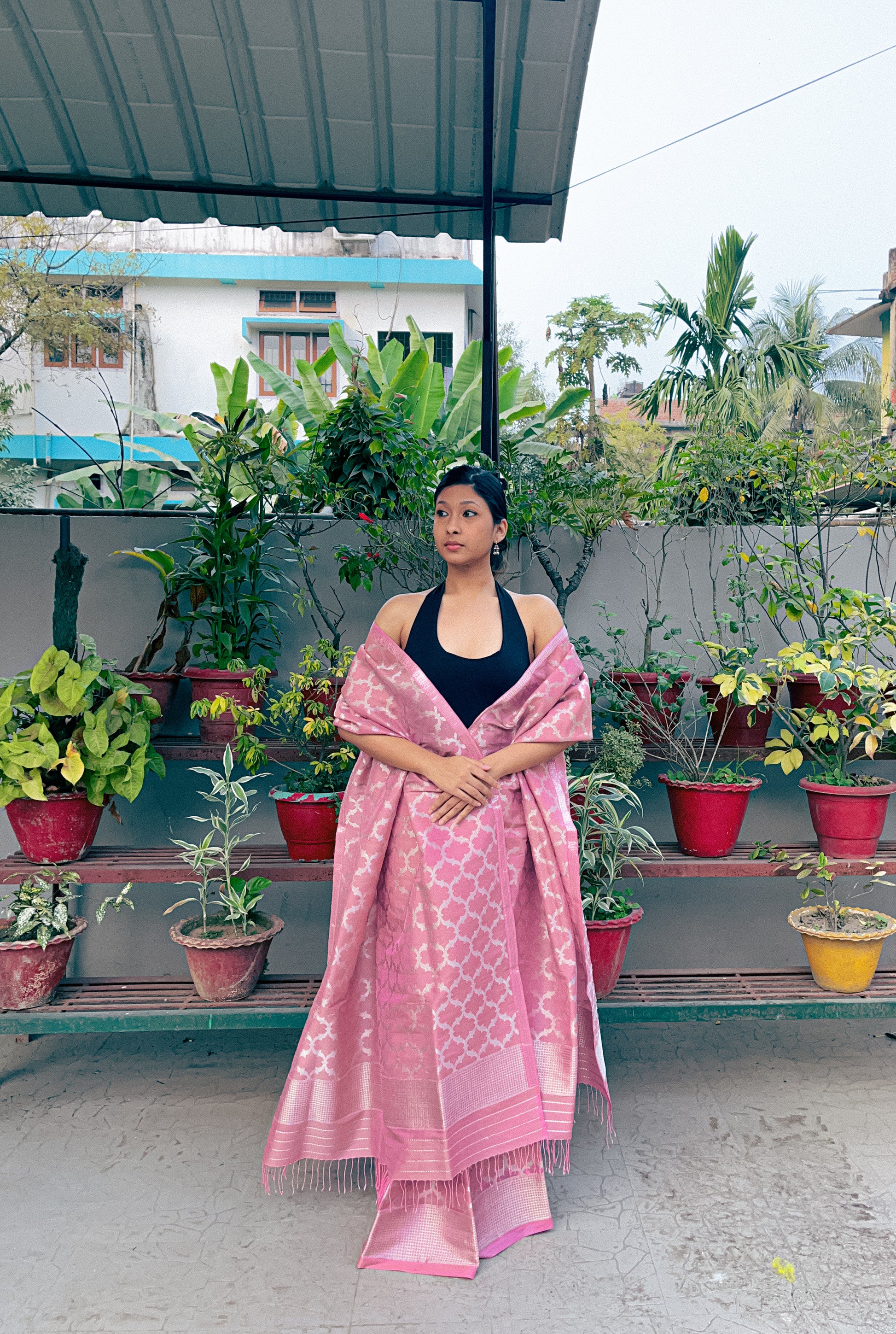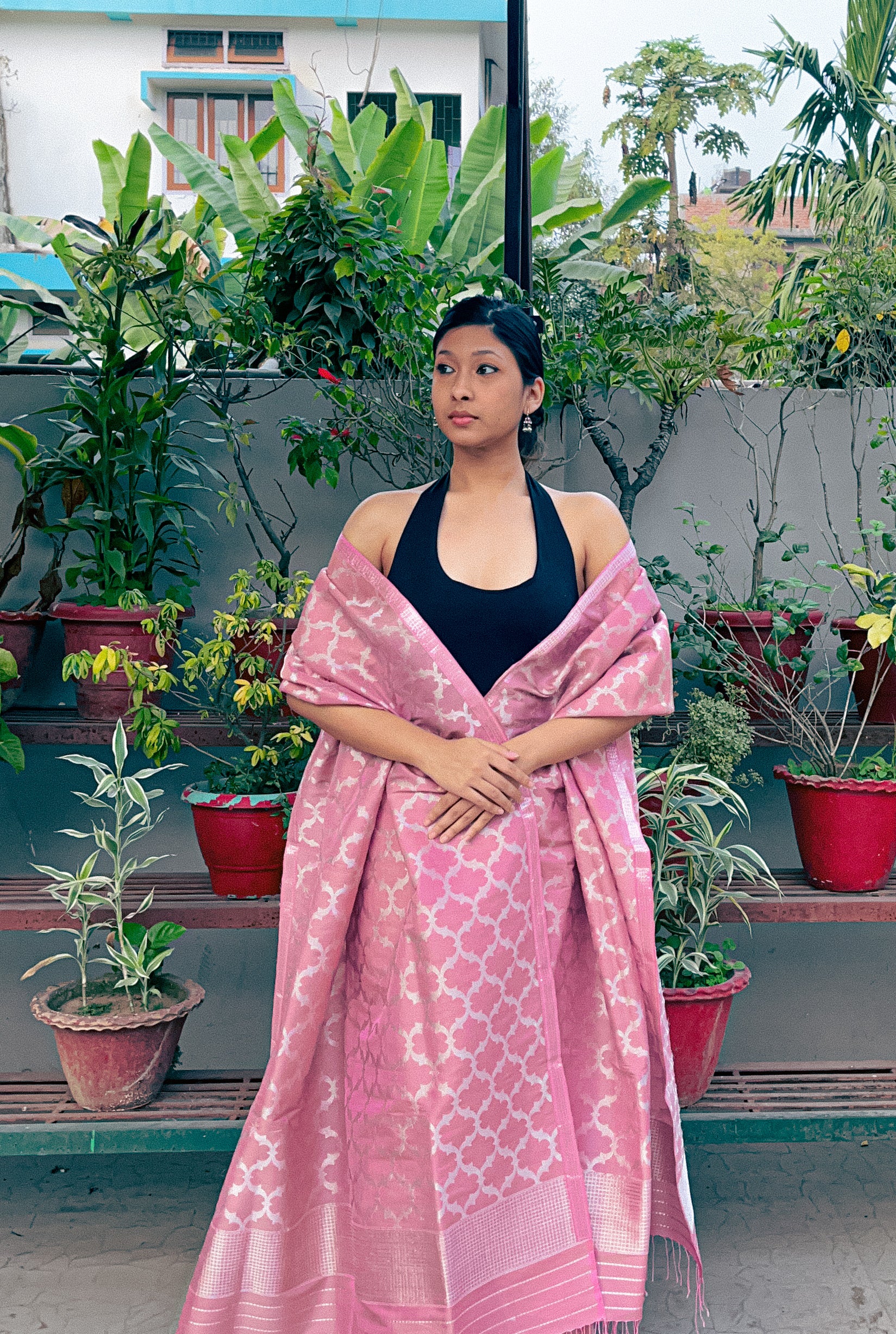 Hrdya’s soft warm pink is all about the details. An intricate white jaali pattern reminiscent of Mughal arches weaves across the fabric, giving it a delicate, saree-like elegance.