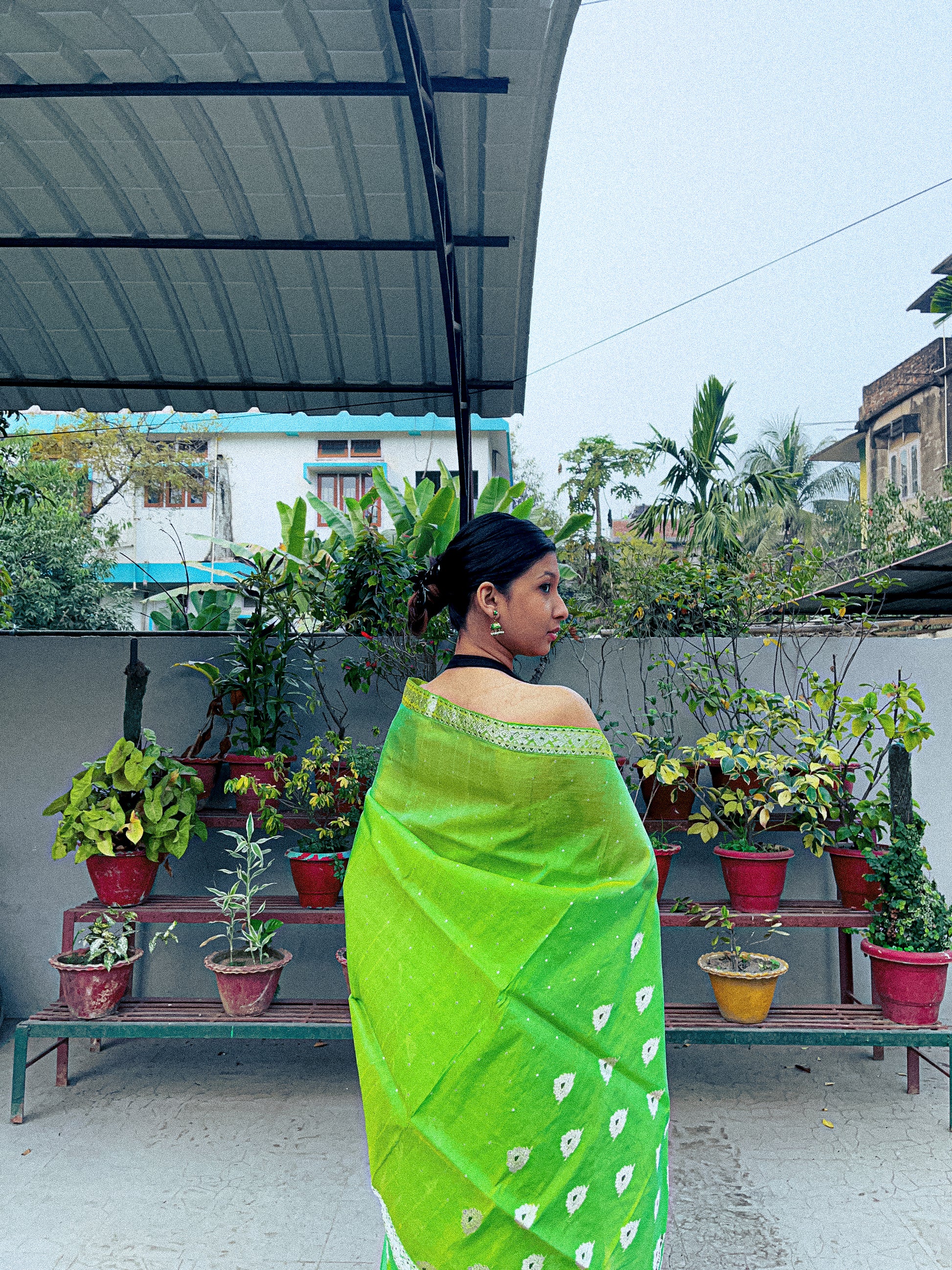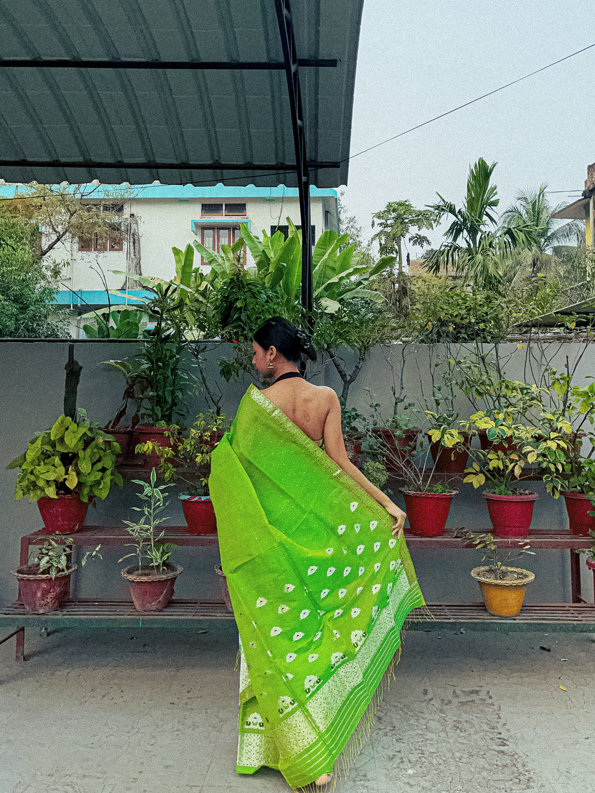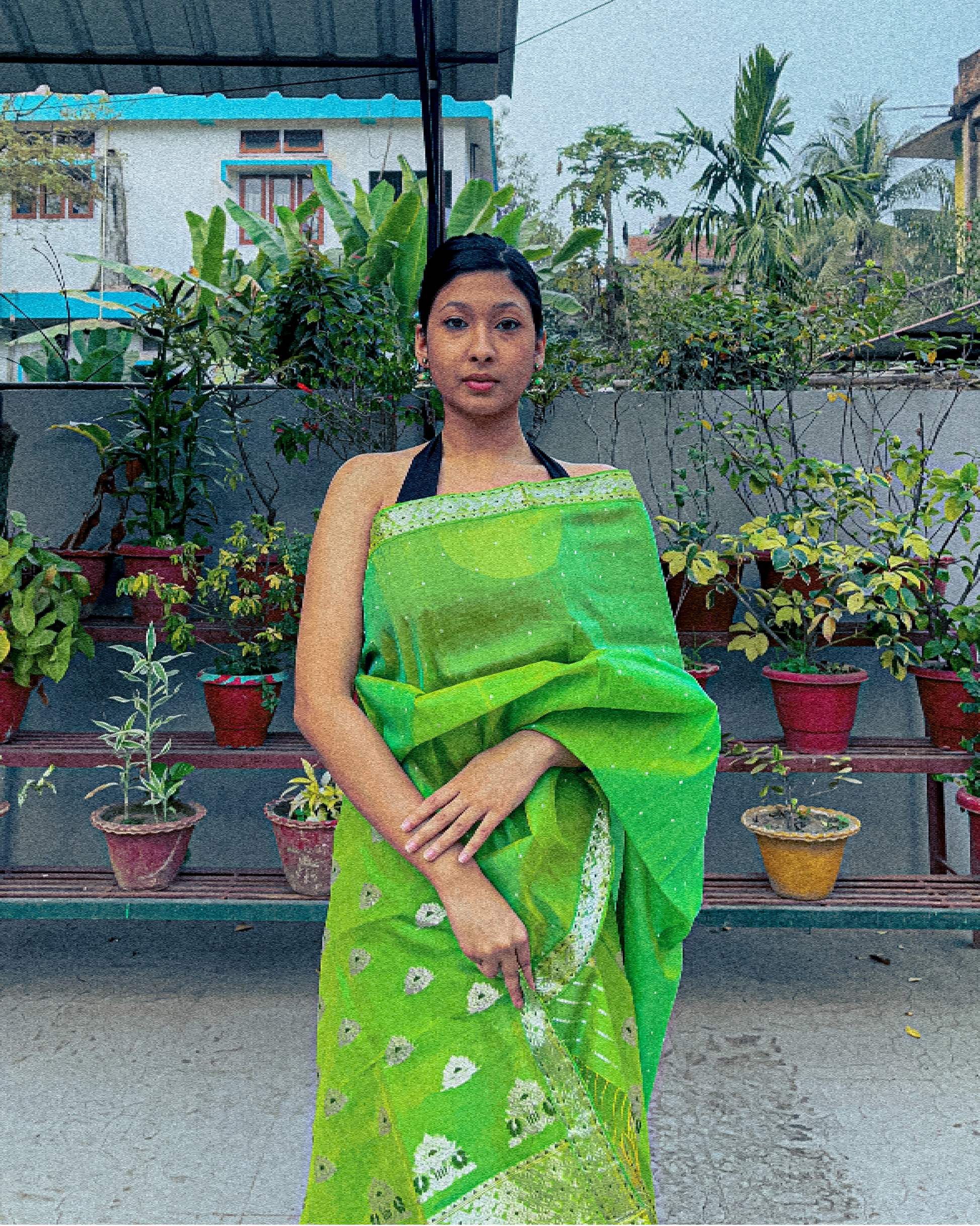 Jiva’s lime-green silk plays with texture. Lota phool bands trace the borders, while gos phool motifs fade into playful dotted details on the body. A subtle green meena adds an unexpected touch.