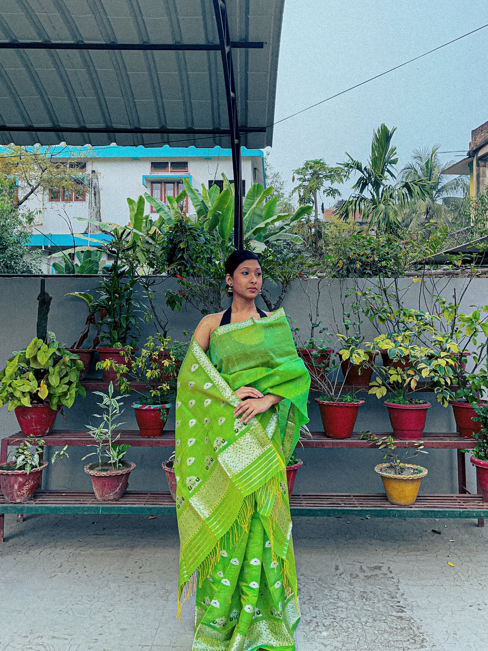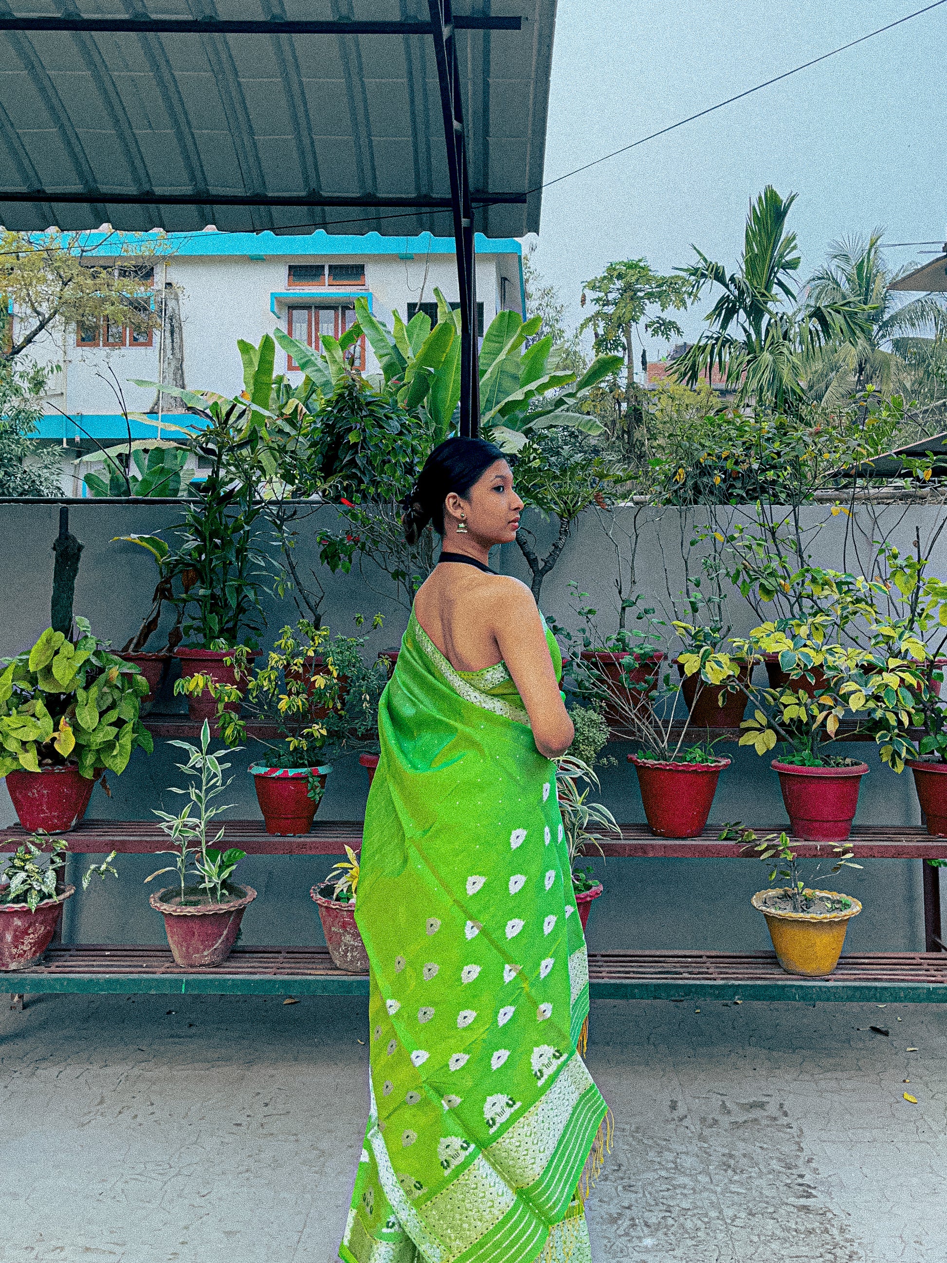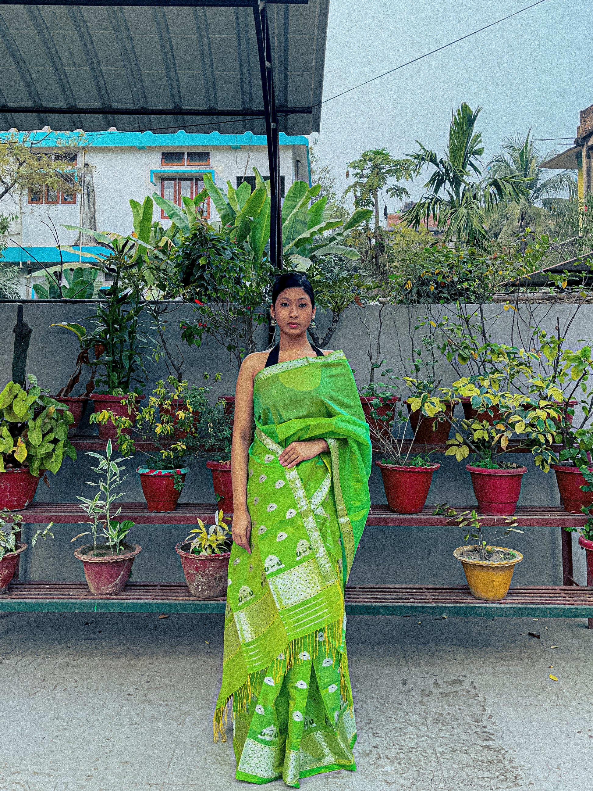 Jiva’s lime-green silk plays with texture. Lota phool bands trace the borders, while gos phool motifs fade into playful dotted details on the body. A subtle green meena adds an unexpected touch.