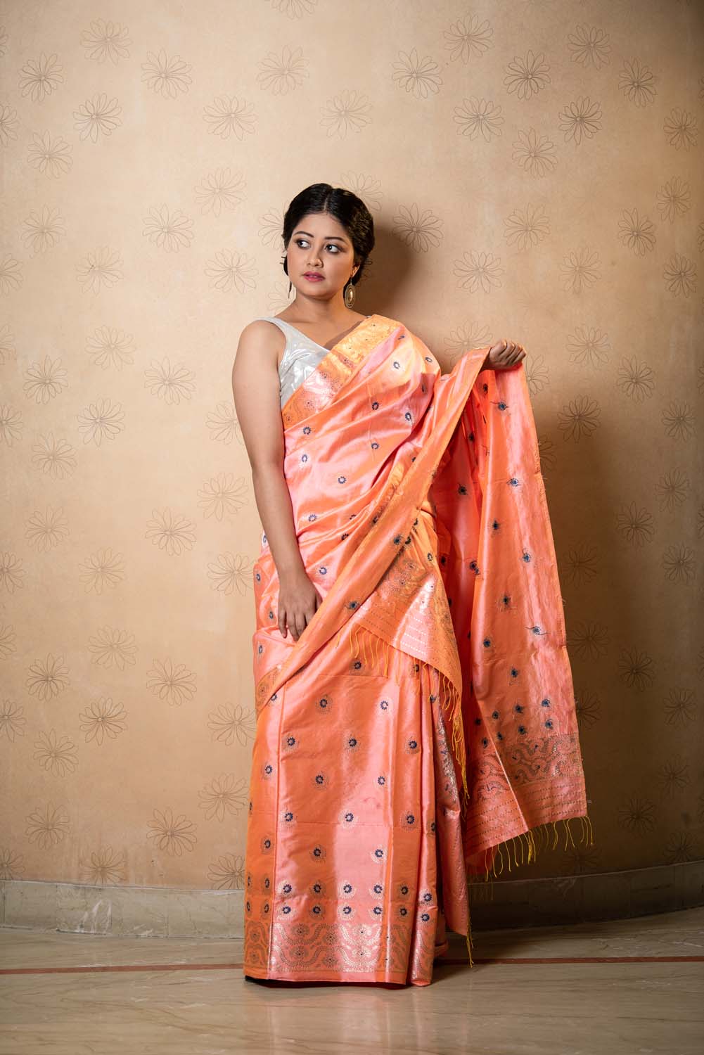 The admirable beauty of Jogi peach paat silk /mulberry silk mekhela sador with silver zari and meticulously woven with Assamese paat silk, brings an instant feeling of bliss as you revel in its brilliance.