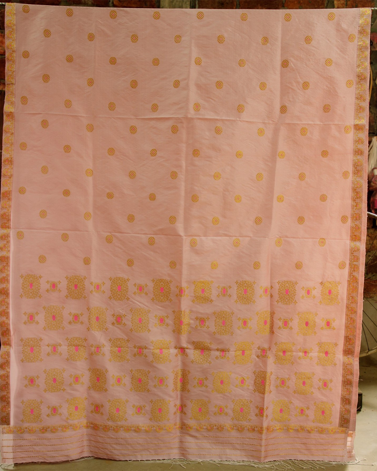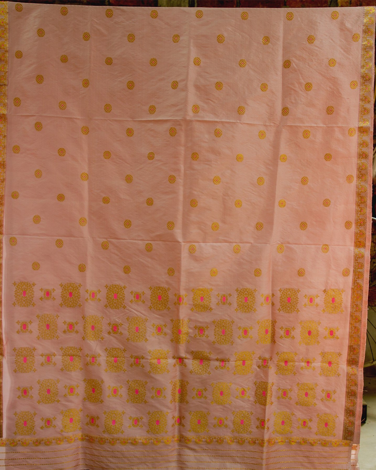 Embracing the royal essence of Assam and it's culture & heritage is our Joyantee pink paat/mulberry silk mekhela sador. It beautifully translates the simplicity and elegance of Assam. This gorgeous mekhela is embellished with line kakhori and gol buta of golden guna and powered pink Meena.