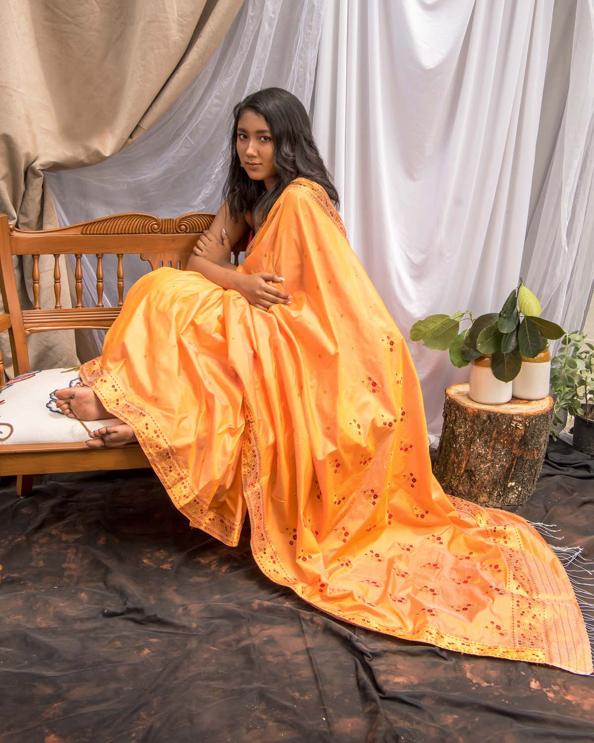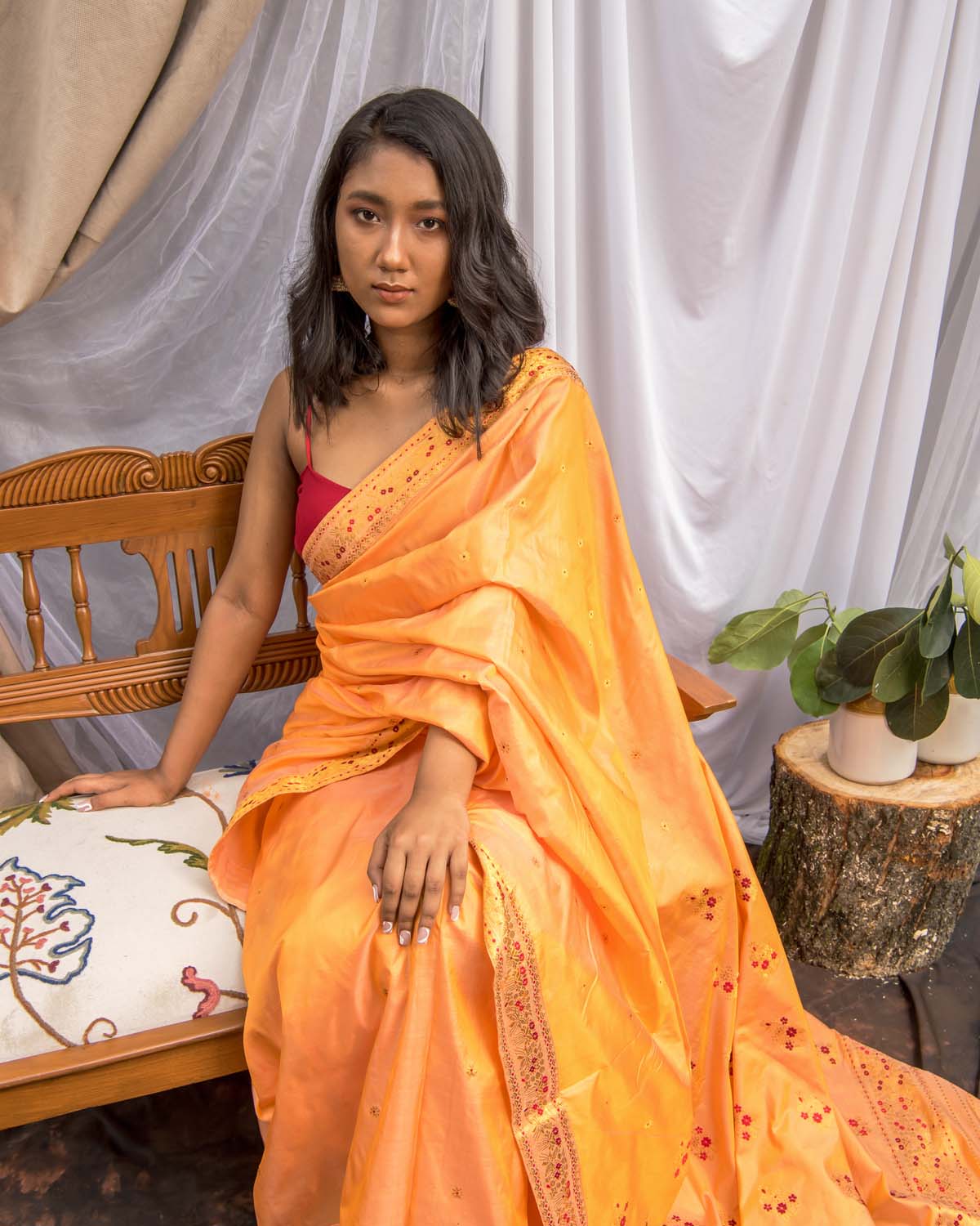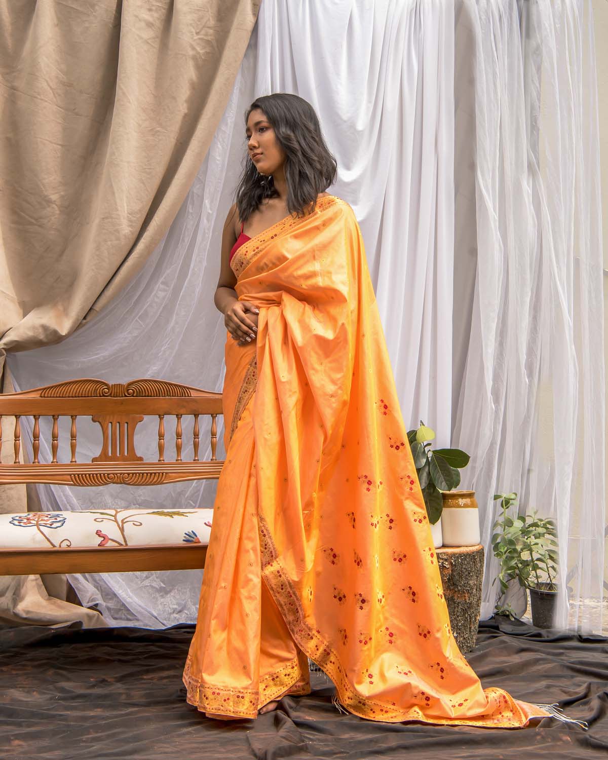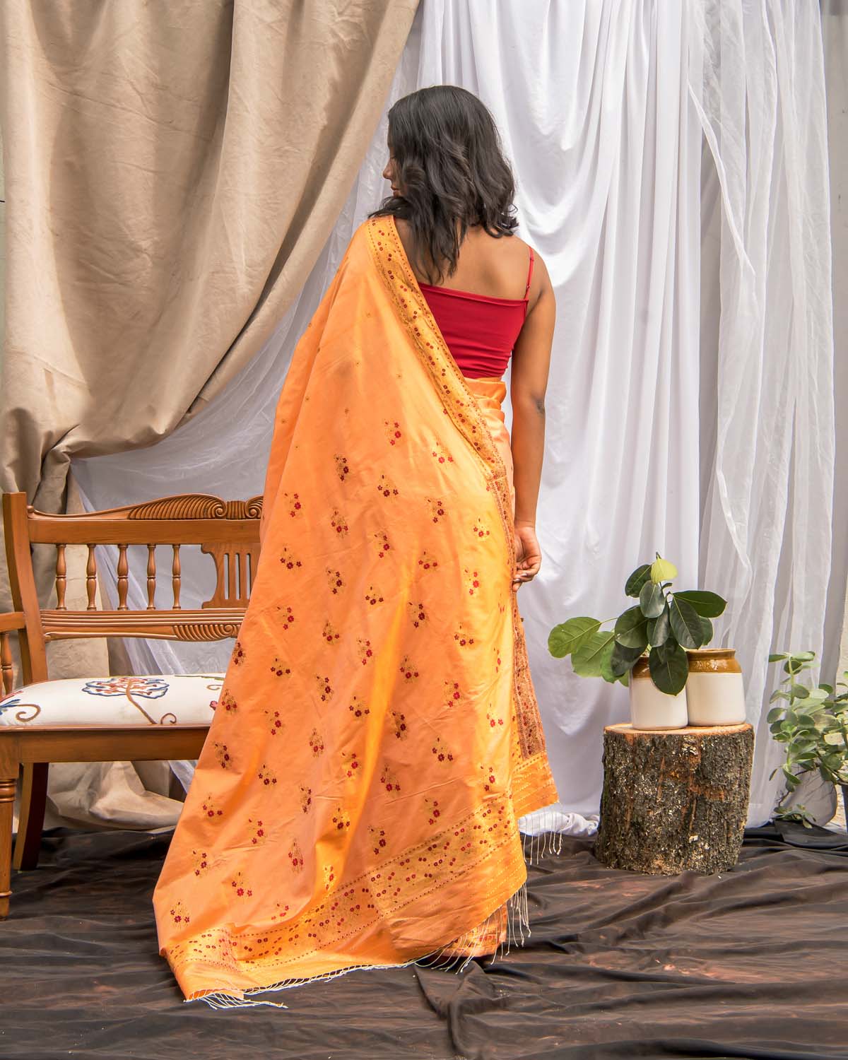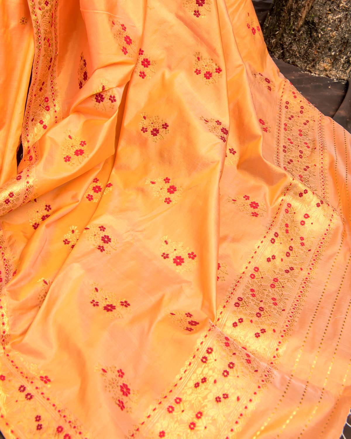 Nothing beats the mesmerizing beauty of our finely woven Kadamba orange paat/mulberry silk mekhela sador! This gorgeously crafted sador has a graceful design work with xewali phool all over the sador.