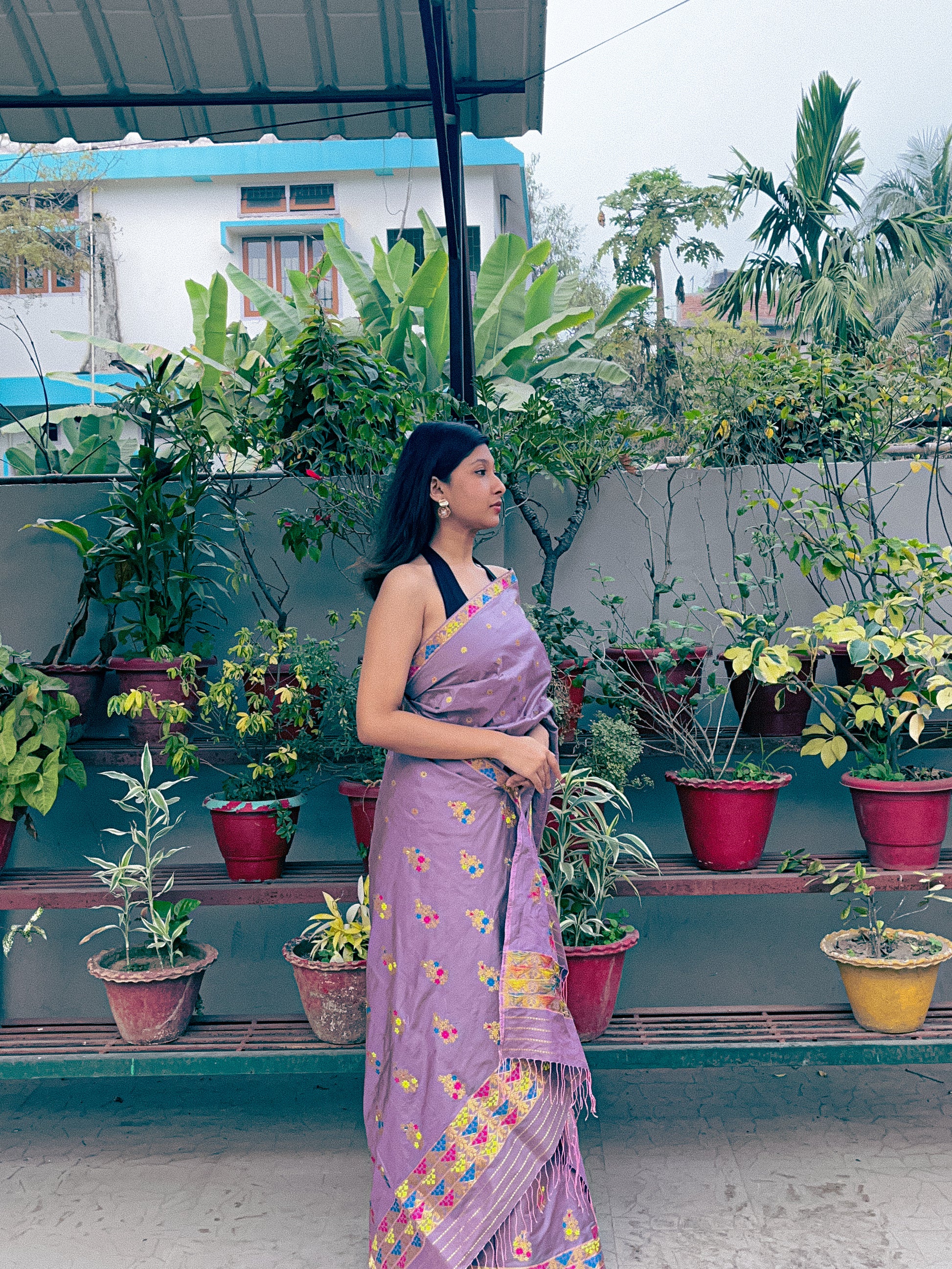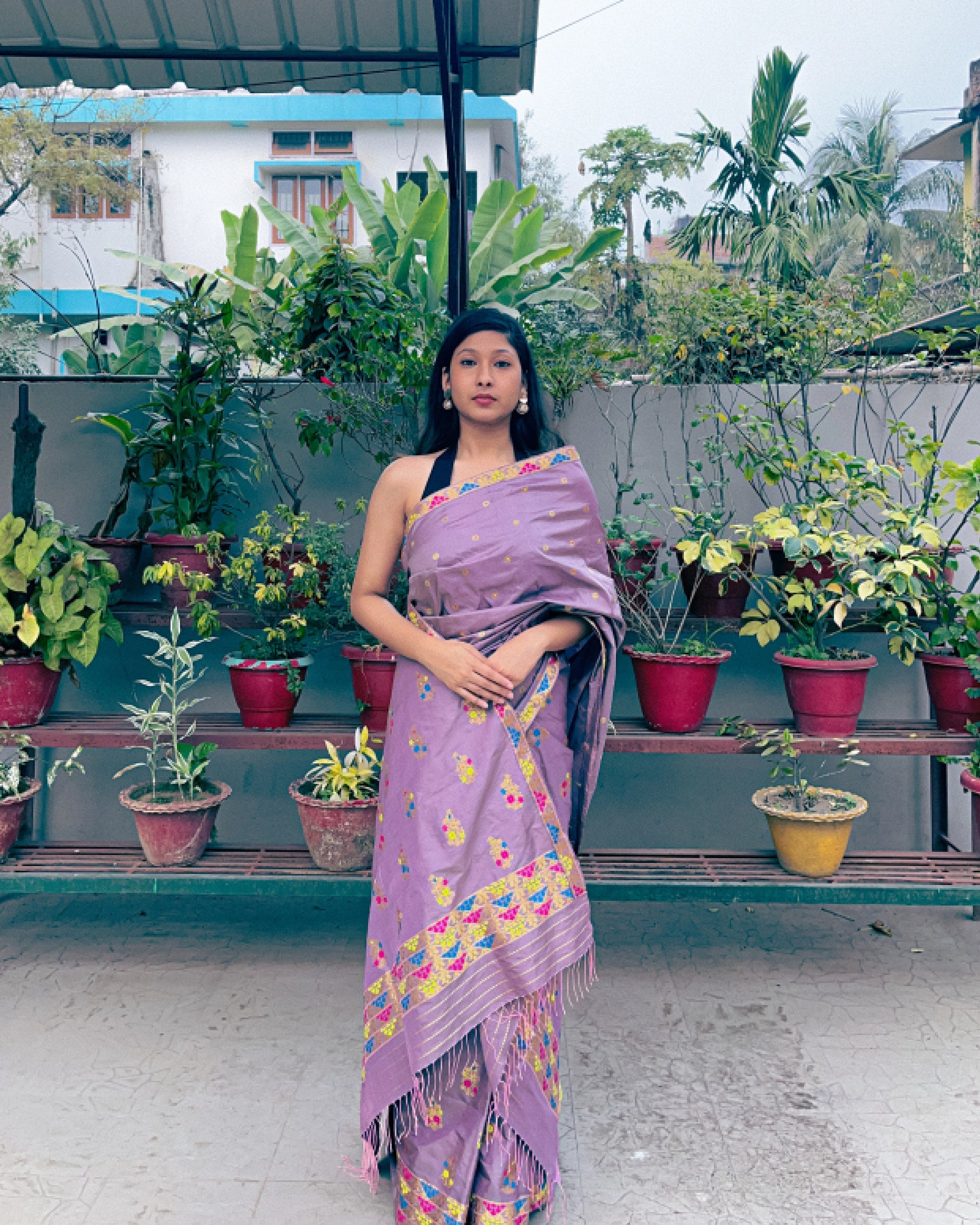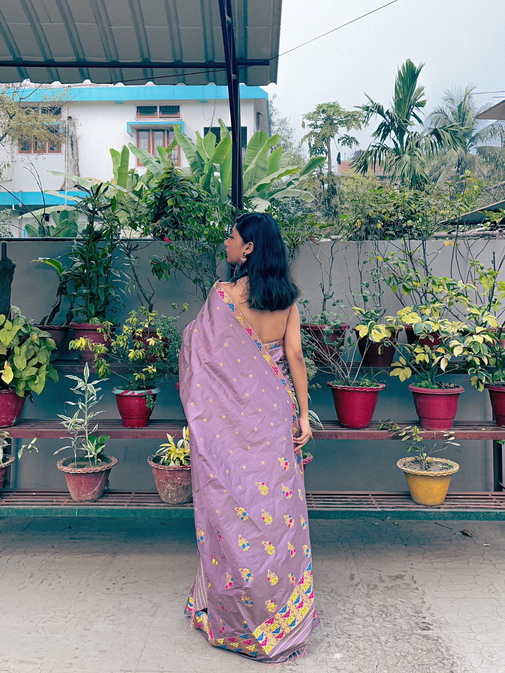 Kamesi’s warm blush-grey silk is anything but ordinary. The golden pahaar kaxhori border frames large, signature xewali bunches across the body, while accents of rani pink, yellow, and deep peacock blue meena bring a quiet boldness.