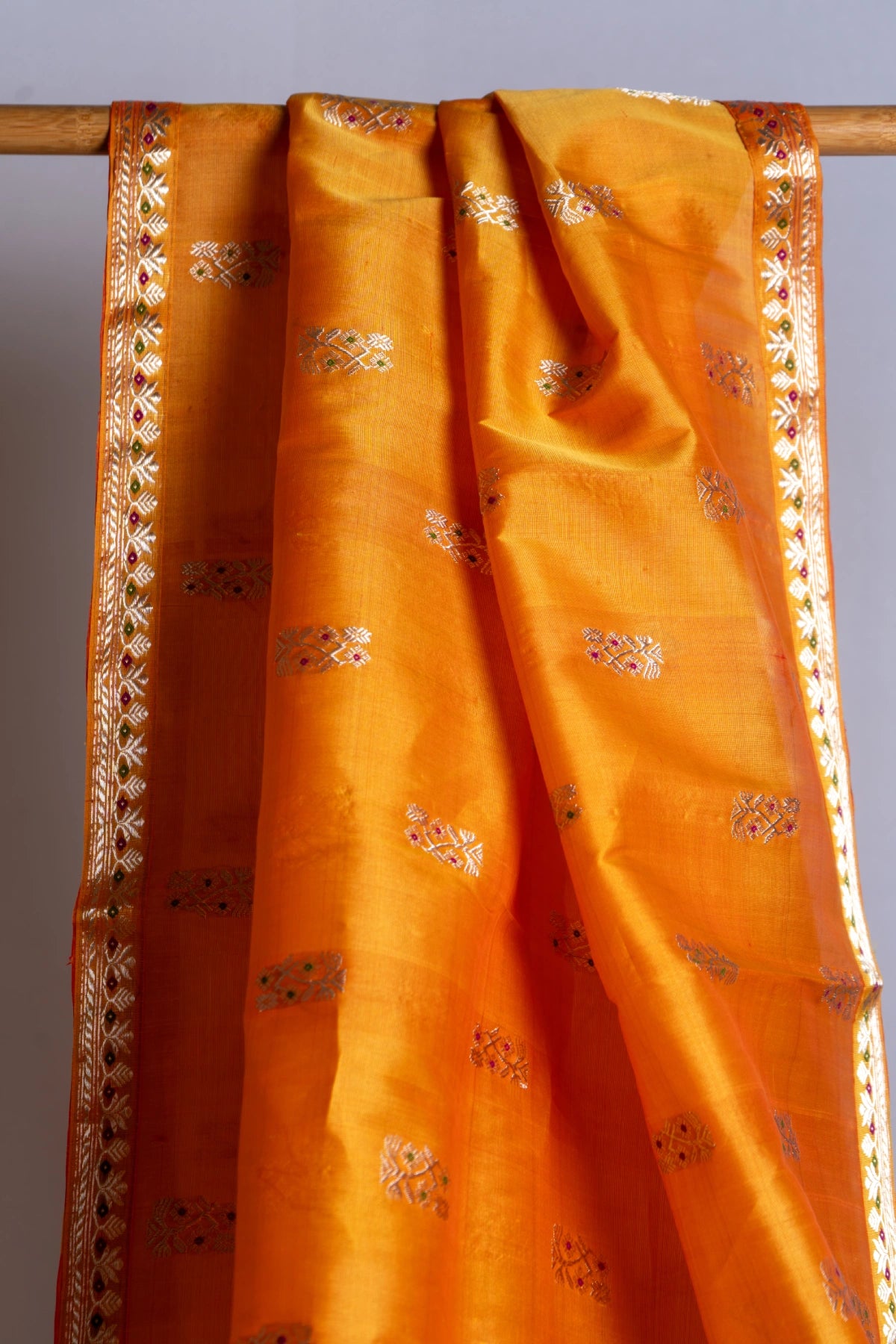 A warm golden-orange base, silver lotas blooming across the body, and a structured barfi border - Kezang is traditional with a twist. The playful meena in green and purple keeps it unexpected.
