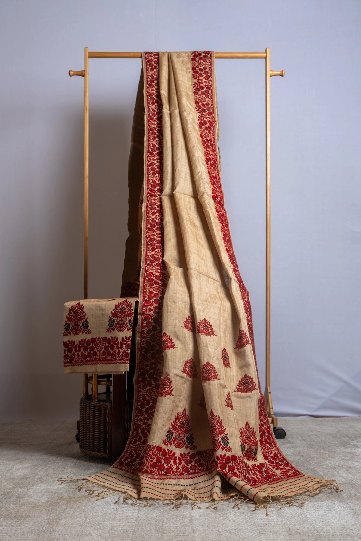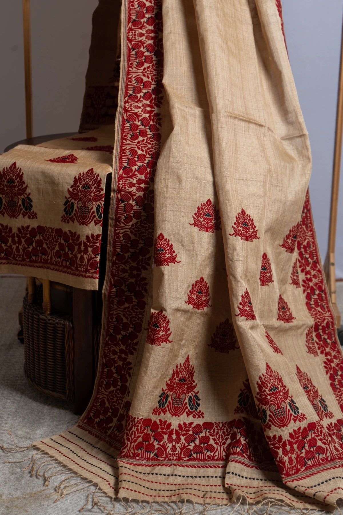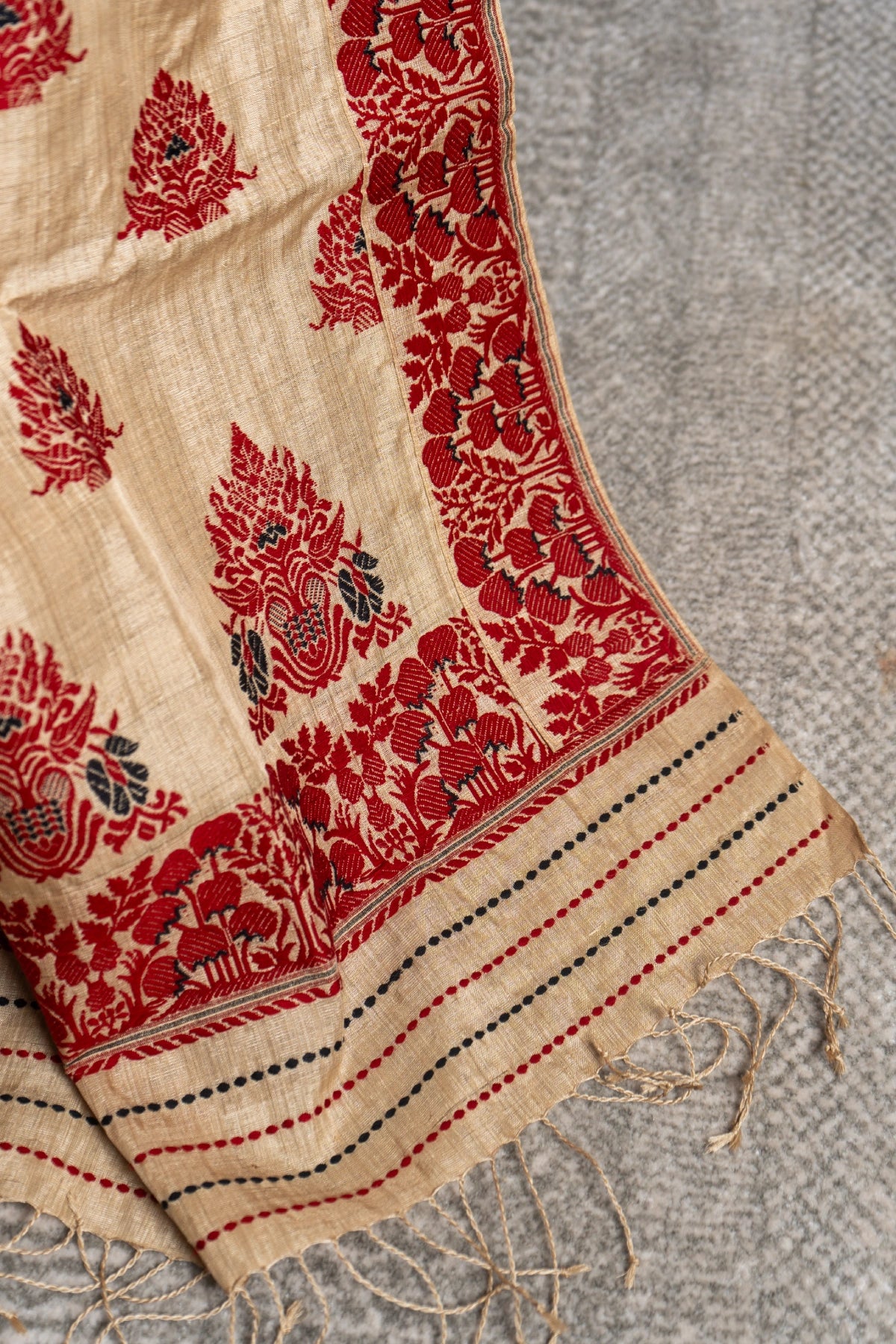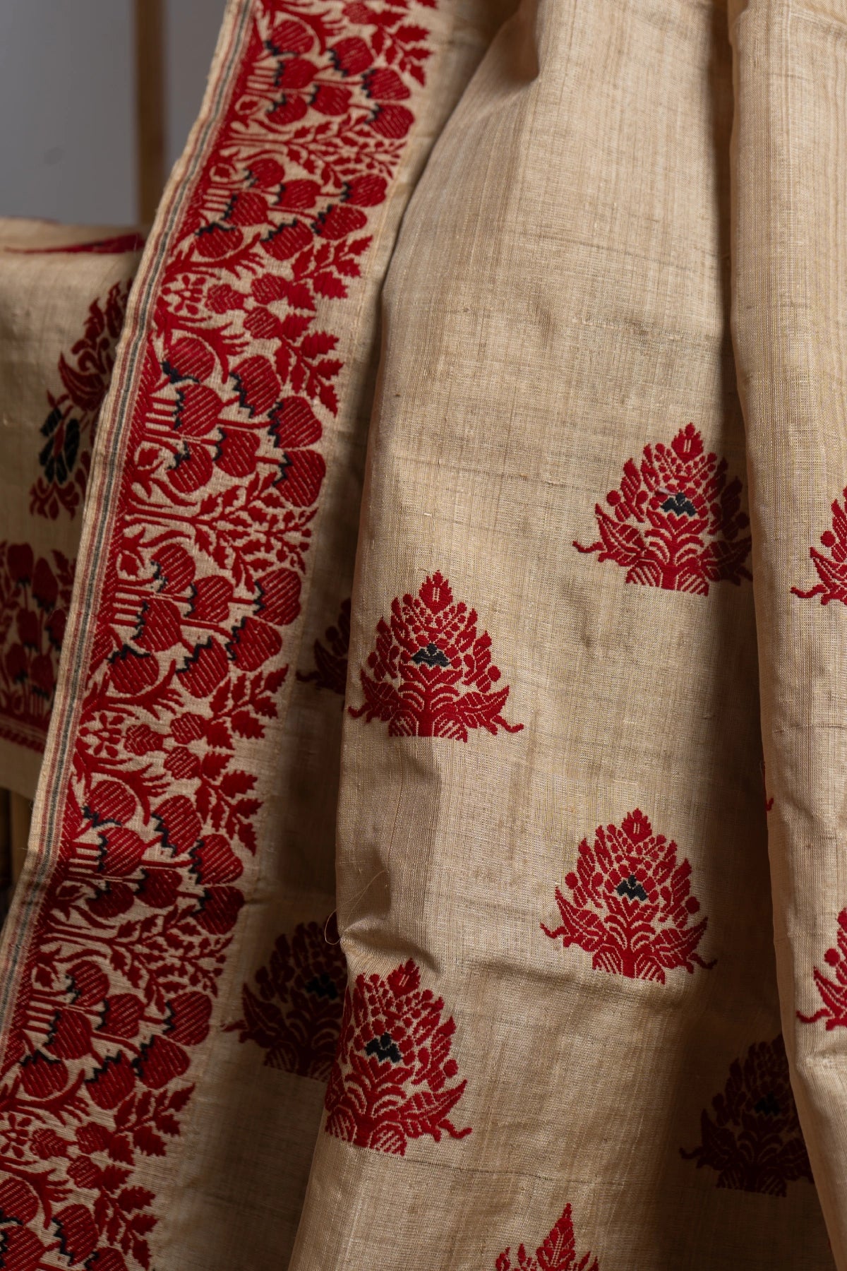 Woven on glowing Muga, deep red and black threads sketch out a floral motif passed down by Aita herself. Bouquets bloom along the border with vased florals and alternating blossoms appear across the body.