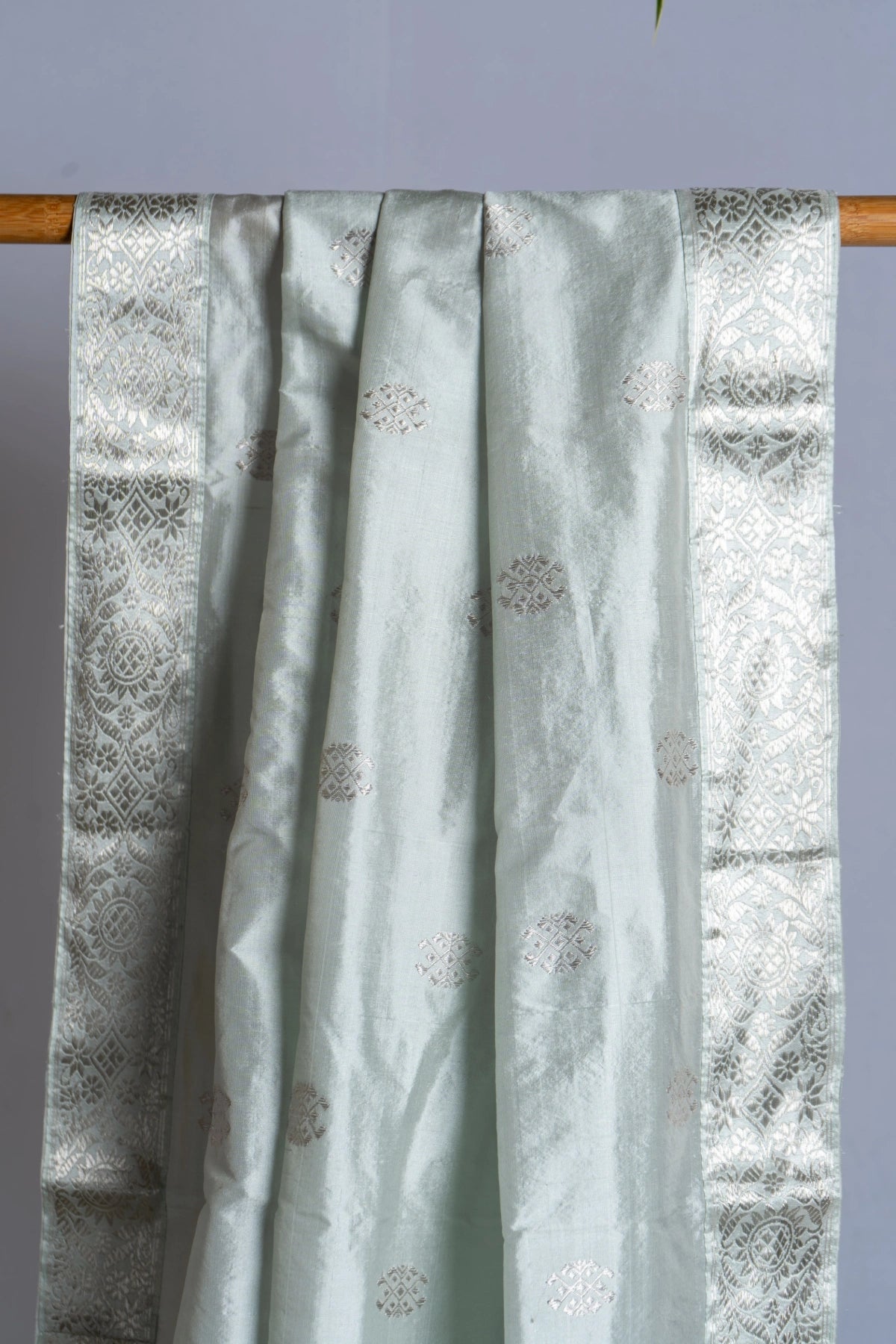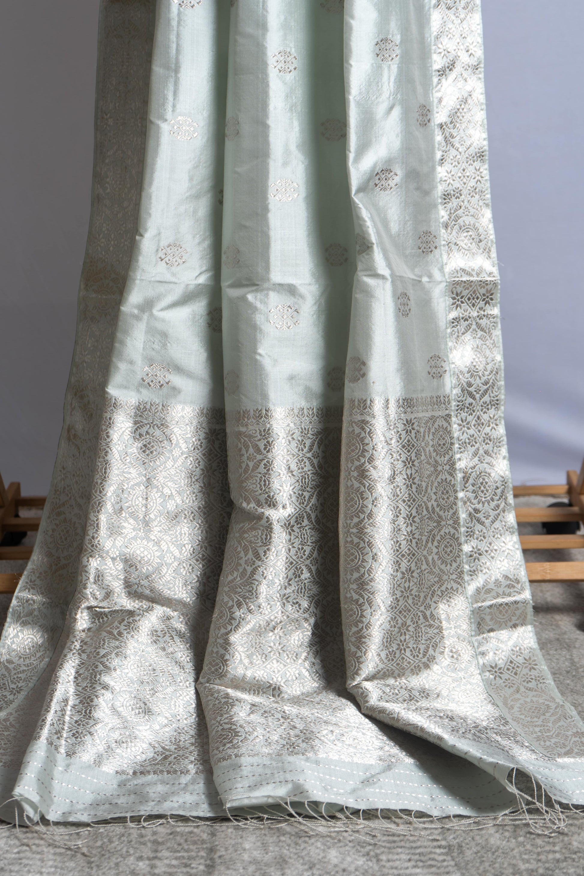 Silver-white guna threads glimmer across the body creating gul phools, framed by artistic creepers on the border.