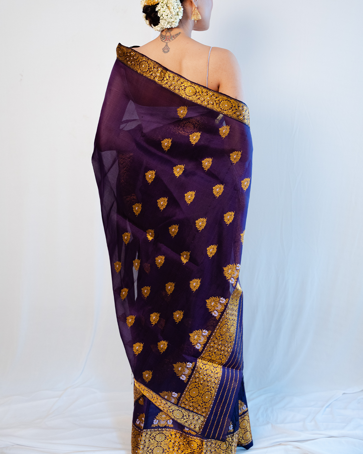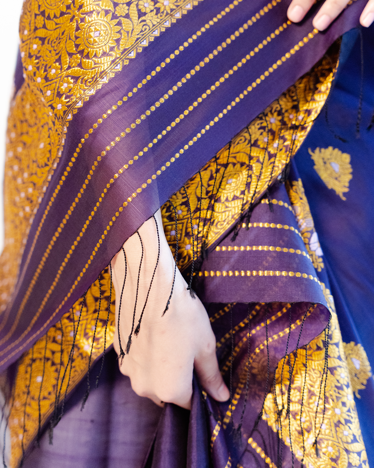 | Don’t store the mekhela sador in a plastic cover as this will cause the gold embroidery to turn black. |