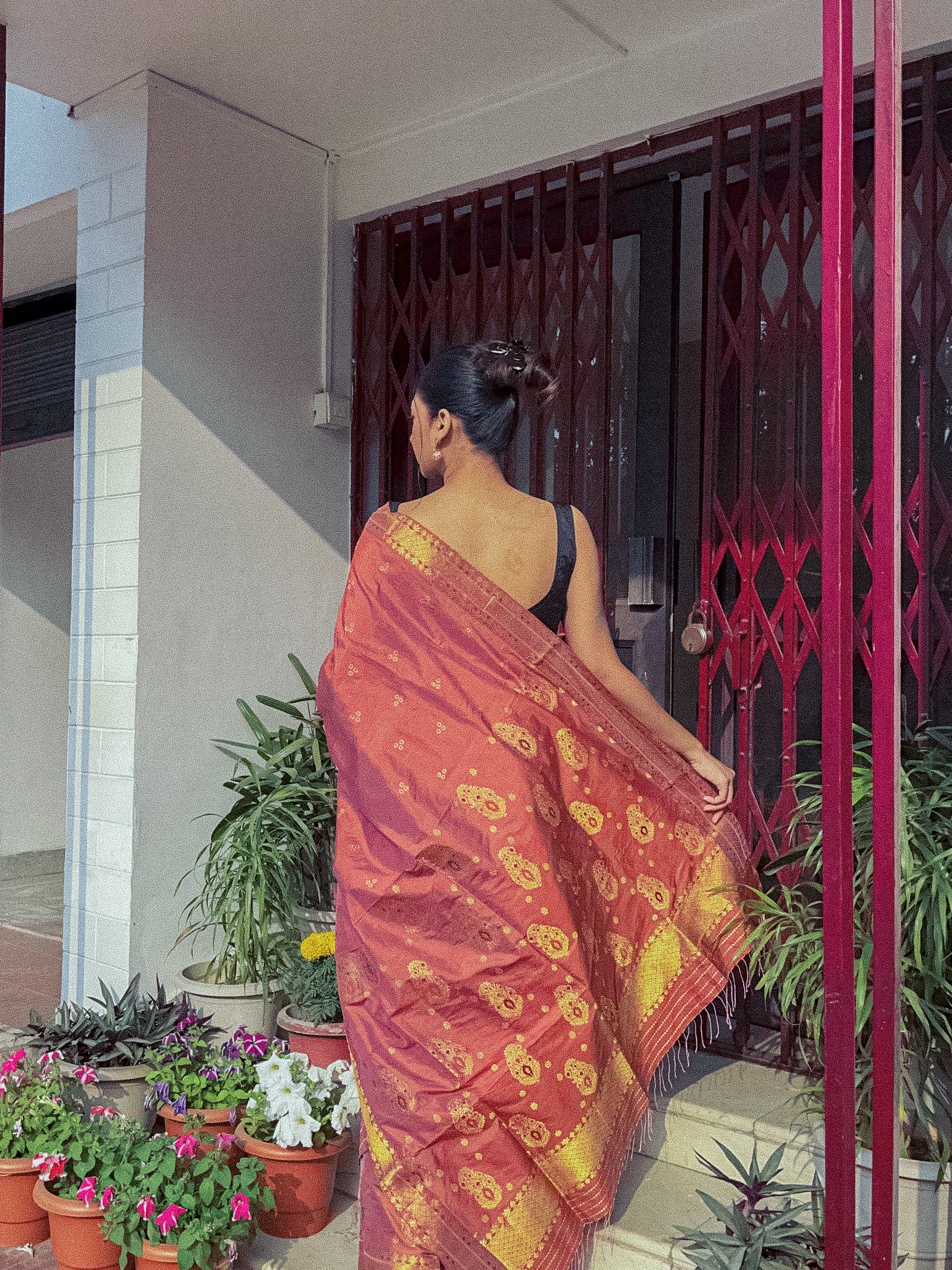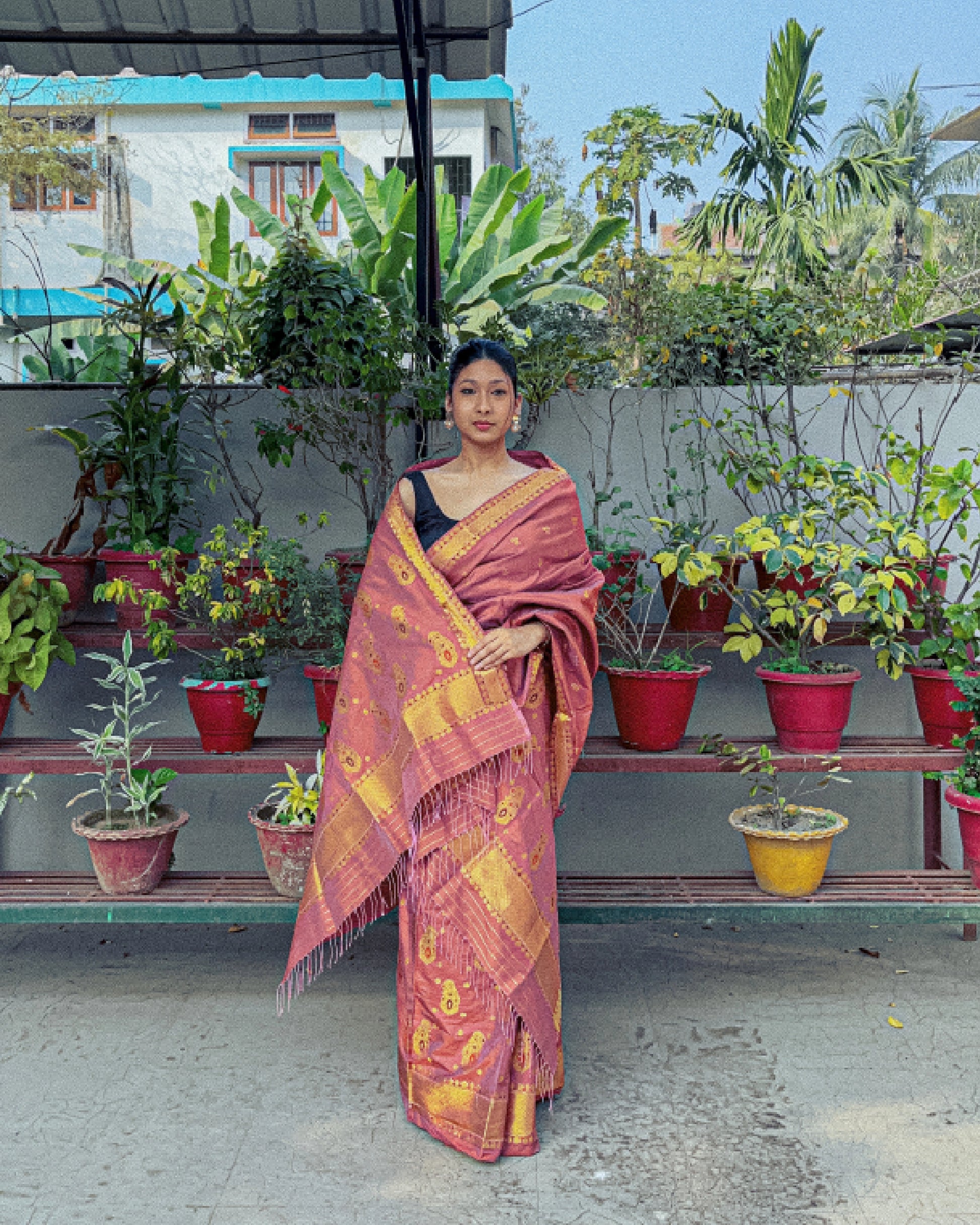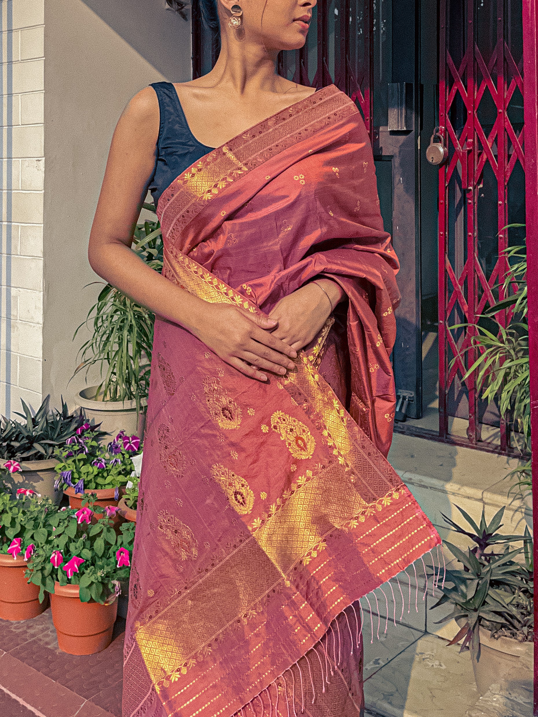 Mangalya’s pinkish-brown silk is effortlessly chic, with a tightly woven barfi border flanked by floral details. Gold kolkas and delicate traditional floral butas dance across the body, with a hint of brown meena for depth.