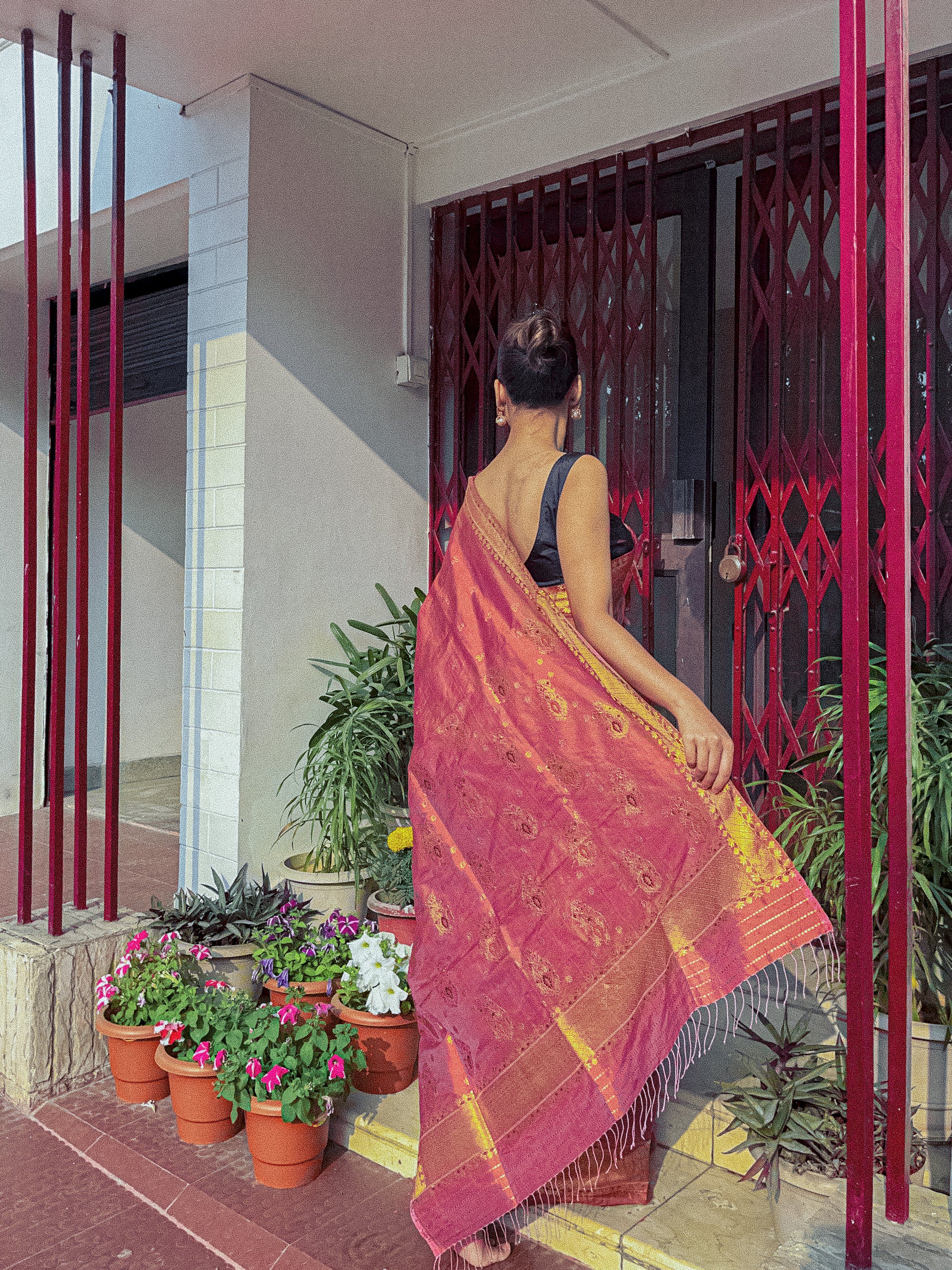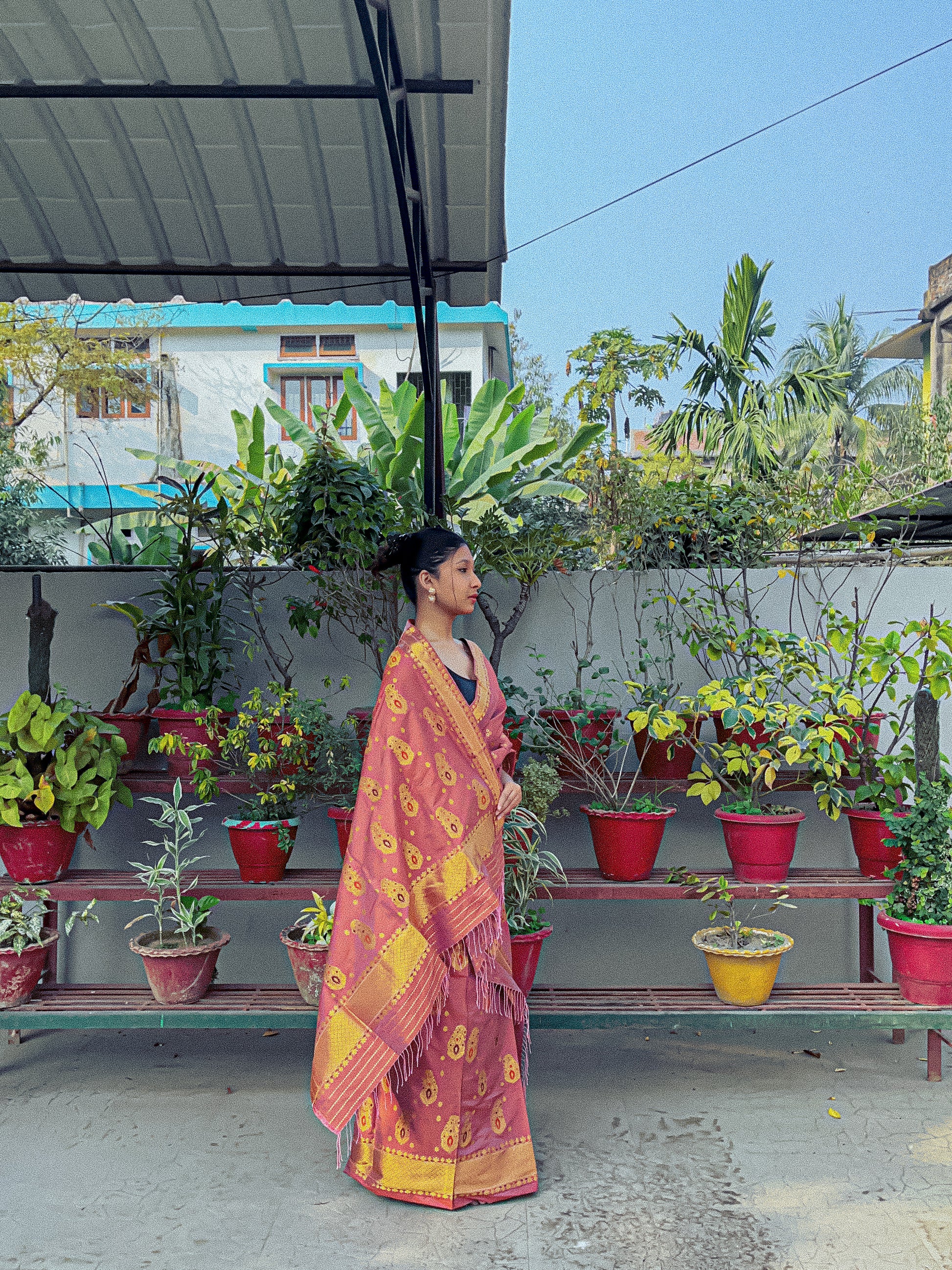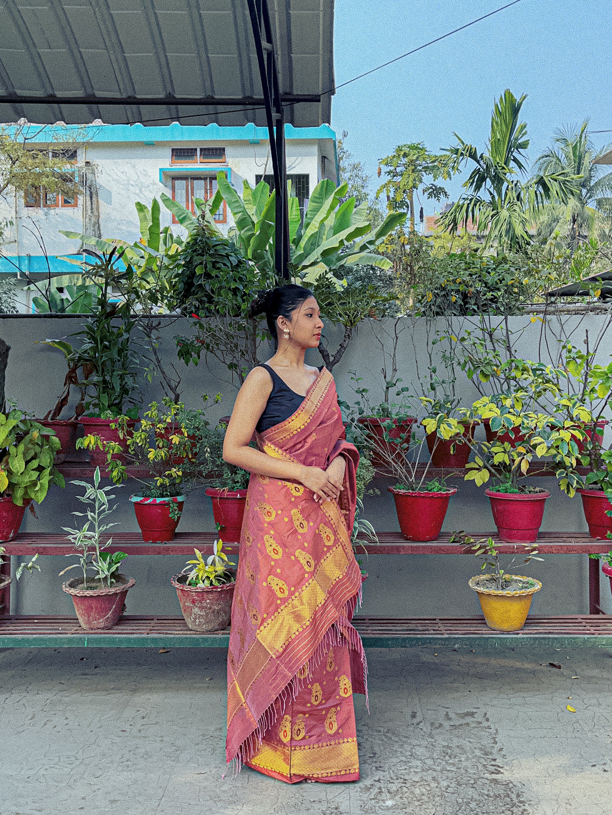 Mangalya’s pinkish-brown silk is effortlessly chic, with a tightly woven barfi border flanked by floral details. Gold kolkas and delicate traditional floral butas dance across the body, with a hint of brown meena for depth.