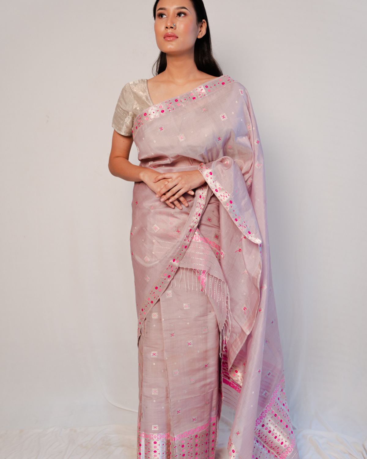 Radiating sheer grace is our Nadira kesa paat/mulberry raw silk mekhela sador in a classic shade of mauve that is intricately accentuated with box like motifs with silver guna and pink-shaded meena and small circular silver zari motifs over the body.