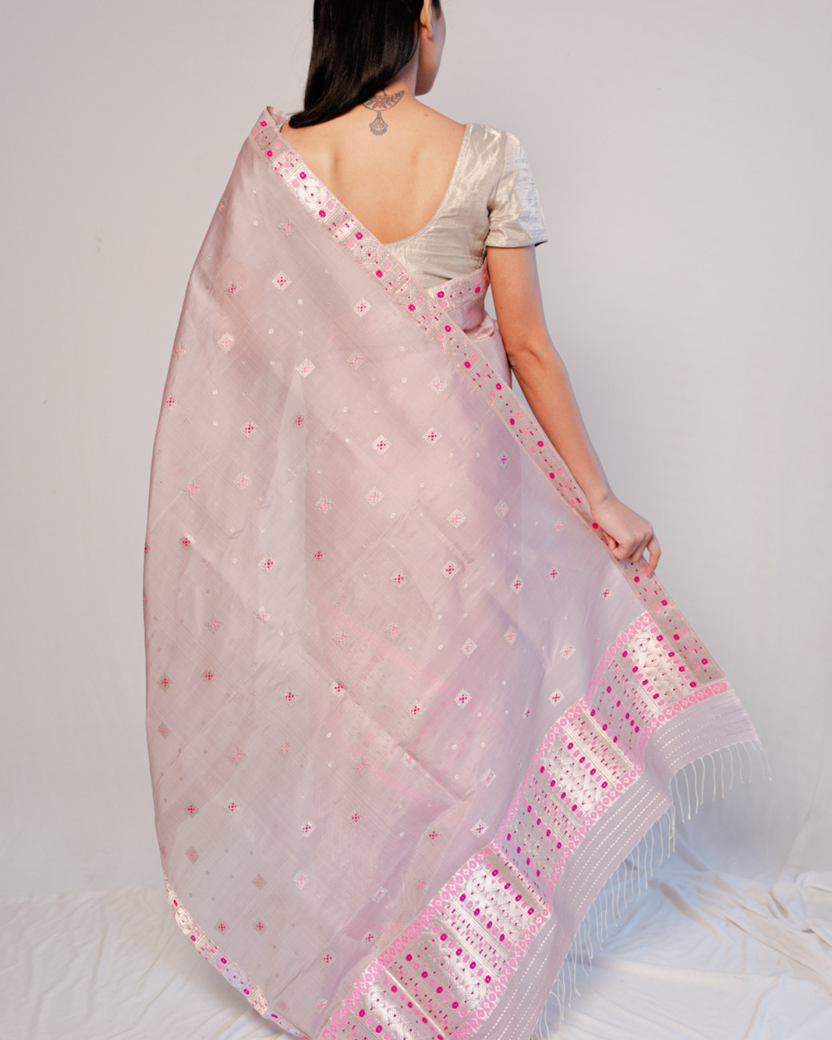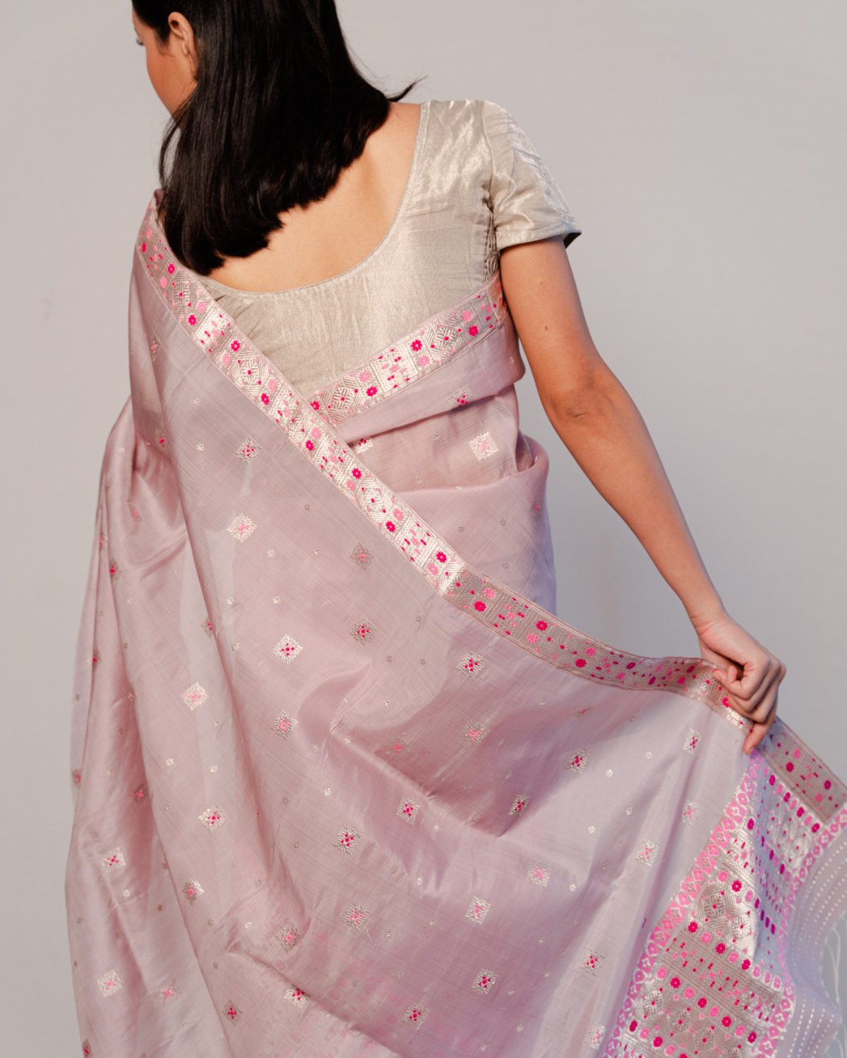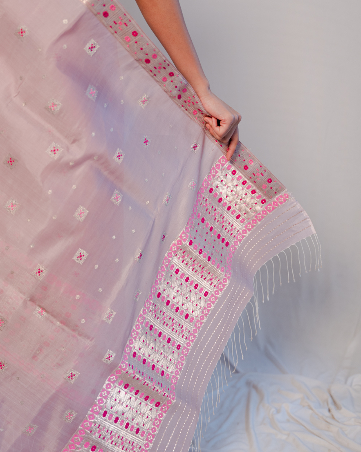 The mekhela is immaculately bordered with aahom miri phool and kahori buta of silver guna, light-pink and dark-pink hues.