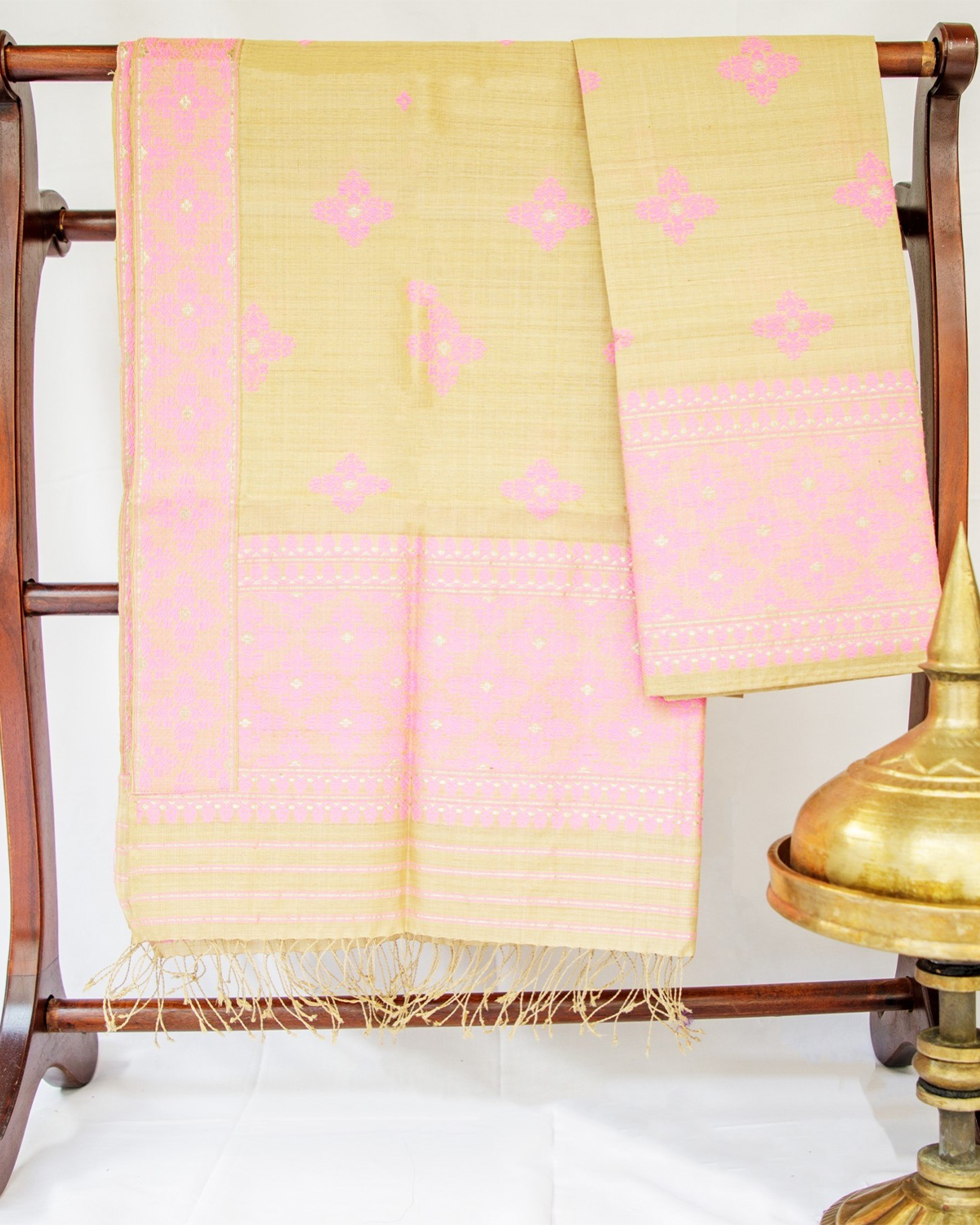 Prajanma Yellow Haze-Pink Muga Silk Mekhela Sador