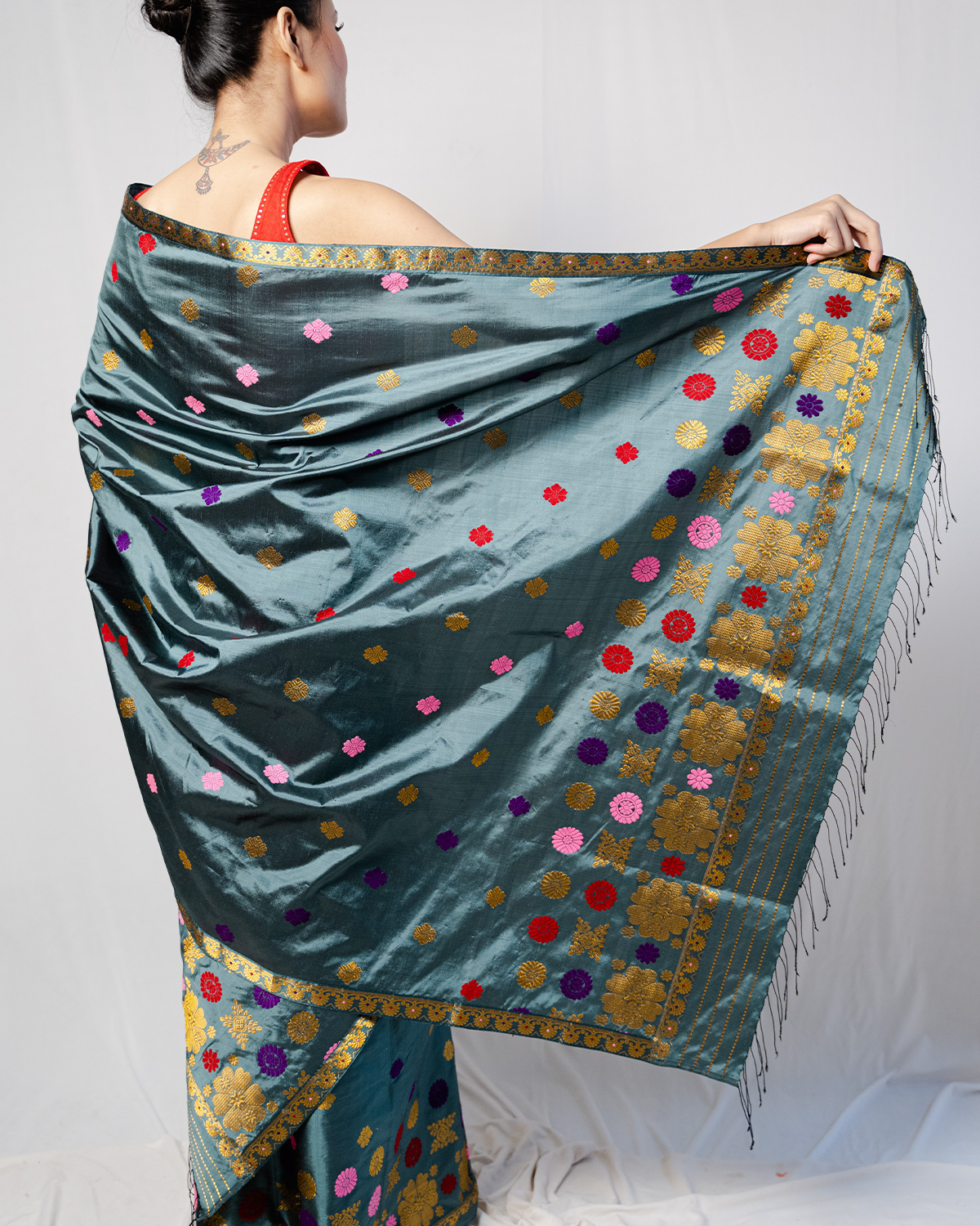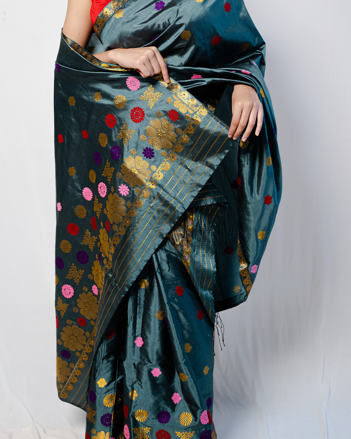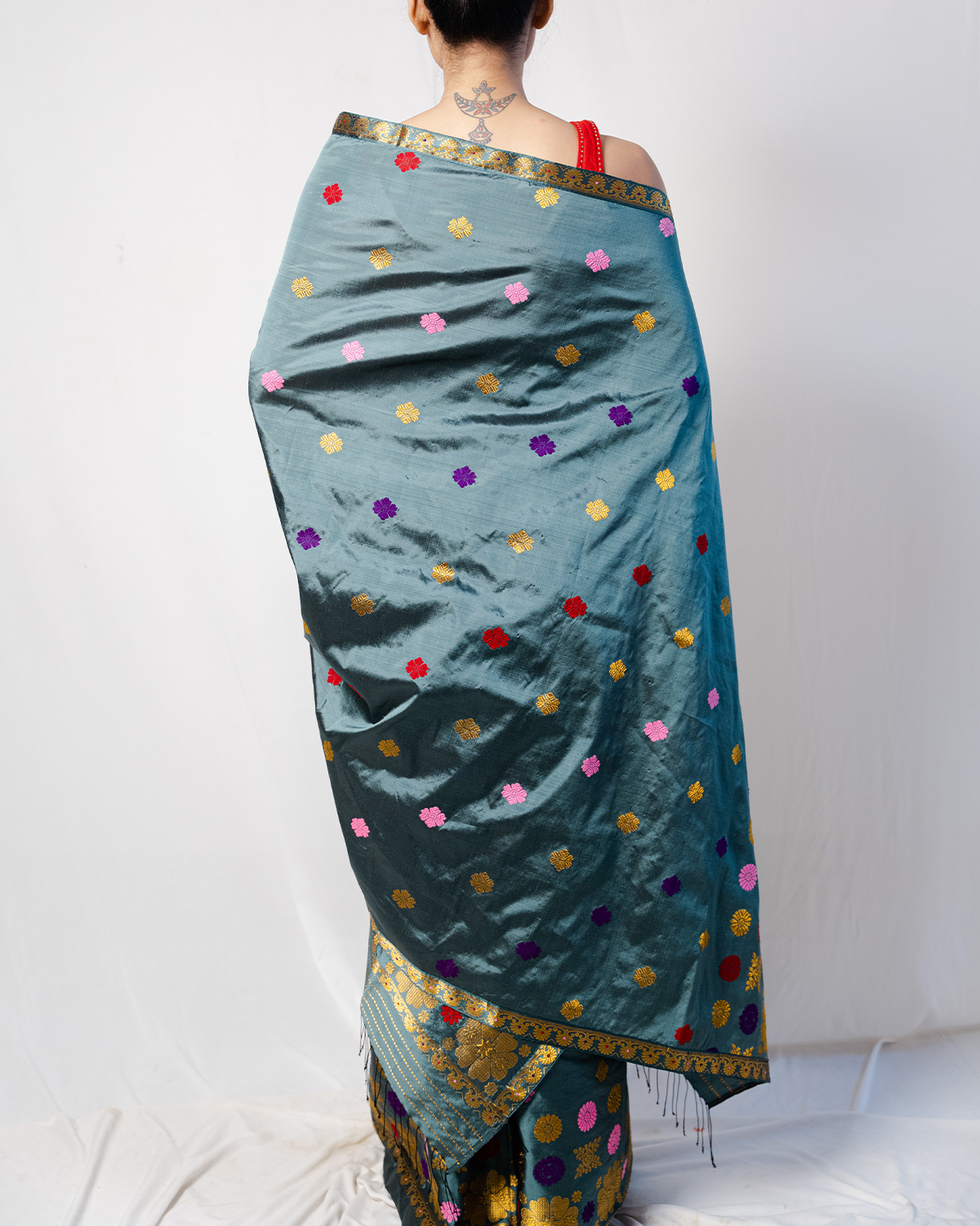Prakriti Ocean Blue Green-Multicolored Paat Silk Mekhela Sador