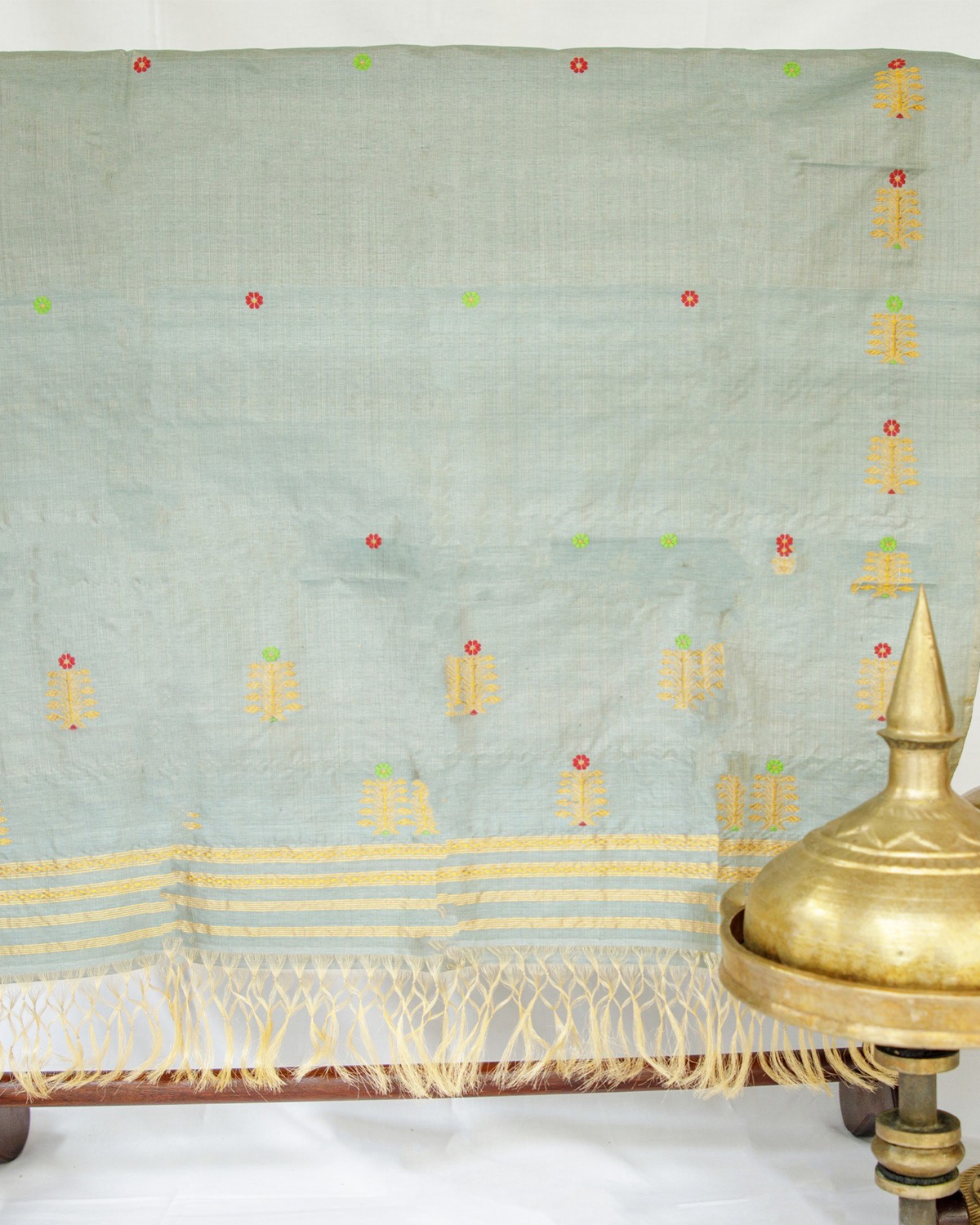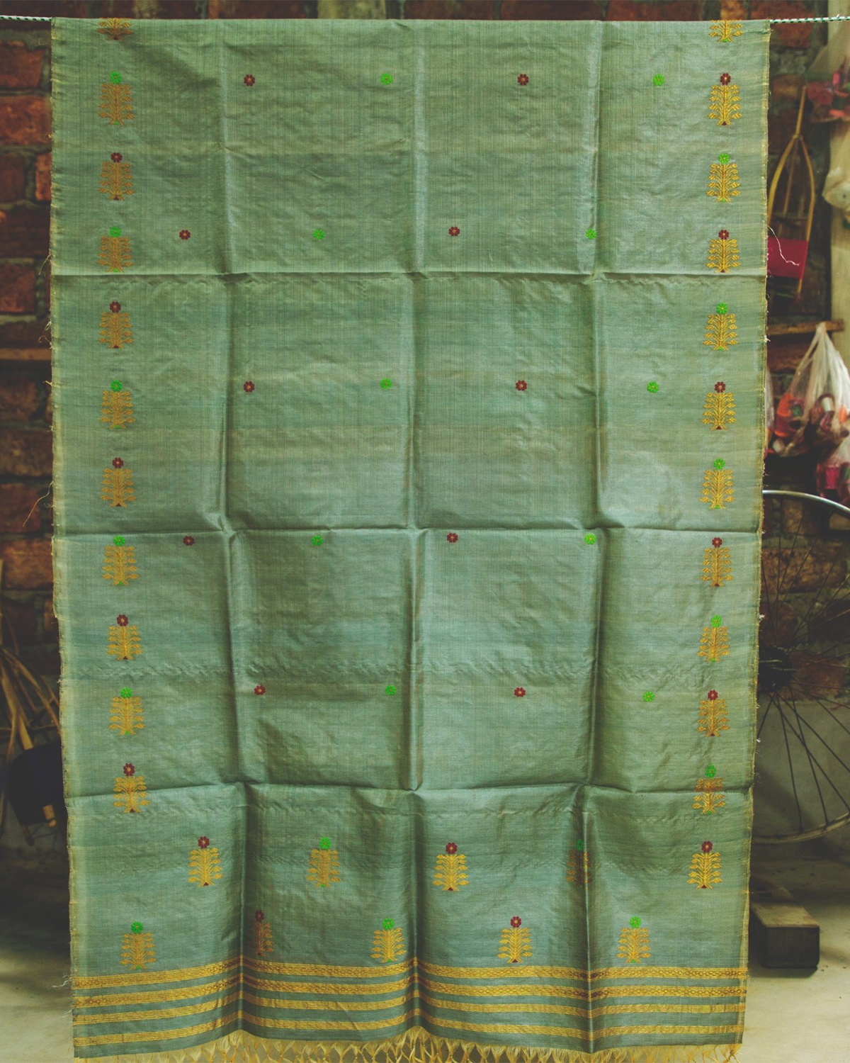 The art of weaving is the lifeblood of Assam. It is the heritage that our ancestors passed on to their daughters and granddaughters. Similarly, inspired by the apparel of the royal families of Assam, we created this Rajgharana green-gold tussar silk dupatta. Highlighted with intricate gosa buta in guna with red and green circle meena work, this dupatta brilliantly expresses the elite of Assam.