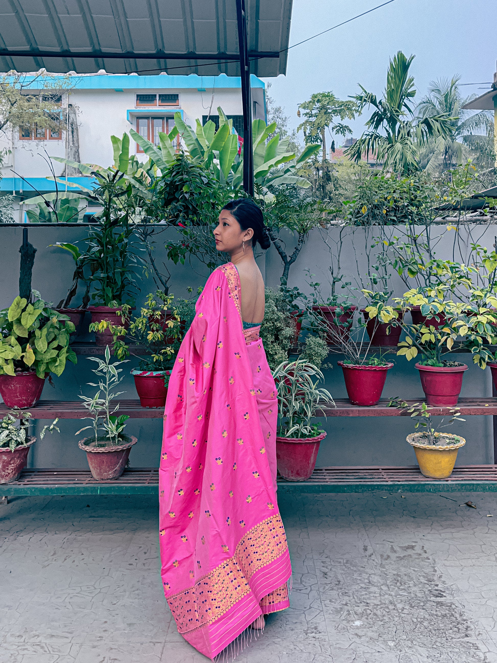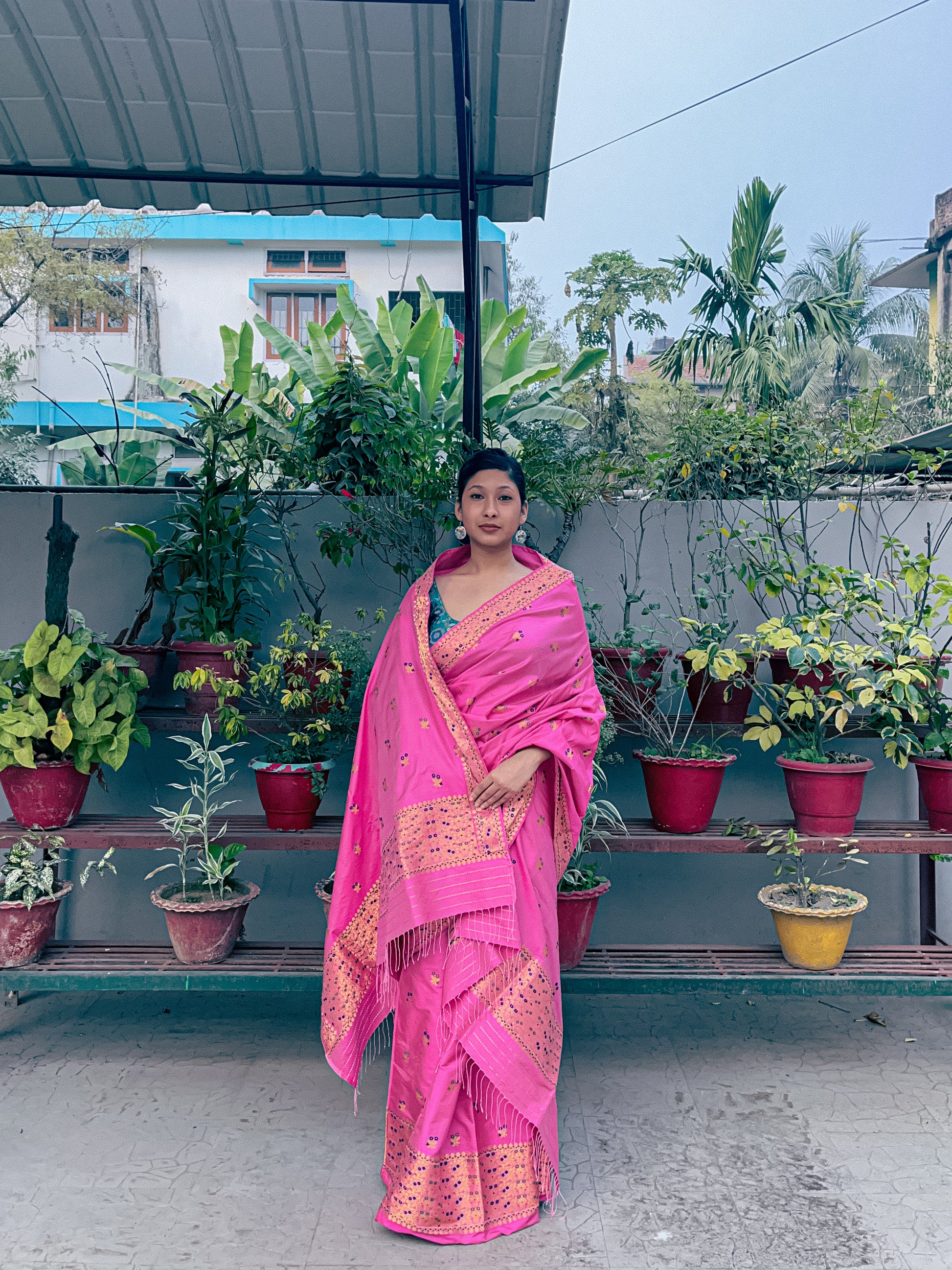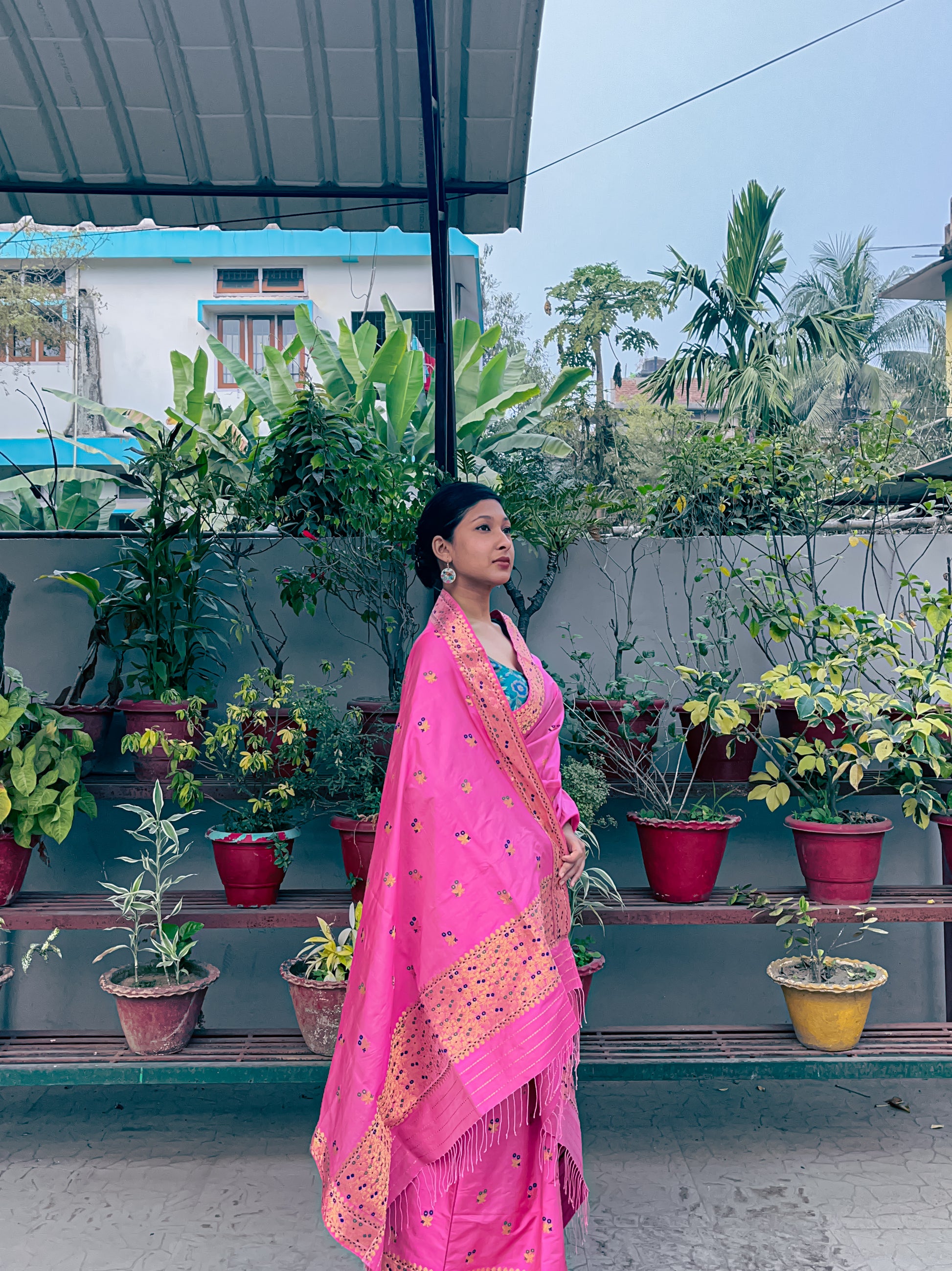 Rasika’s radiant pink silk gets a lively upgrade with golden xewali phool motifs, traced with vibrant green and blue meena for contrast. The border blooms with the same signature floral touch, creating a piece that’s modern yet deeply rooted in Assamese tradition.