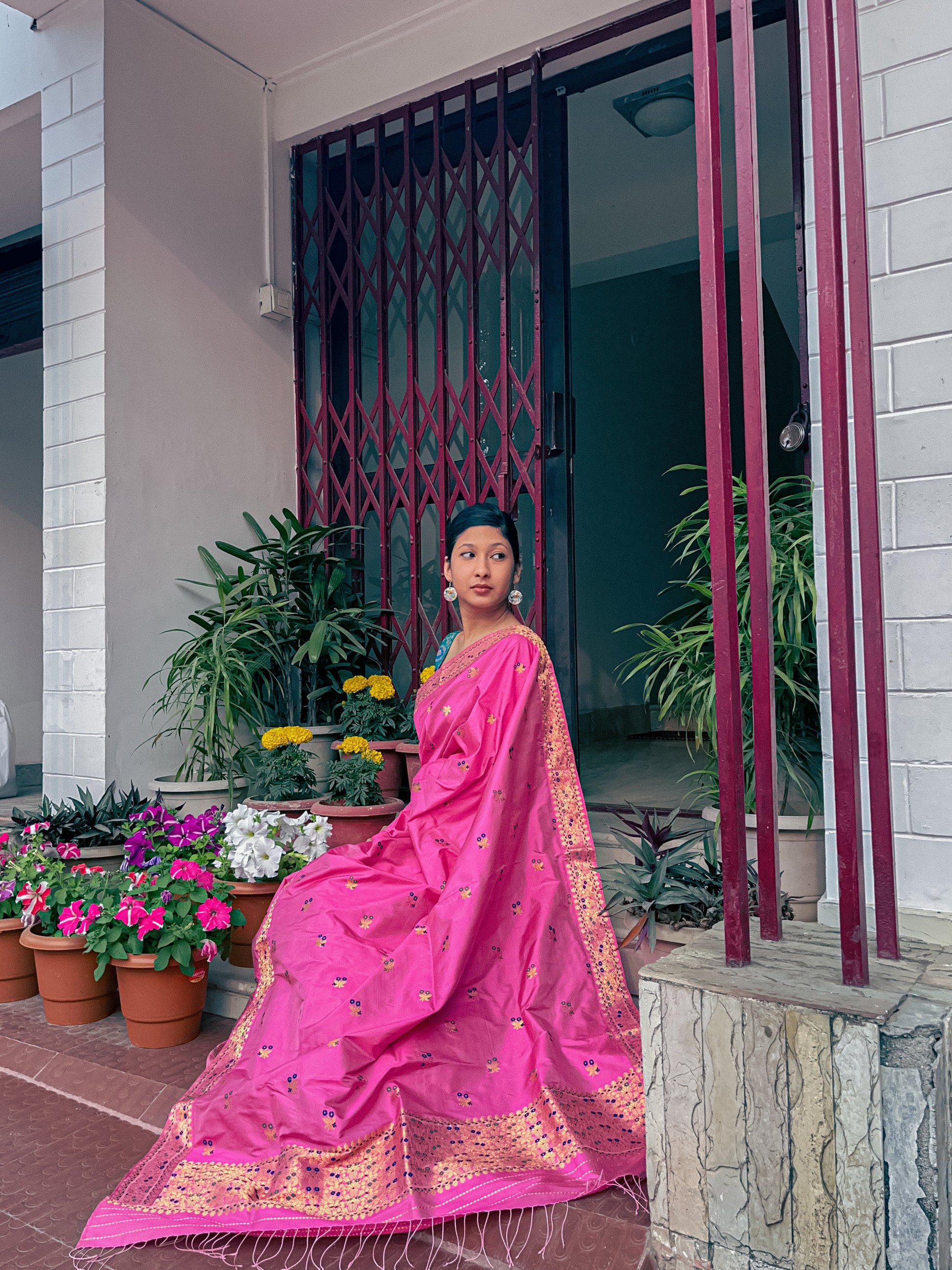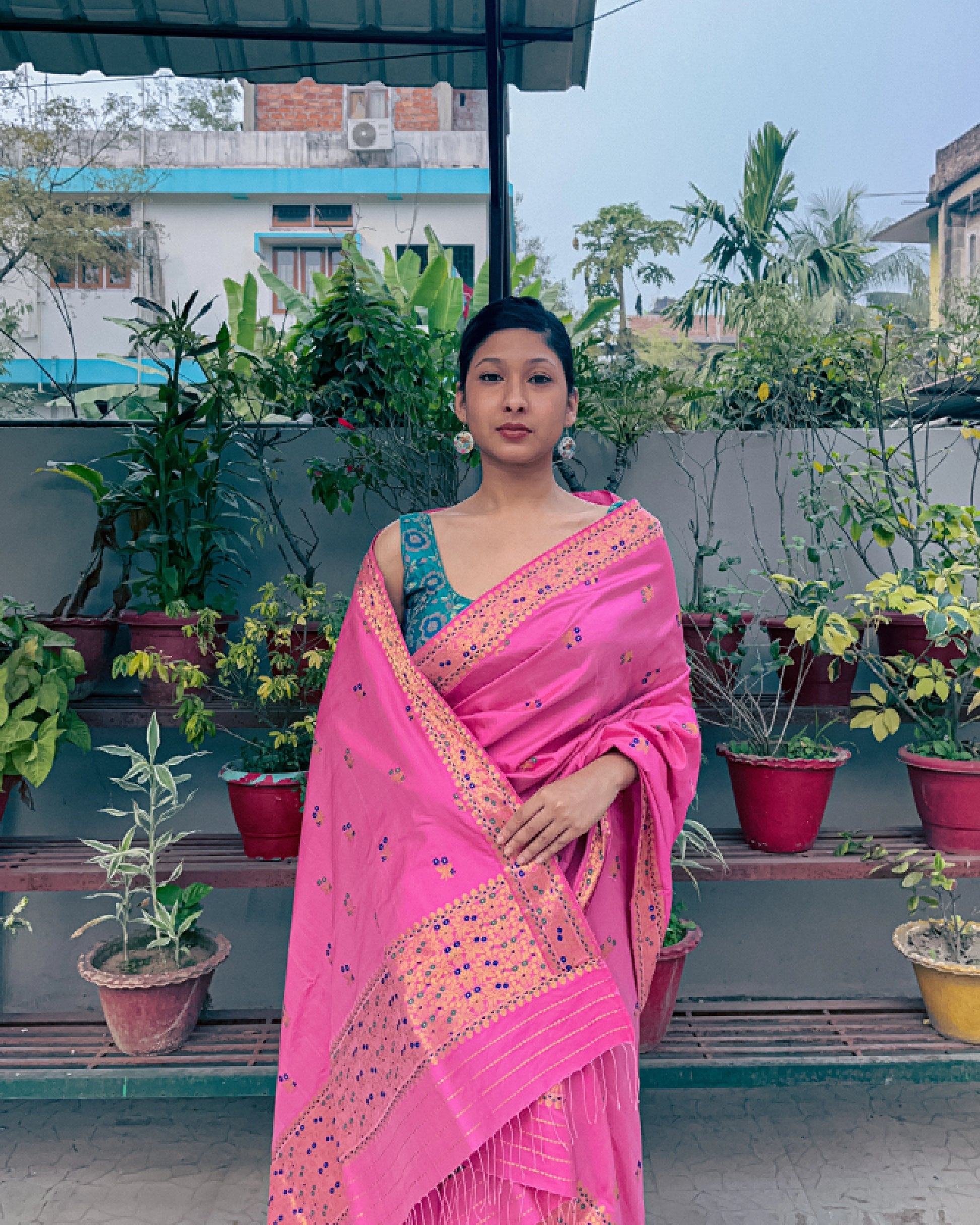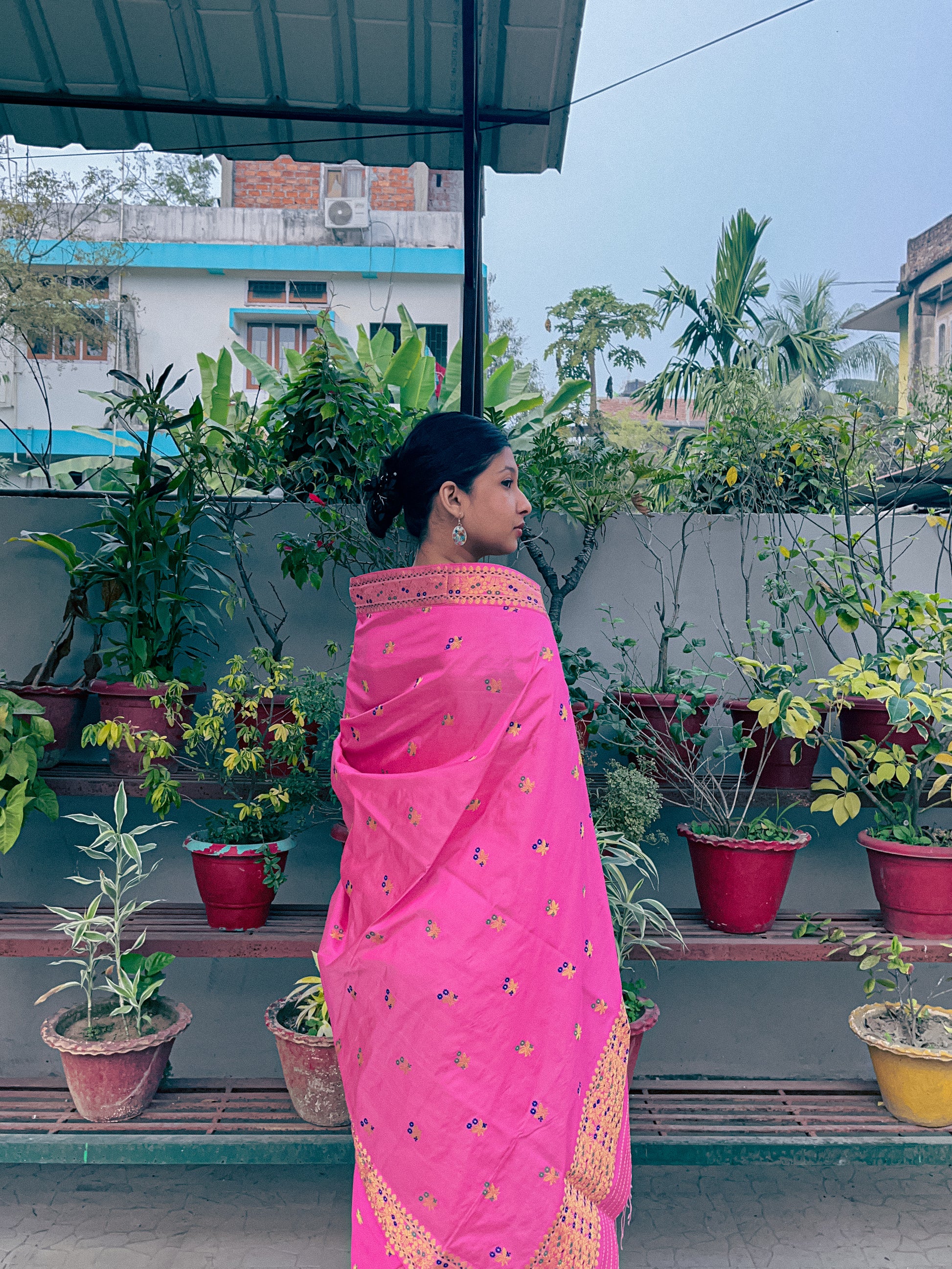 Rasika’s radiant pink silk gets a lively upgrade with golden xewali phool motifs, traced with vibrant green and blue meena for contrast. The border blooms with the same signature floral touch, creating a piece that’s modern yet deeply rooted in Assamese tradition.