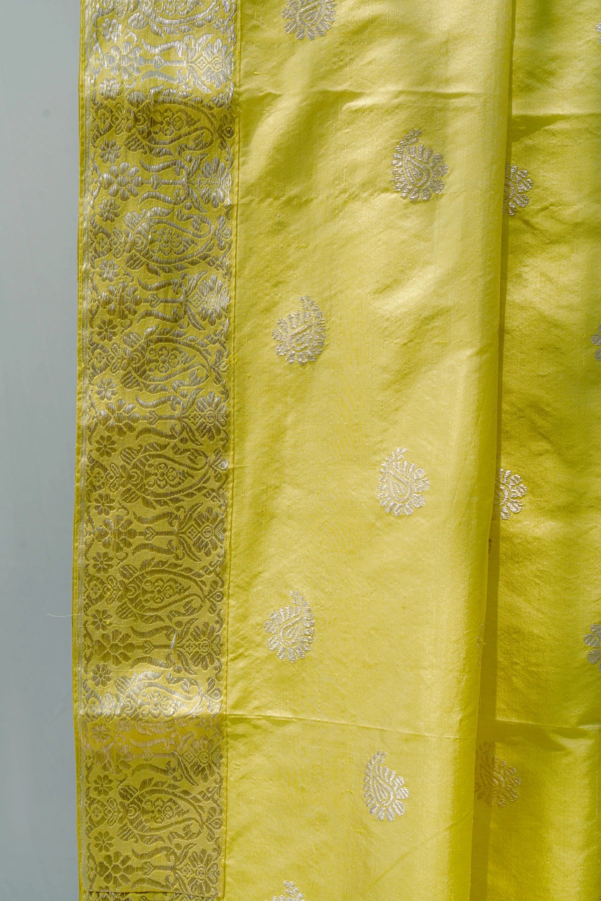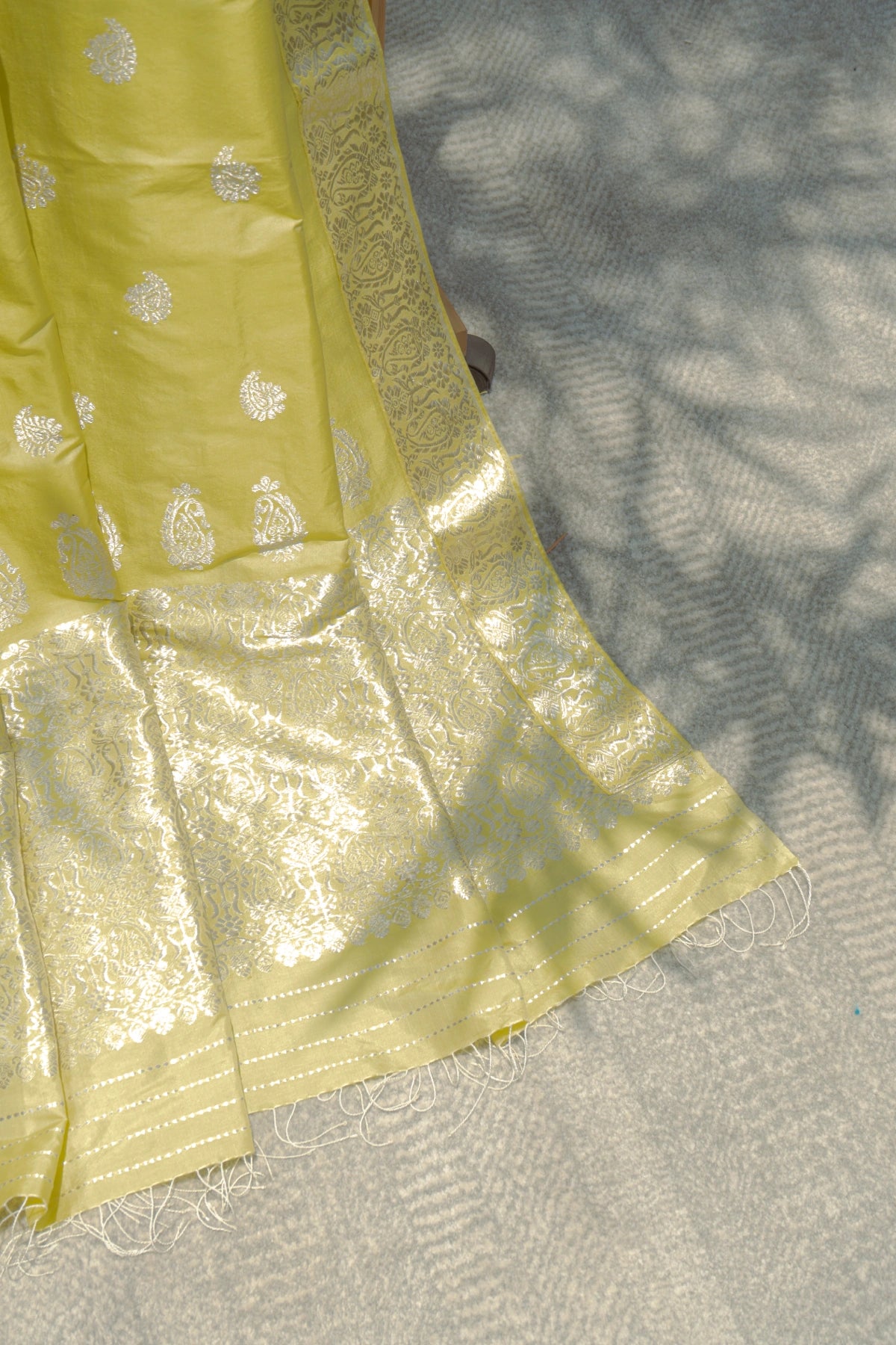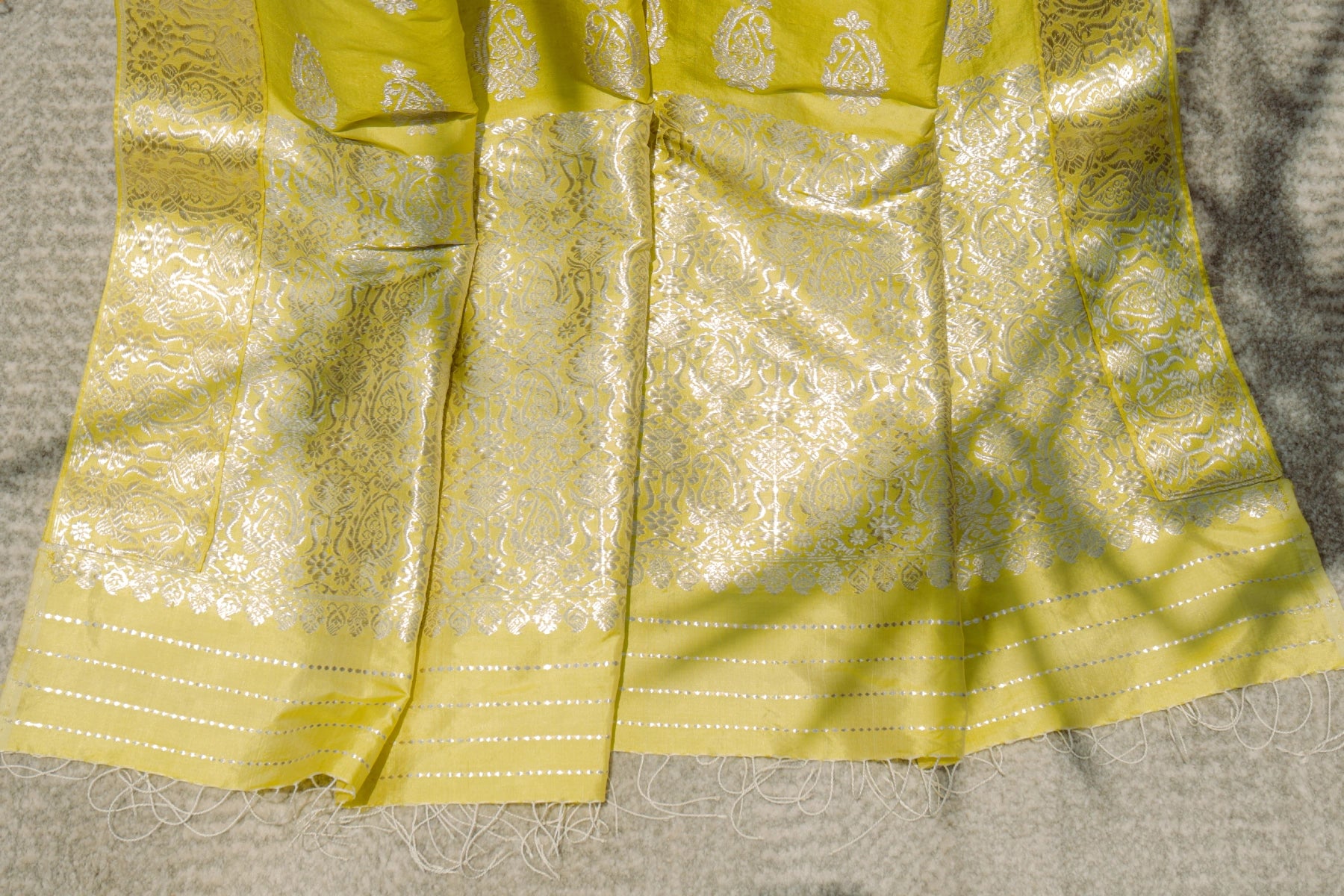 Sangi's pastel yellow paat silk feels like sunlight that's gentle and full of charm. Light silver guna threads shimmer across the body, with graceful kolka phool motifs trailing across the border and aanchal. The design is soft yet striking, with just the right amount of tradition and whimsy.
