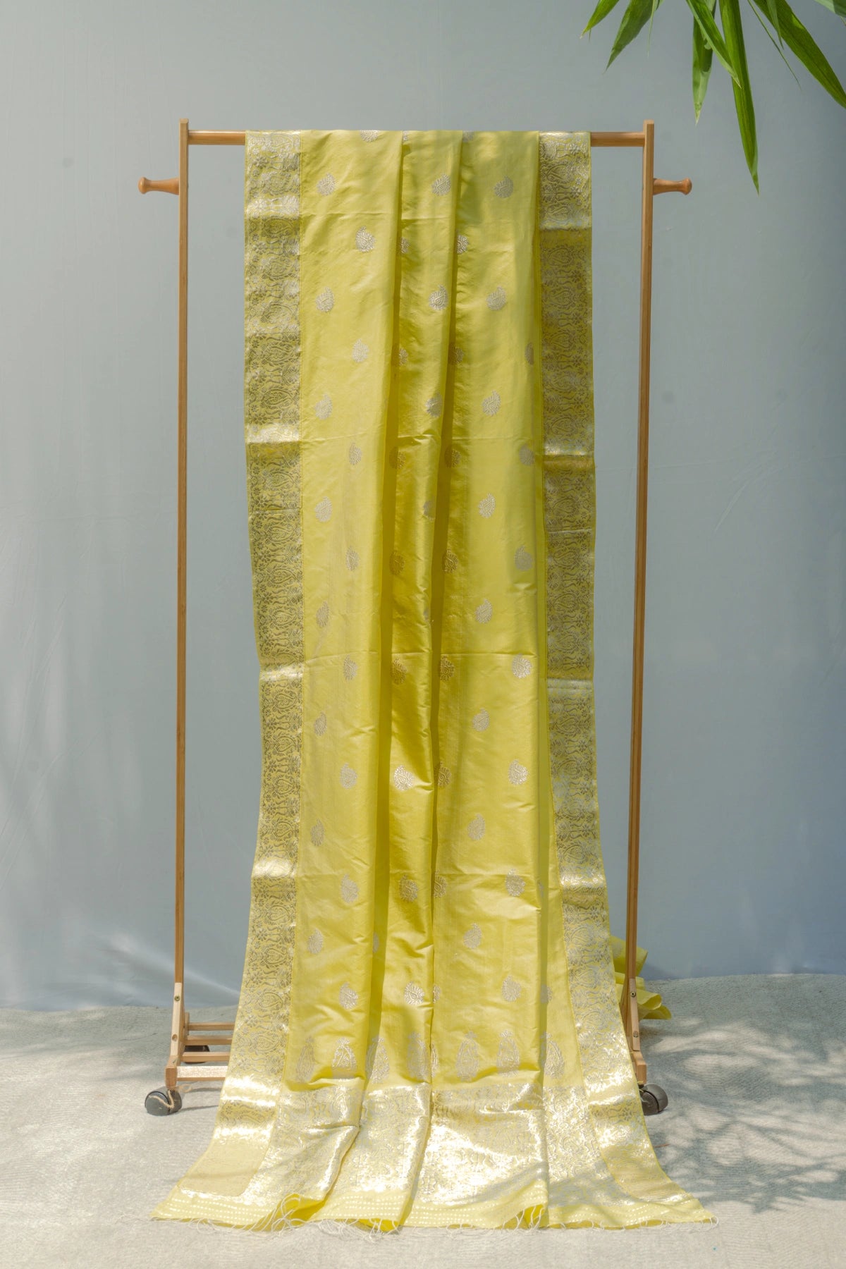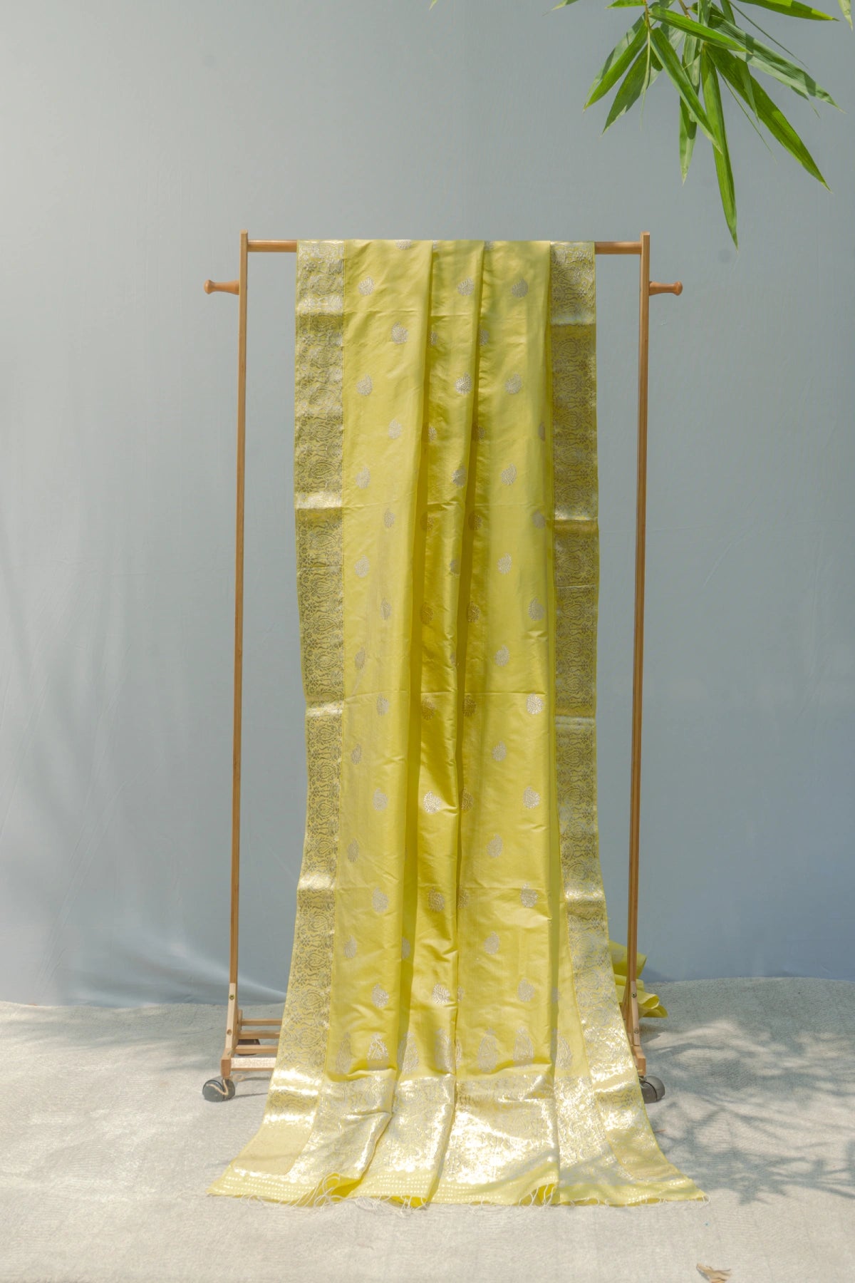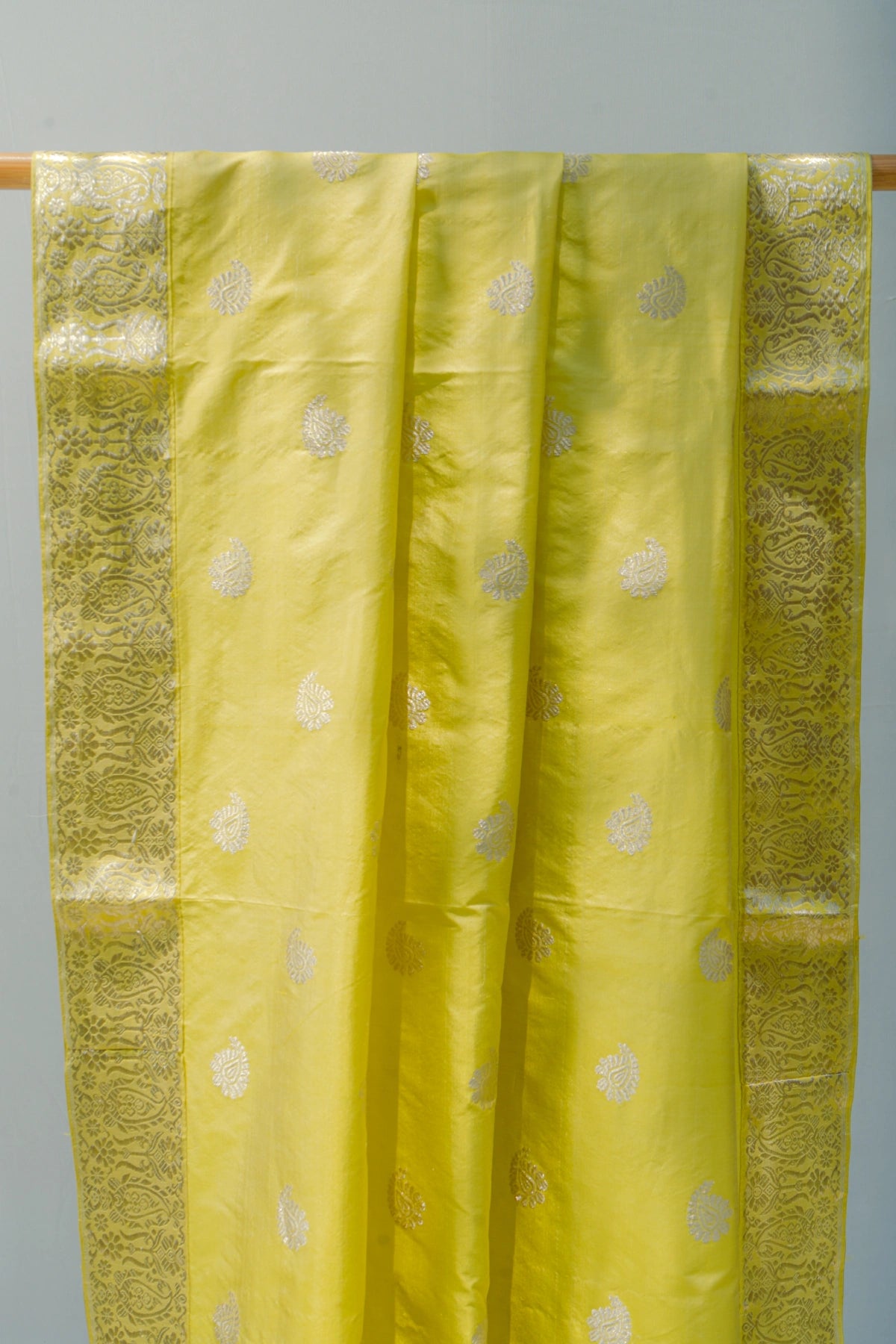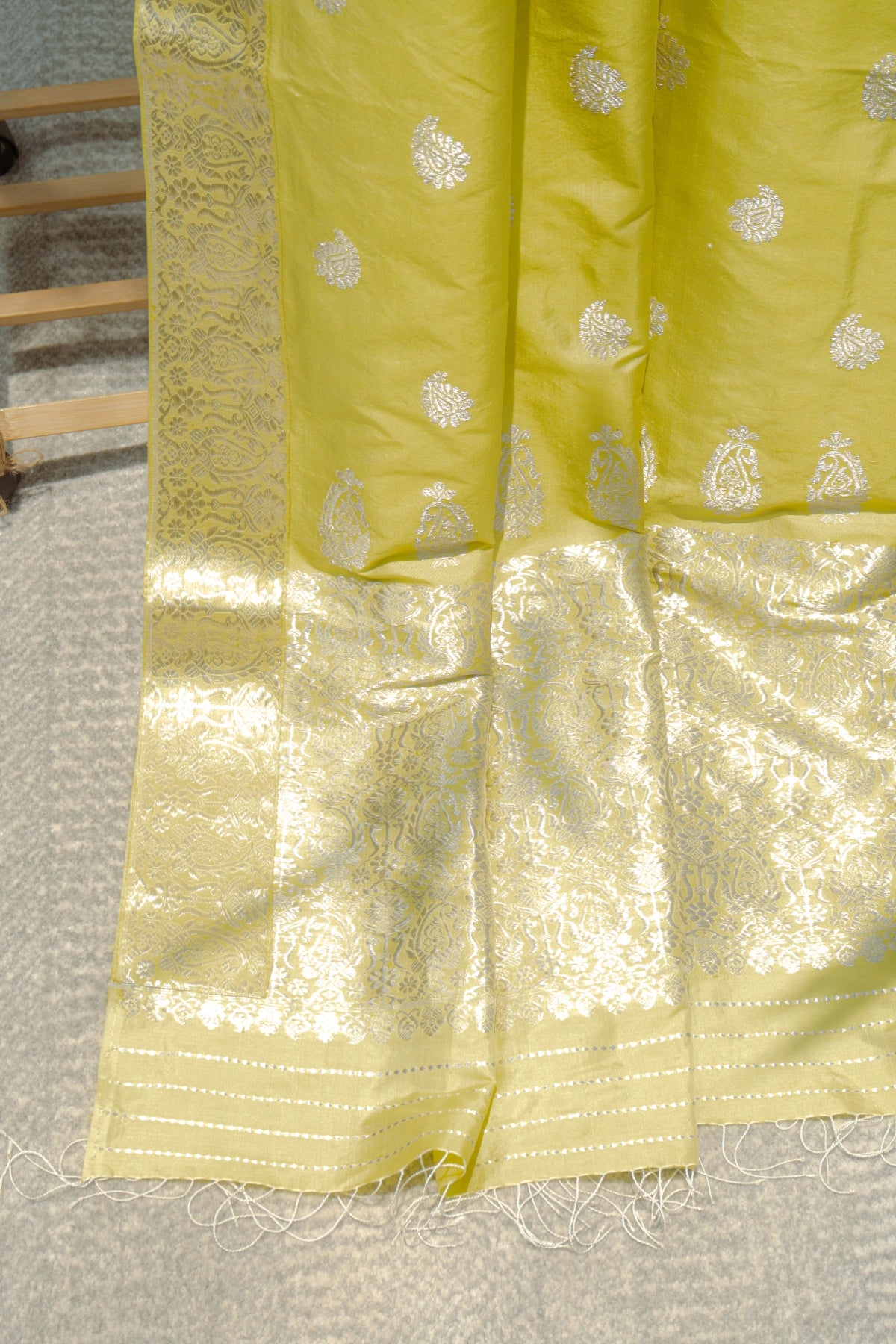 Sangi's pastel yellow paat silk feels like sunlight that's gentle and full of charm. Light silver guna threads shimmer across the body, with graceful kolka phool motifs trailing across the border and aanchal. The design is soft yet striking, with just the right amount of tradition and whimsy.