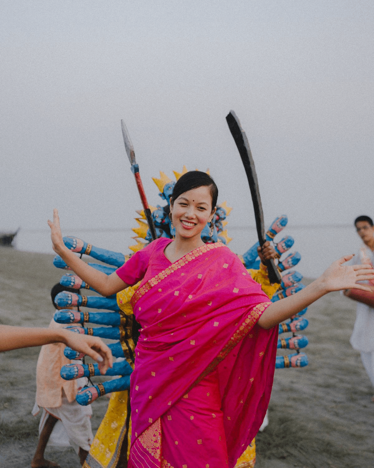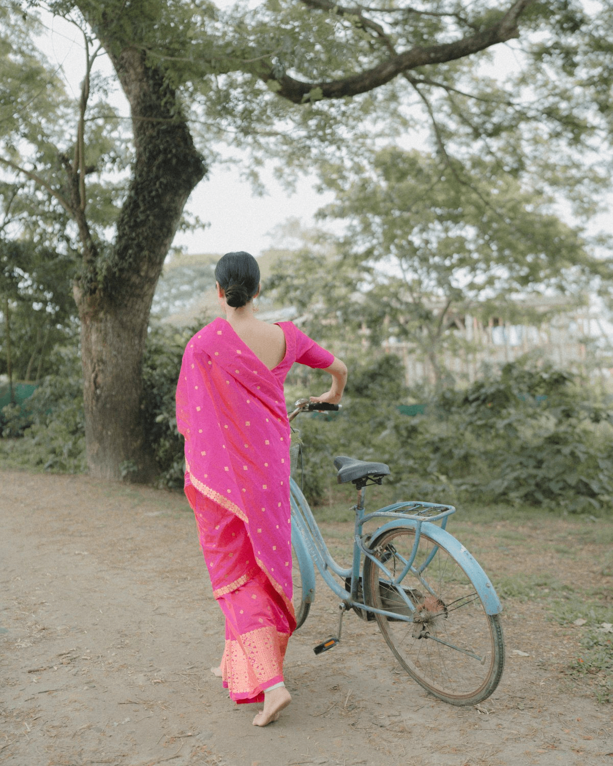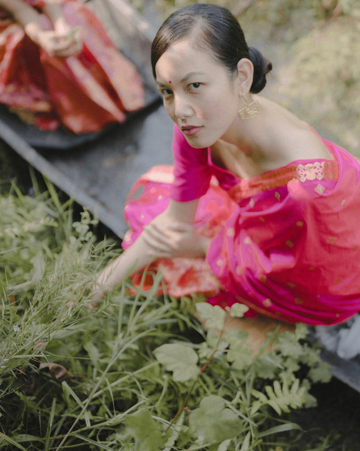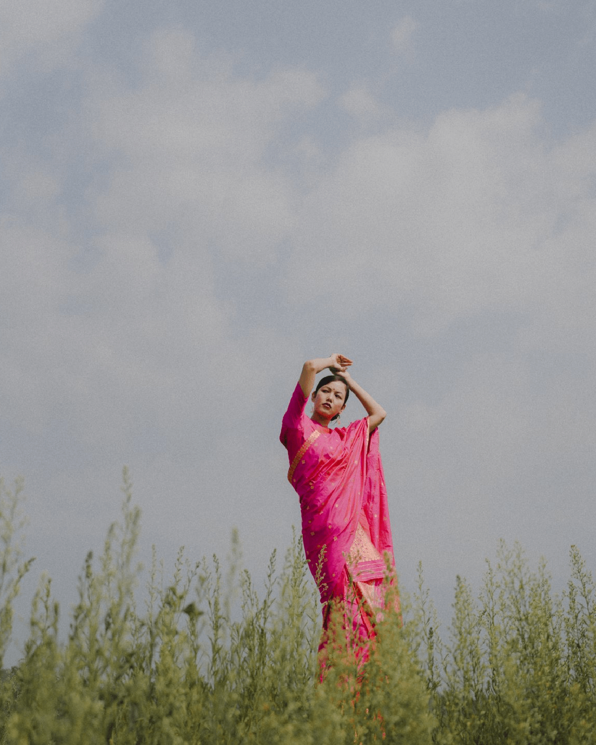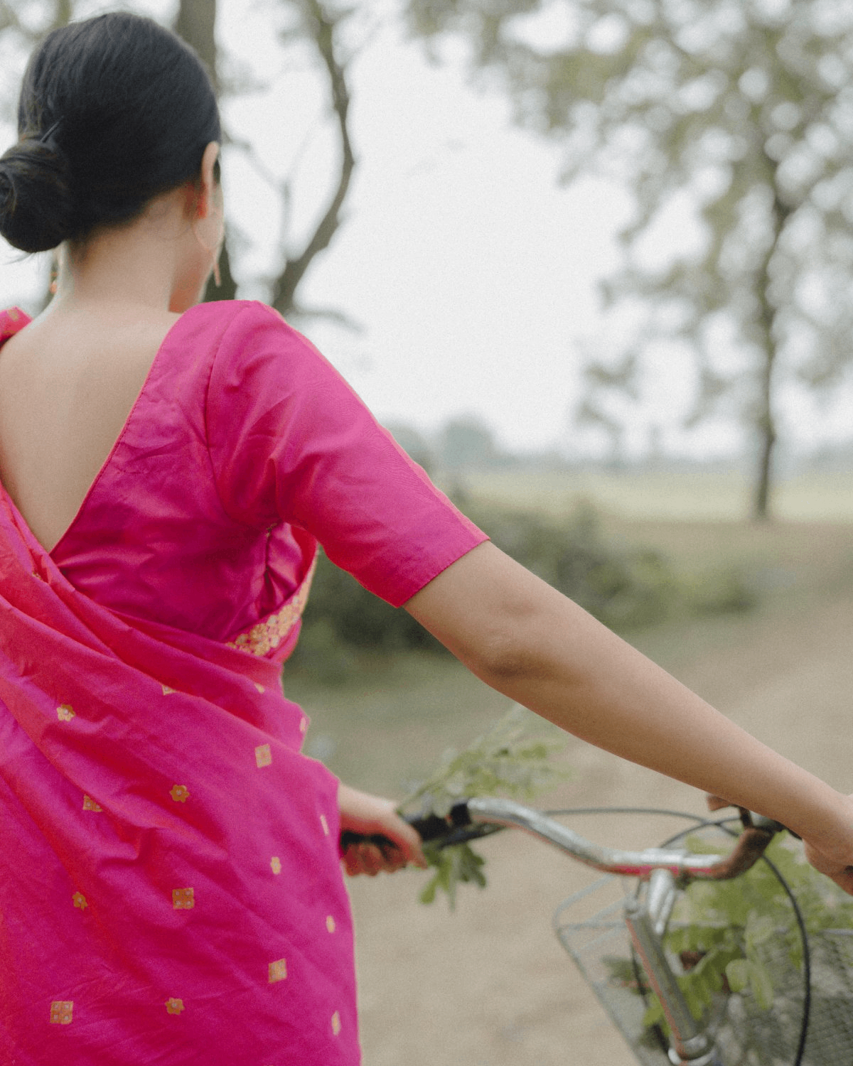 Shyama is Barbie pink, but with a twist. Think red and rani threads blending into the prettiest shade, with gold phool and diamond butas scattered across the body. And that Gaam Khaaru border is a whole vibe.